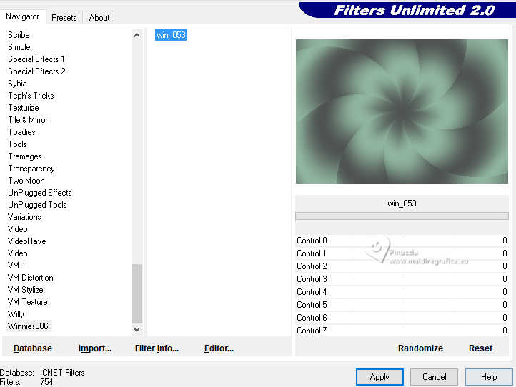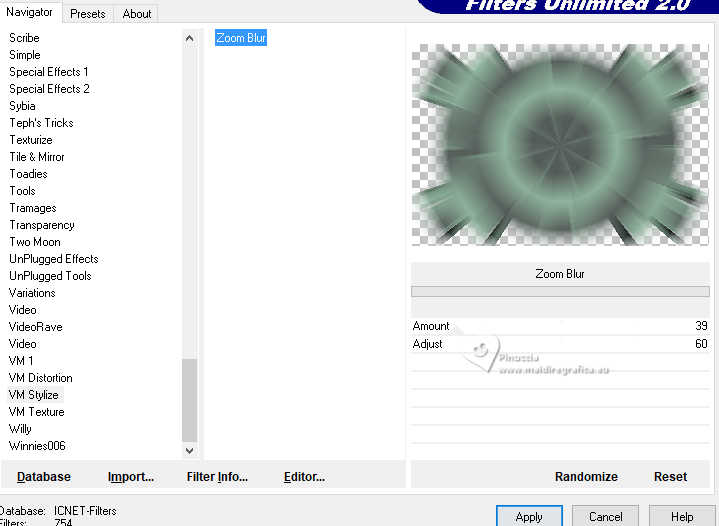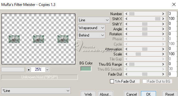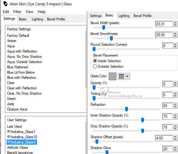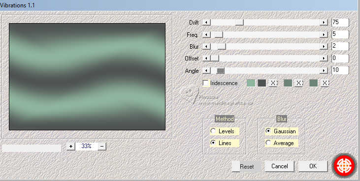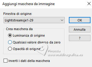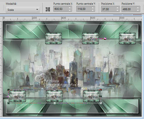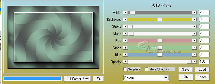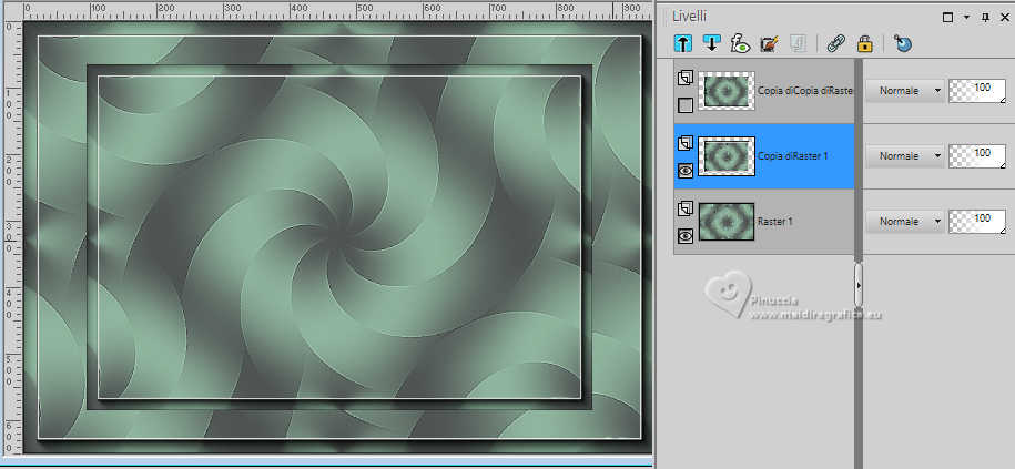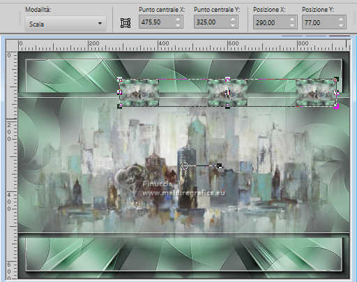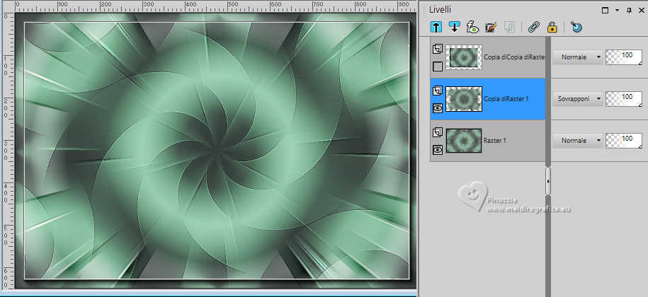 qui puoi trovare qualche risposta ai tuoi dubbi. Se l'argomento che ti interessa non è presente, ti prego di segnalarmelo. Questo tutorial è stato realizzato con PSP2020 e tradotto con PSPX9 ma può essere eseguito anche con le altre versioni di PSP. Dalla versione X4, il comando Immagine>Rifletti è stato sostituito con Immagine>Capovolgi in orizzontale, e il comando Immagine>Capovolgi con Immagine>Capovolgi in verticale. Nelle versioni X5 e X6, le funzioni sono state migliorate rendendo disponibile il menu Oggetti. Con la nuova versione X7, sono tornati Rifletti>Capovolgi, ma con nuove varianti. Vedi la scheda sull'argomento qui traduzione in francese/traduction en français qui/ici traduzione in inglese/english translation qui/here Versioni/Versions qui![]() Occorrente: ![]() Per i tubes grazie AnaRidzi, Yvonne e Luz Cristina. Il resto del materiale è di Yedralina. (in questa pagina trovi i links ai siti dei creatori di tubes) Filtri: se hai problemi con i filtri, consulta la mia sezione filtri qui Filters Unlimited 2.0 qui Alien Skin Eye Candy 5 Impact - Glass qui Mura's Meister - Copies qui VM Stylize - Zoom Blur qui Mehdi - Vibrations 1.1. qui Winnies6 - win_053 qui AAA Frames - Foto Frame qui I filtri VM Stylize e Winnies si possono usare da soli o importati in Filters Unlimited (come fare vedi qui) Se un filtro fornito appare con questa icona ![]() non esitare a cambiare modalità di miscelatura e opacità secondo i colori utilizzati. Nelle ultime versioni di PSP non c'è il gradiente di primo piano/sfondo (Corel_06_029) Puoi usare i gradienti delle versioni precedenti. Trovi i gradienti Corel X qui. Metti il preset Cliccando sul file una o due volte (a seconda delle tue impostazioni), automaticamente il preset si installerà nella cartella corretta. perché uno o due clic vedi qui ![]() Metti il preset Emboss 3 nella cartella Impostazioni predefinite. Apri la maschera in PSP e minimizzala con il resto del materiale. 1. Imposta il colore di primo piano con #4f5453, e il colore di sfondo con #90b59e. ![]() Passa il colore di primo piano a Gradiente di primo piano/sfondo, stile Rettangolare ![]() 2. Apri una nuova immagine trasparente 950 x 650 pixels. Riempi l'immagine trasparente con il gradiente rettangolare.3. Effetti>Plugins>Mehdi - Vibrations 1.1. ![]() 4. Effetti>Plugins>Filters Unlimited 2.0 - Winnies 006 - win_053, con i settaggi standard. ![]() 5. Effetti>Effetti di immagine>Motivo unico, con i settaggi standard. ![]() Effetti>Effetti di bordo>Aumenta di più. 6. Effetti>Plugins>AAA Frames - Foto Frame. ![]() 7. Livelli>Duplica. Immagine>Ridimensiona, all'80%, tutti i livelli non selezionato. 8. Livelli>Duplica. Chiudi questo livello e attiva il livello sottostante dell'originale. ![]() 9. Effetti>Plugins>Filters Unlimited 2.0 - VM Stylize - Zoom Blur, con i settaggi standard. ![]() 10. Cambia la modalità di miscelatura di questo livello in Sovrapponi, o Luce netta, secondo i tuoi colori. ![]() Riapri e attiva il livello superiore. Immagine>Ridimensiona, all'80%, tutti i livelli non selezionato. 11. Effetti>Effetti di immagine>Motivo unico. ![]() 12. Livelli>Nuovo livello raster. Selezione>Seleziona tutto. 13. Apri il misted yld-misted-abstract-cityscape(1) ![]() Modifica>Copia. Torna al tuo lavoro e vai a Modifica>Incolla nella selezione. Selezione>Deseleziona. Facoltativo, secondo il tube utilizzato, attiva lo strumento Puntatore ![]() e adatta il tube nello spazio centrale ![]() Nel mio secondo esempio non l'ho fatto. ![]() Inoltre, nel mio caso ho duplicato il livello del misted, per nascondere o dissimulare le linee visibili sullo sfondo. ![]() 14. Livelli>Unisci>Unisci visibile a nuovo livello. nelle versioni precedenti: Modifica>Copia speciale>Copia Unione. Modifica>Incolla come nuovo livello 15. Immagine>Ridimensiona, al 15%, tutti i livelli non selezionato. Regola>Messa a fuoco>Metti a fuoco. 16. Effetti>Plugins>Mura's Meister - Copies. ![]() 17. Immagine>ridimensiona, all'80%, tutti i livelli non selezionato. 18. Tasto K per attivare lo strumento Puntatore ![]() imposta Posizione X: 290,00 e Posizione Y: 77,00. ![]() 19. Effetti>Plugins>Alien Skin Eye Candy 5 Impact - Glass. Seleziona il preset Glass 4 e ok. ![]() 20. Livelli>Duplica. Imposta Posizione X: 37,00 e Posizione Y: 468,00 ![]() Tasto M per deselezionare lo strumento. Livelli>Unisci>Unisci giù. 21. Imposta il colore di primo piano con il colore bianco. Livelli>Nuovo livello raster. Riempi il livello con il colore bianco.22. Livelli>Nuovo livello maschera>Da immagine. Apri il menu sotto la finestra di origine e vedrai la lista dei files aperti. Seleziona la maschera Lightstreamsje1-29 ![]() Livelli>Unisci>Unisci gruppo. 23. Effetti>Filtro definito dall'utente - seleziona il preset Emboss 3 e ok. ![]() Cambia la modalità di miscelatura di questo livello in Luminanza (esistente), o altro. per il mio esempio ho attivato lo strumento Puntatore ![]() e spinto il nodo inferiore centrale verso l'alto, per ridurre l'altezza della maschera. ![]() Nel mio secondo esempio non l'ho fatto ![]() 24. Attiva lo strumento Penna ![]() Per il mio esempio ho usato la linea di stile ©qua_boules e l'ho aggiunta nel materiale. ![]() Tieni premuto il tasto della maiuscola e traccia una linea diritta in alto a destra. Livelli>Converti in livello raster. Effetti>Effetti 3D>Sfalsa ombra, colore nero. ![]() 25. Livelli>Duplica. Immagine>Rifletti>Rifletti verticalmente (Immagine>Capovolgi). Oggetti>Allinea>Sinistra. Livelli>Unisci>Unisci giù. Ripeti Effetti>Effetti 3D>Sfalsa ombra, colore nero. ![]() Cambia la modalità di miscelatura di questo livello in Luce diffusa. ![]() in alternativa, se hai problemi con lo strumento Penna, apri il tube Deco00337©Yedralina ![]() Modifica>Copia. Torna al tuo lavoro e vai a Modifica>Incolla come nuovo livello. Non spostarlo. 27. Il tube tiene già una piccola ombra, però ne applichiamo un'altra. Effetti>Effetti 3D>Sfalsa ombra, colore nero. ![]() 28. Tasto K per attivare lo strumento 