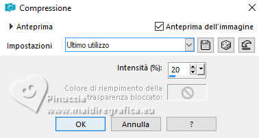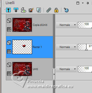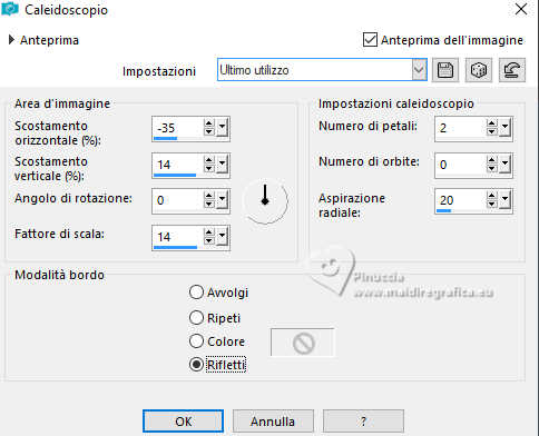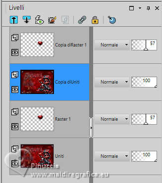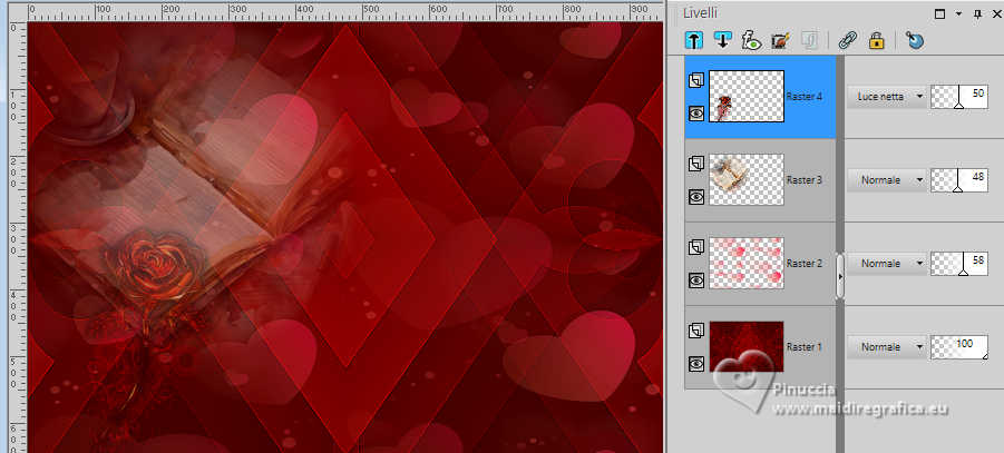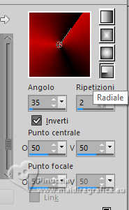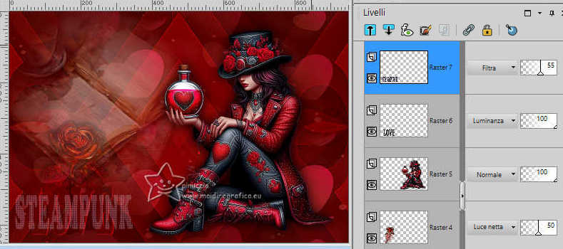 qui puoi trovare qualche risposta ai tuoi dubbi. Se l'argomento che ti interessa non è presente, ti prego di segnalarmelo. Questo tutorial è stato realizzato con PSP2020 e tradotto con PSPX9 ma può essere eseguito anche con le altre versioni di PSP. Dalla versione X4, il comando Immagine>Rifletti è stato sostituito con Immagine>Capovolgi in orizzontale, e il comando Immagine>Capovolgi con Immagine>Capovolgi in verticale. Nelle versioni X5 e X6, le funzioni sono state migliorate rendendo disponibile il menu Oggetti. Con la nuova versione X7, sono tornati Rifletti>Capovolgi, ma con nuove varianti. Vedi la scheda sull'argomento qui traduzione in francese/traduction en français qui/ici traduzione in inglese/english translation qui/here Versioni/Versions qui![]() Occorrente: ![]() Per i tubes grazie AigenbyCaz e Lady Valella. Il resto del materiale è di Yedralina. (in questa pagina trovi i links ai siti dei creatori di tubes) Filtri: se hai problemi con i filtri, consulta la mia sezione filtri qui Filters Unlimited 2.0 qui RCS Filter Pak 1.0 - RCS Triple Exposure qui Carolaine and Sensibility - CS_LDots qui Simple - Left Right Wrap (bonus) qui AAA Frames - Foto Frame qui I filtri RCS e Simple si possono usare da soli o importati in Filters Unlimited (come fare vedi qui) Se un filtro fornito appare con questa icona Animation Shop qui ![]() non esitare a cambiare modalità di miscelatura e opacità secondo i colori utilizzati. Nelle ultime versioni di PSP non c'è il gradiente di primo piano/sfondo (Corel_06_029) Puoi usare i gradienti delle versioni precedenti. Trovi i gradienti Corel X qui. ![]() Metti il preset Emboss 3 nella cartella Impostazioni predefinite. Scegli due colori dal tuo tube principale. 1. Imposta il colore di primo piano con #000000, e il colore di sfondo con #ca0100. ![]() terzo colore #2e2b35 ![]() Passa il colore di primo piano a Gradiente di primo piano/sfondo, stile Radiale. ![]() 2. Apri una nuova immagine trasparente 950 x 650 pixels. Riempi l'immagine trasparente con il gradiente radiale.3. Effetti>Plugins>Filters unlimited 2.0 - RCS Filter Pak 1.0 - RCS TripleExposure. ![]() Ripeti l'Effetto una seconda volta ![]() Effetti>Effetti di bordo>Aumenta di più. 4. Effetti>Plugins>Filters Unlimited 2.0 - Tile & Mirror - Seamless Blend (horizontal). ![]() Effetti>Effetti di riflesso>Specchio rotante. ![]() 5. Effetti>Effetti di riflesso>Caleidoscopio. ![]() 6. Effetti>Plugins>Filters Unlimited 2.0 - Simple - Left Right Wrap. ![]() Se necessario: Regola>Messa a fuoco>Metti a fuoco. 7. Livelli>Nuovo livello raster. Selezione>Seleziona tutto. 8. Apri il tube decorazones ![]() Modifica>Copia. Torna al tuo lavoro e vai a Modifica>Incolla nella selezione. Selezione>Deseleziona. 9. Effetti>Effetti di immagine>Motivo unico, con i settaggi standard. ![]() Abbassa l'opacità di questo livello +/-58% Regola>Messa a fuoco>Accentua messa a fuoco. 10. Apri il misted 00018-MO(A.I.@LValella ![]() Cancella il watermark e vai a Modifica>Copia. Torna al tuo lavoro e vai a Modifica>Incolla come nuovo livello. Immagine>Ridimensiona, 2 volte all'80%, tutti i livelli non selezionato. Sposta il tube a sinistra.![]() Abbassa l'opacità di questo livello +/-48% 11. Apri il tube rosafuego ![]() Modifica>Copia. Torna al tuo lavoro e vai a Modifica>Incolla come nuovo livello. Sposta il tube a tuo piacimento.Cambia la modalità di miscelatura di questo livello in Luce netta, e abbassa l'opacità +/-50%. ![]() 12. Apri il tube principale aigenbycaz_steampunkvalentine20 ![]() Cancella il watermark e vai a Modifica>Copia. Torna al tuo lavoro e vai a Modifica>Incolla come nuovo livello. Immagine>Ridimensiona, al 60%, tutti i livelli non selezionato. Immagine>Rifletti. Sposta il tube a destra, o come preferisci.Effetti>Effetti 3D>sfalsa ombra, a scelta. 13. Attiva lo strumento Testo ![]() font Cooper Black ![]() Regola la dimensione in base al testo e alla tua versione di PSP. Chiudi il colore di primo piano e imposta il colore di sfondo con il colore 3 #2e2b35 ![]() Scrivi LOVE e usa i nodi dello strumento per allargare la scritta a tuo piacimento. Livelli>Converti in livello raster. 14. Effetti>Filtro definito dall'utente - seleziona il preset Emboss 3 e ok. ![]() Cambia la modalità di miscelatura di questo livello in Luminanza. 15. Scrivi STEAMPUNK, usando gli stessi criteri della prima parola. Livelli>Converti in livello raster. Cambia la modalità di miscelatura di questo livello in Filtra. 16. Livelli>Duplica. Abbassa l'opacità di questo livello al 50%. ![]() Livelli>Unisci>Unisci giù. 16. Effetti>Plugins>Carolaine and Sensibility - CS-LDots ![]() Effetti>Effetti di bordo>Dilata. Abbassa l'opacità di questo livello a +/-55%. ![]() 17. Attiva il livello inferiore, Raster 1. Modifica>Copia. Modifica>Incolla come nuova immagine e minimizza questo immagine per il momento. 18. Immagine>Aggiungi bordatura, 1 pixel, simmetriche, colore 2. Immagine>Aggiungi bordatura, 1 pixel, simmetriche, colore 1. Selezione>Seleziona tutto. Immagine>Aggiungi bordatura, 45 pixels, simmetriche, con un colore qualsiasi. Selezione>Inverti. Modifica>Incolla nella selezione (è sempre in memoria l'immagine del punto 17). Regola>Sfocatura>Sfocatura gaussiana - raggio 10 ![]() Effetti>Plugins>AAA Frames - Foto Frame. ![]() 19. Effetti>Effetti 3D>Sfalsa ombra, colore nero. ![]() Selezione>Deseleziona. 20. Apri il tube Deco00336©Yedralina ![]() Modifica>Copia. Torna al tuo lavoro e vai a Modifica>Incolla come nuovo livello. Non è necessario spostarlo. Se preferisci, puoi cambiare il colore per adattarlo al tuo lavoro 21. Immagine>Ridimensiona, 1000 pixels di larghezza, tutti i livelli selezionato. Firma l tuo lavoro su un nuovo livello. Se non vuoi realizzare l'animazione: Livelli>Unisci>Unisci tutto e salva in formato jpg. 22. Se vuoi realizzare l'animazione, continua. Mantieni i livelli uniti. Livelli>Duplica. 23. Apri il tube per l'animazione 2508©Yedralina ![]() Cancella il watermark e vai a Modifica>Copia. Torna al 