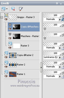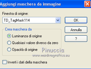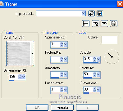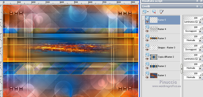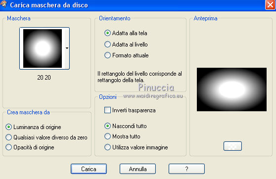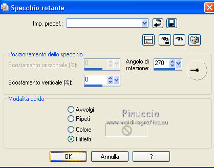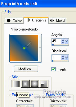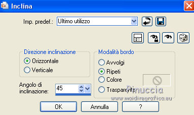 qui puoi trovare qualche risposta ai tuoi dubbi. Se l'argomento che ti interessa non è presente, ti prego di segnalarmelo. Questo tutorial è stato realizzato con Corel19 e tradotto con CorelX7, CorelX2 e CorelX3, ma può essere realizzato anche con le altre versioni di PSP. Dalla versione X4, il comando Immagine>Rifletti è stato sostituito con Immagine>Capovolgi in orizzontale, e il comando Immagine>Capovolgi con Immagine>Capovolgi in verticale. Nelle versioni X5 e X6, le funzioni sono state migliorate rendendo disponibile il menu Oggetti. Con la nuova versione X7, sono tornati Rifletti>Capovolgi, ma con nuove varianti. Vedi la scheda sull'argomento qui traduzione in francese/traduction en français qui/icitraduzione in inglese/english translation qui/hereVersioni/Versions qui Occorrente: Un tube a scelta. Il resto del materiale qui Per il tube usato e non fornito grazie SYL (SvB1102). Immagine trovata su Internet. Maschera di TD (TD_TagMask114) Deco di Yedralina (Deco00253©Yedralina. (in questa pagina trovi i links ai siti dei creatori di tubes) Filtri: se hai problemi con i filtri, consulta la mia sezione filtri qui Filters Unlimited 2.0 qui Mura's Seamless - Emboss at Alpha qui Mehdi - Sorting Tiles qui Lokas Software - Aqua qui AAA Filters - AAA Framer qui AAA Filters - Custom qui I filtri Mura's Seamless si possono usare da soli o importati in Filters Unlimited (come fare vedi qui) Se un filtro fornito appare con questa icona ![]() non esitare a cambiare modalità di miscelatura e opacità secondo i colori utilizzati. Nelle ultime versioni di PSP non c'è il gradiente di primo piano/sfondo (Corel_06_029) Puoi usare i gradienti delle versioni precedenti. Trovi qui i gradienti Corel X. La trama Corel_15_017, o Grana lunga intensa, è standard in PSP e corrisponde alla tram Se non la trovi nel tuo PSP, metti quella fornita nella cartella Trame. Metti la selezione nella cartella Selezioni. Metti la maschera 20-20 nella cartella Trame. Apri la seconda maschera in PSP e minimizzala con il resto del materiale. 1. Imposta il colore di primo piano con #014f91, e il colore di sfondo con il colore #fd8604. ![]() Passa il colore di primo piano a Gradiente di primo piano/sfondo, stile Lineare. ![]() Apri una nuova immagine trasparente 950 x 650 pixels. Selezione>Seleziona tutto. Apri l'immagine in jpg e vai a Modifica>Copia. Torna al tuo lavoro e vai a Modifica>Incolla nella selezione. Selezione>Deseleziona. Regola>Sfocatura>Sfocatura gaussiana - raggio 50. ![]() Effetti>Effetti di immagine>Motivo unico. ![]() 2. Livelli>Nuovo livello raster. Riempi il livello con il gradiente.Effetti>Plugins>Mehdi - Sorting Tiles. ![]() Effetti>Effetti di bordo>Aumenta di più. Immagine>Ridimensiona, al 50%, tutti i livelli non selezionato. Effetti>Effetti geometrici>Inclina. ![]() Effetti>Effetti di immagine>Motivo unico. ![]() 3. Livelli>Duplica. Immagine>Rifletti. Cambia la modalità di miscelatura di questo livello in Luce diffusa. Livelli>Unisci>Unisci giù. Effetti>Effetti di bordo>Aumenta di più. Livelli>Duplica. 4. Effetti>Effetti di immagine>Motivo unico. ![]() Immagine>Capovolgi. Effetti>Effetti di riflesso>Specchio rotante. ![]() Cambia la modalità di miscelatura di questo livello in Luminanza (esistente) 5. Imposta il colore di primo piano con il colore bianco. Livelli>Nuovo livello raster. Riempi con il colore bianco.Livelli>Nuovo livello maschera>Da immagine. Apri il menu sotto la finestra di origine e vedrai la lista dei files aperti. Seleziona la maschera TD_TagMask114. ![]() Livelli>Duplica. ![]() Livelli>Unisci>Unisci gruppo. Livelli>Duplica. Immagine>Rifletti. Immagine>Capovolgi. Livelli>Unisci>Unisci giù. Effetti>Effetti di immagine>Motivo unico. ![]() Effetti>Plugins>Mura's Seamless - Emboss at alpha, con i settaggi standard. ![]() Cambia la modalità di miscelatura di questo livello in Sovrapponi. 6. Livelli>Nuovo livello raster. Attiva lo strumento Selezione ![]() (non importa il tipo di selezione impostato, perchè con la selezione personalizzata si ottiene sempre un rettangolo) clicca sull'icona Selezione personalizzata ![]() e imposta i seguenti settaggi. ![]() Riporta il colore di primo piano al colore (#014f91) e al gradiente iniziali ![]() Riempi la selezione con il gradiente.Effetti>Effetti di trama>Trama - seleziona la trama Corel_15_017, o Grana lunga intensa. ![]() Selezione>Modifica>Contrai - 30 pixels. Riempi di nuovo con il gradiente.7. Attiva nuovamente l'immagine in jpg. Su questa immagine: Livelli>Carica/Salva maschera>Carica maschera da disco. Cerca e carica la maschera 20-20 ![]() Livelli>Duplica. Livelli>Unisci>Unisci gruppo. 8. Modifica>Copia. Torna al tuo lavoro e vai a Modifica>Incolla nella selezione. Selezione>Inverti. Effetti>Effetti 3D>Sfalsa ombra, colore nero. ![]() Selezione>Deseleziona. Effetti>Effetti 3D>Sfalsa ombra, con i settaggi precedenti. 9. Apri il tube Deco00253©Yedralina e vai a Modifica>Copia. Torna al tuo lavoro e vai a Modifica>Incolla come nuovo livello. Effetti>Effetti 3D>Sfalsa ombra, con i settaggi precedenti. Cambia la modalità di miscelatura di questo livello in Sovrapponi. 10. Livelli>Nuovo livello raster. Selezione>Carica/Salva selezione>Carica selezione da disco. Cerca e carica la selezione Sel650 ![]() Riempi la selezione con un colore qualsiasi.Effetti>Plugins>Lokas Software - Aqua - colore di primo piano. ![]() Selezione>Deseleziona. Cambia la modalità di miscelatura di questo livello in Luminanza (esistente). ![]() 11. Livelli>Unisci>Unisci visibile. 12. Selezione>Seleziona tutto. Modifica>Copia. Immagine>Aggiungi bordatura, 50 pixels, simmetriche, con un colore qualsiasi. Selezione>Inverti. Modifica>Incolla nella selezione. Regola>Sfocatura>Sfocatura radiale. ![]() Effetti>Plugins>AAA Filters - AAA Framer ![]() Selezione>Inverti. Effetti>Effetti 3D>Sfalsa ombra, colore nero. ![]() Selezione>Deseleziona. 13. Facoltativo: Effetti>Plugins>AAA Filters - Custom - Landscape. ![]() 14. Apri il tuo tube e vai a Modifica>Copia. Tor