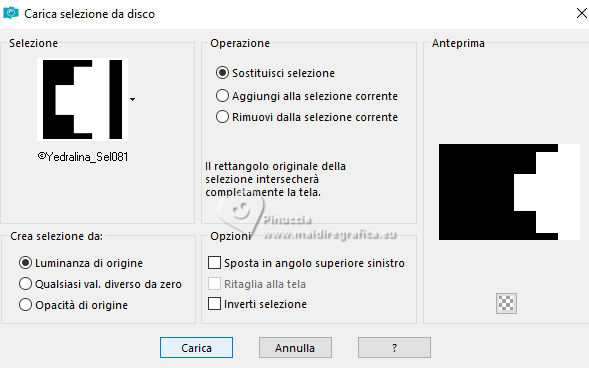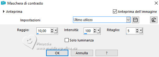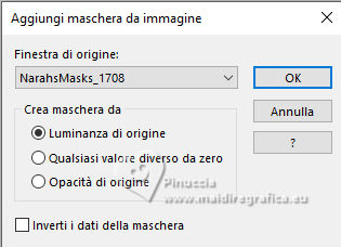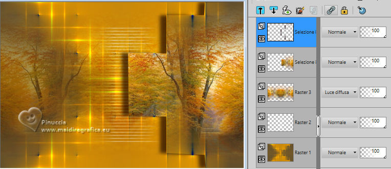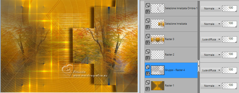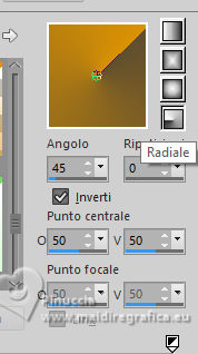 qui puoi trovare qualche risposta ai tuoi dubbi. Se l'argomento che ti interessa non è presente, ti prego di segtiempodecambiormelo. Questo tutorial è stato realizzato con PSP2020 e tradotto con PSPX7, ma può essere eseguito anche con le altre versioni di PSP. Dalla versione X4, il comando Immagine>Rifletti è stato sostituito con Immagine>Capovolgi in orizzontale, e il comando Immagine>Capovolgi con Immagine>Capovolgi in verticale. Nelle versioni X5 e X6, le funzioni sono state migliorate rendendo disponibile il menu Oggetti. Con la nuova versione X7, sono tornati Rifletti>Capovolgi, ma con nuove varianti. Vedi la scheda sull'argomento qui traduzione in francese/traduction en français qui/ici traduzione in inglese/english translation qui/here Versioni/Versions qui![]() Occorrente: ![]() Grazie per il tube Gabry e per la maschera Narah. Il resto del materiale è di Yedralina. (in questa pagina trovi i links ai siti dei creatori di tubes) ![]() se hai problemi con i filtri, consulta la mia sezione filtri qui Mehdi - Weaver qui FM Tile Tools - Blend Emboss qui ![]() non esitare a cambiare modalità di miscelatura e opacità secondo i colori utilizzati. Nelle ultime versioni di PSP non c'è il gradiente di primo piano/sfondo (Corel_06_029) Puoi usare i gradienti delle versioni precedenti. Trovi i gradienti Corel X qui. ![]() Metti il pennello nella cartella Pennelli. Attenzione, il pennello è composto da due files che non devono essere separati. Vedi le note sui pennelli qui Metti la selezione nella cartella Selezioni. Apri la maschera in PSP e minimizzala con il resto del materiale. 1. Imposta il colore di primo piano con #da9205, e il colore di sfondo con #5f4e2f. ![]() colore 3 #ffffff Passa il colore di primo piano a Gradiente di primo piano/sfondo, stile Radiale. ![]() 2. Apri una nuova immagine trasparente 950 x 650 pixels. Riempi l'immagine trasparente con il gradiente.3. Effetti>Plugins>Mehdi - Weaver ![]() 4. Ripeti Effetti>Plugins>Mehdi - Weaver - 50 ![]() 5. Effetti>Effetti di riflesso>Specchio rotante. ![]() 6. Effetti>Effetti di riflesso>Specchio rotante, con i settaggi standard. ![]() 7. Effetti>Effetti di bordo>Aumenta di più. 8. Di nuovo: Effetti>Plugins>Mehdi - Weaver ![]() 9. Immagine>Capovolgi. 10. Effetti>Effetti di riflesso>Specchio rotante. ![]() 11. Regola>Messa a fuoco>Maschera di contrasto. ![]() 12. Apri il tube Deco0122©Yedralina ![]() Modifica>Copia. Torna al tuo lavoro e vai a Modifica>Incolla come nuovo livello. E' al suo posto. 13. Livelli>Nuovo livello raster. Selezione>Seleziona tutto. 14. Apri il misted 2181©Yedralina ![]() Cancella il watermark e vai a Modifica>Copia. Torna al tuo lavoro e vai a Modifica>Incolla nella selezione. Selezione>Deseleziona. 15. Effetti>Effetti di immagine>Motivo unico. ![]() 16. Cambia la modalità di miscelatura di questo livello in Luce diffusa, o abbassa l'opacità +/- 50%, secondo i colori del tube. FACOLTATIVO: Effetti>Effetti di riflesso>Specchio rotante, con i settaggi standard. 17. Rimani su questo livello. Selezione>Carica/Salva Selezione>Carica selezione da disco. Cerca e carica la selezione ©Yedralina_Sel081 ![]() Selezione>Innalza selezione a livello e mantieni selezionato. 18. Effetti>Effetti 3D>Sfalsa ombra, colore nero, ombra su nuovo livello selezionato. ![]() 19. Livelli>Disponi>Sposta su. Selezione>Deseleziona. ![]() 20. Imposta il colore di primo piano con il colore bianco #ffffff. Livelli>Nuovo livello raster. Riempi il livello con il colore bianco.21. Livelli>Nuovo livello maschera>Da immagine. Apri il menu sotto la finestra di origine e vedrai la lista dei files aperti. Seleziona la maschera NarahsMasks_1708 ![]() Livelli>Unisci>Unisci gruppo. Immagine>Capovolgi. 22. Effetti>Plugins>FM Tile Tools - Blend Emboss, con i settaggi standard. ![]() 23. Effetti>Effetti 3D>Sfalsa ombra, colore nero, ombra su nuovo livello non selezionato. ![]() 24. Cambia la modalità di miscelatura di questo livello in Luce diffusa, o Sovrapponi, secondo i colori della tua immagine. 25. Sposta questo livello sopra il livello di sfondo, Raster 1. ![]() 26. Attiva il livello di sfondo. Modifica>Copia. Modifica>Incolla come nuova immagine, e minimizza questa immagine. 27. Immagine>Aggiungi bordatura, 1 pixel, simmetriche, colore 1 #da9205. 28. Selezione>Seleziona tutto. Immagine>Aggiungi bordatura, 20 pixels, simmetriche, di nuovo con il colore 1 #da9205. 29. Effetti>Effetti 3D>Sfalsa ombra, colore nero. ![]() 30. Immagine>Aggiungi bordatura, 1 pixel, simmetriche, colore di sfondo #5f4e2f. 31. Selezione>Seleziona tutto. Immagine>Aggiungi bordatura, 45 pixels simmetriche, con un colore qualsiasi. Selezione>Inverti. 32. Modifica>Incolla nella selezione (l'immagine copiata al punto 26 è sempre in memoria). 33. Regola>Sfocatura>Sfocatura gaussiana, raggio 15. ![]() 34. Effetti>Effetti di riflesso>Specchio rotante. ![]() Selezione>Deseleziona. 35. Apri il tube della foglia 2343©Yedralina ![]() Cancella il watermark e vai a Modifica>Copia. Torna al tuo lavoro e vai a Modifica>Incolla come nuovo livello. Immagine>Ridimensiona, 2 volte al 60%, tutti i livelli non selezionato. Immagine>Rifletti. Sposta il tube a destra.36. Effetti>Effetti 3D>Sfalsa ombra, colore nero. ![]() 37. Apri Deco00286©Yedralina ![]() Modifica>Copia. Torna al tuo lavoro e vai a Modifica>Incolla come nuovo livello. E' al suo posto. 38. Cambia la modalità di miscelatura di questo livello in Luminanza. 39. Livelli>Nuovo livello raster. Attiva lo strumento Pennello ![]() Cerca e seleziona il pennello agiBrush0234_autumn ![]() Applica il pennello cliccando con il tasto destro del mouse per usare il colore di sfondo #5f4e2f. 40. Apri il tube Gabry-woman97-202233 ![]() Modifica>Copia. Torna al tuo lavoro e vai a Modifica>Incolla come nuovo livello. Immagine>Ridimensiona, al 95%, tutti i livelli non selezionato. Immagine>Rifletti. Sposta il tube a sinistra.41. Effetti>Effetti 3D>Sfalsa ombra, a scelta; per l'esempio: ![]() 42. Immagine>Ridimensiona, 1000 pixels di