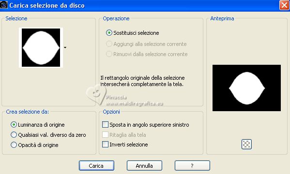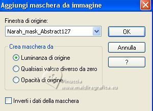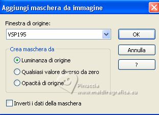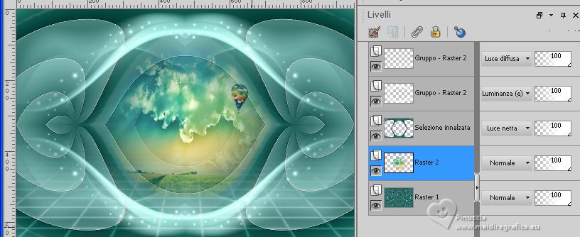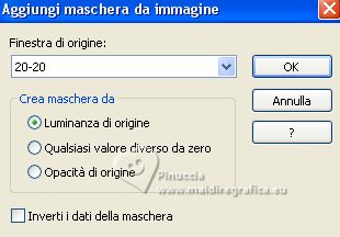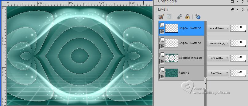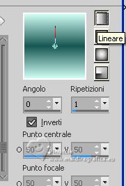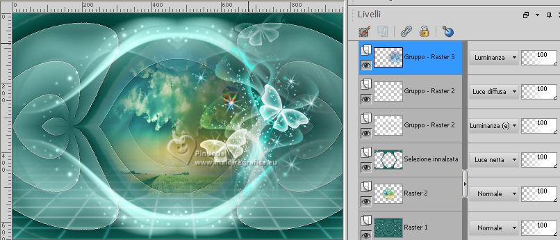 qui puoi trovare qualche risposta ai tuoi dubbi. Se l'argomento che ti interessa non è presente, ti prego di segtodosetrasformarmelo. Questo tutorial è stato realizzato con PSP2020 e tradotto con PSPX7, ma può essere eseguito anche con le altre versioni di PSP. Dalla versione X4, il comando Immagine>Rifletti è stato sostituito con Immagine>Capovolgi in orizzontale, e il comando Immagine>Capovolgi con Immagine>Capovolgi in verticale. Nelle versioni X5 e X6, le funzioni sono state migliorate rendendo disponibile il menu Oggetti. Con la nuova versione X7, sono tornati Rifletti>Capovolgi, ma con nuove varianti. Vedi la scheda sull'argomento qui traduzione in francese/traduction en français qui/ici traduzione in inglese/english translation qui/here Versioni/Versions qui![]() Occorrente: ![]() Grazie: per i tubes grazie Coly, LisaT, Silvie, e per le maschere Narah e Valy (in questa pagina trovi i links ai siti dei creatori di tubes) ![]() se hai problemi con i filtri, consulta la mia sezione filtri qui Filters Unlimited 2.0 qui Winnies - win_53, win_54 qui Simple - Top Left Mirror qui I filtri Simple e Winnies si possono usare da soli o importati in Filters Unlimited (come fare vedi qui) Se un filtro fornito appare con questa icona ![]() non esitare a cambiare modalità di miscelatura e opacità secondo i colori utilizzati. Nelle ultime versioni di PSP non c'è il gradiente di primo piano/sfondo (Corel_06_029) Puoi usare i gradienti delle versioni precedenti. Trovi i gradienti Corel X qui. ![]() Metti le selezioni nella cartella Selezioni. Apri le maschere in PSP e minimizzale con il resto del materiale. 1. Imposta il colore di primo piano con #175752, e il colore di sfondo con #cffcf3. ![]() Passa il colore di primo piano a Gradiente di primo piano/sfondo, stile Rettangolare. ![]() 2. Apri una nuova immagine trasparente 950 x 650 pixels. Riempi l'immagine trasparente con il gradiente.3. Effetti>Plugins>Filters Unlimited 2.0 - Winnie006 - win_53, con i settaggi standard. ![]() 4. Effetti>Plugins>Filters Unlimited 2.0 - Winnie006 - win_54, con i settaggi standard. ![]() 5. Immagine>Capovolgi. Effetti>Effetti di riflesso>Specchio rotante. ![]() Effetti>Effetti di bordo>Aumenta di più. 6. Selezione>Carica/Salva selezione>Carica selezione da disco. Cerca e carica la selezione ©Yedralina_Sel071 ![]() Selezione>Innalza selezione a livello. 7. Cambia la modalità di miscelatura di questo livello in Luce netta. Selezione>Deseleziona. 8. Imposta il colore di primo piano con il colore bianco #ffffff. Livelli>Nuovo livello raster. Riempi il livello con il colore bianco.9. Livelli>Nuovo livello maschera>Da immagine. Apri il menu sotto la finestra di origine e vedrai la lista dei files aperti. Seleziona la maschera Narah_mask_Abstract127 ![]() Livelli>Unisci>Unisci gruppo. 10. Immagine>Capovolgi. 11. Effetti>Effetti di riflesso>Specchio rotante, con i settaggi precedenti. ![]() 12. Effetti>Plugins>Simple - Top Left Mirror. ![]() 13. Cambia la modalità di miscelatura di questo livello in Luminanza (esistente). 14. Livelli>Nuovo livello raster. Riempi il livello con il colore bianco.15. Livelli>Nuovo livello maschera>Da immagine. Apri il menu sotto la finestra di origine e seleziona la maschera VSP195 ![]() Livelli>Unisci>Unisci gruppo. 16. Cambia la modalità di miscelatura di questo livello in Luce diffusa. ![]() 17. Attiva il livello di sfondo, Raster 1. Livelli>Nuovo livello raster. 18. Selezione>Carica/Salva selezione>Carica selezione da disco. Cerca e carica la selezione ©Yedralina_Sel072 ![]() 19. Apri il misted paysages_0405_lisat ![]() Cancella il watermark e vai a Modifica>Copia. Torna al tuo lavoro e vai a Modifica>Incolla nella selezione. Selezione>Deseleziona. Regola>Messa a fuoco>Metti a fuoco. ![]() 20. Attiva il livello superiore. Apri il tube Glowing_Butterflys364_Silvie_10.11.21 ![]() Modifica>Copia. Torna al tuo lavoro e vai a Modifica>Incolla come nuovo livello. Immagine>Ridimensiona, all'80%, tutti i livelli non selezionato. 21. Livelli>Nuovo livello maschera>Da immagine. Apri il menu sotto la finestra di origine e seleziona la maschera 20-20 ![]() Livelli>Duplica. Livelli>Unisci>Unisci gruppo. 22. Tasto K per attivare lo strumento Puntatore ![]() e imposta Posizione X: 422,00 e Posizione Y: -34,00 ![]() Tasto M per deselezionare lo strumento. 23. Cambia la modalità di miscelatura di questo livello in Luminanza. ![]() 24. Apri il tube principale femme659-coly ![]() Cancella il watermark e vai a Modifica>Copia. Torna al tuo lavoro e vai a Modifica>Incolla come nuovo livello. Immagine>Ridimensiona, 1 volta all'80% e 1 volta al 90%, tutti i livelli non selezionato. Posiziona correttamente il tube.Effetti>Effetti 3D>Sfalsa ombra, a scelta. 25. Per i bordi, imposta nuovamente il colore di primo piano con #175752. ![]() Immagine>Aggiungi bordatura, 1 pixel, simmetriche, colore di sfondo. Immagine>Aggiungi bordatura, 3 pixels, simmetriche, colore di primo piano. Immagine>Aggiungi bordatura, 1 pixel, simmetriche, colore di sfondo. Selezione>Seleziona tutto. 26. Immagine>Aggiungi bordatura, 15 pixels, simmetriche, colore di primo piano. Selezione>Inverti. 27. Attiva lo strumento Contagocce ![]() e clicca con il tasto destro del mouse (per impostarlo come colore di sfondo), sul colore che preferisci dal livello della maschera. ![]() 28. Con il nuovo colore di sfondo, Passa il colore di primo piano a Gradiente di primo piano/sfondo, stile Lineare. ![]() Riempi la selezione con il gradiente.Selezione>Deseleziona. 28. Immagine>Aggiungi bordatura, 1 pixel, simmetriche, colore di sfondo. Immagine>Aggiungi bordatura, 3 pixels, simmetriche, colore di primo piano. Immagine>Aggiungi brodatura, 1 pixel, simmetriche, colore di sfondo. Selezione>Seleziona tutto. 29. Immagine>Aggiungi bordatura, 30 pixels, simmetriche, colore di primo piano. Selezione>Inverti. 30. Inverti i colori del gradiente. ![]() Riempi la selezione con il gradiente.Selezione>Deseleziona. 31. Immagine>Aggiungi bordatura, 1 pixel