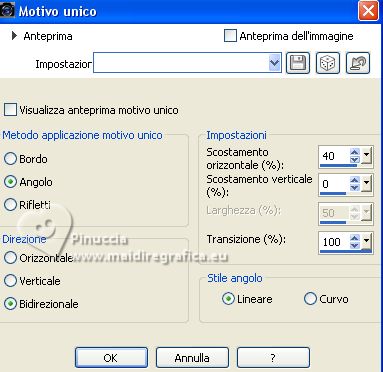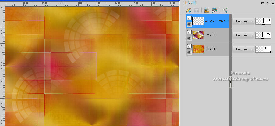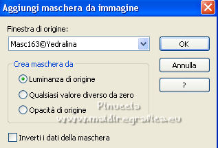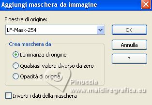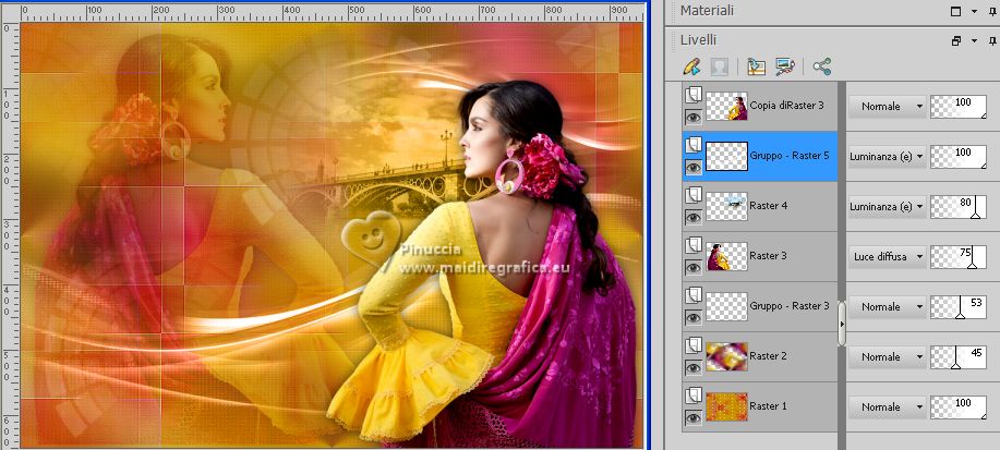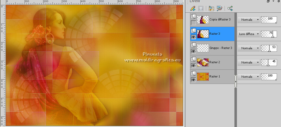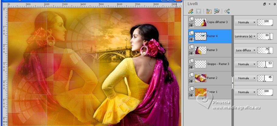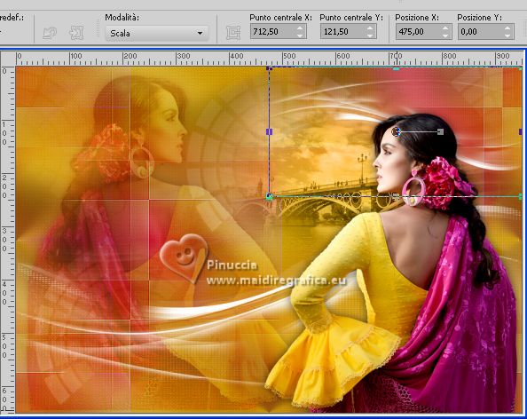 qui puoi trovare qualche risposta ai tuoi dubbi. Se l'argomento che ti interessa non è presente, ti prego di segnalarmelo. Questo tutorial è stato realizzato con PSP2020 e tradotto con PSPX7 e PSPX2, ma può essere eseguito anche con le altre versioni di PSP. Dalla versione X4, il comando Immagine>Rifletti è stato sostituito con Immagine>Capovolgi in orizzontale, e il comando Immagine>Capovolgi con Immagine>Capovolgi in verticale. Nelle versioni X5 e X6, le funzioni sono state migliorate rendendo disponibile il menu Oggetti. Con la nuova versione X7, sono tornati Rifletti>Capovolgi, ma con nuove varianti. Vedi la scheda sull'argomento qui traduzione in francese/traduction en français qui/ici traduzione in inglese/english translation qui/here Versioni/Versions quiOccorrente: Un tube a scelta. ![]() Grazie per il tube della donna Grisi e per una maschera Linda. Il resto del materiale è di ©Yedralina (in questa pagina trovi i links ai siti dei creatori di tubes) ![]() se hai problemi con i filtri, consulta la mia sezione filtri qui Carolaine and Sensibility - CS_LDots qui Mehdi - Sorting Tiles qui AAA Frames - Foto Frame qui ![]() non esitare a cambiare modalità di miscelatura e opacità secondo i colori utilizzati. Nelle ultime versioni di PSP non c'è il gradiente di primo piano/sfondo (Corel_06_029) Puoi usare i gradienti delle versioni precedenti. Trovi i gradienti Corel X qui. ![]() Apri le maschere in PSP e minimizzale con il resto del materiale. Imposta il colore di primo piano con #ca9803, e il colore di sfondo con #c0045b. ![]() Prepara il colore di primo piano con un Gradiente di primo piano/sfondo, stile Rettangolare. ![]() 1. Apri una nuova immagine trasparente 950 x 650 pixels. Riempi l'immagine trasparente con il gradiente Rettangolare.2. Effetti>Plugins>Mehdi - Sorting Tiles. ![]() 3. Effetti>Effetti di immagine>Motivo unico. ![]() 4. Effetti>Effetti di riflesso>Specchio rotante. ![]() 5. Effetti>Effetti di immagine>Motivo unico, con i settaggi precedenti. ![]() Effetti>Effetti di bordo>Aumenta di più. 6. Livelli>Nuovo livello raster. Selezione>Seleziona tutto. Apri il tube principale Grisi_Tube_Flamenco_057 ![]() Modifica>Copia. Torna al tuo lavoro e vai a Modifica>Incolla nella selezione. Selezione>Deseleziona. 7. Regola>Sfocatura>Sfocatura gaussiana - raggio 25. ![]() Effetti>Effetti di immagine>Motivo unico, con i settaggi standard. ![]() Attiva il livello di sfondo, Raster 1. 8. Effetti>Plugins>Carolaine and Sensibility - CS-LDots. ![]() Regola>Messa a fuoco>Accentua messa a fuoco. 9. Attiva nuovamente il livello superiore, Raster 2. Abbassa l'opacità di questo livello +/-45%. 10. Imposta il colore di primo piano con il colore bianco. ![]() Livelli>Nuovo livello raster. Abbassa l'opacità dello strumento Riempimento a +/-45%. ![]() Riempi il livello con il colore bianco.(non dimenticare di riportare l'opacità dello strumento Riempimento a 100). 11. Livelli>Nuovo livello maschera>Da immagine. Apri il menu sotto la finestra di origine e vedrai la lista dei files aperti. Seleziona la maschera Masc163©Yedralina.jpg ![]() Livelli>Unisci>Unisci gruppo. Secondo i tuoi colori, puoi abbassare l'opacità di questo livello +/- 53% ![]() 12. Modifica>Incolla come nuovo livello (il tube principale è sempre in memoria). Immagine>Ridimensiona, se necessario, nel mio caso al 75%, tutti i livelli non selezionato. 13. Livelli>Duplica. Chiudi questo livello e torna al livello sottostante dell'originale. 14. Effetti>Effetti 3D>Sfalsa ombra, colore nero. ![]() Abbassa l'opacità di questo livello +/- 75%. Posiziona correttamente l'immagine: tasto K per attivare lo strumento Puntatore ![]() e imposta Posizione X: 0,00 e Posizione Y: 1,00. ![]() Tasto M per deselezionare lo strumento. Cambia la modalità di miscelatura di questo livello in Luce diffusa. ![]() 15. Riapri e attiva il livello superiore. Se necessario, ridimensiona ancora, per l'esempio al 90%, tutti i livelli non selezionato. Sposta il tube a destra.![]() Effetti>Effetti 3D>Sfalsa ombra, con i settaggi precedenti. 16. Apri il misted 2329©Yedralina ![]() Cancella il watermark e vai a Modifica>Copia. Torna al tuo lavoro e vai a Modifica>Incolla come nuovo livello. Immagine>Ridimensiona, se necessario, per l'esempio al 60%, tutti i livelli non selezionato. Livelli>Disponi>Sposta giù. 17. Immagine>Rifletti. Oggetti>Allinea>Destra. Oggetti>Allinea>Superiore. Oppure tasto K per attivare lo strumento Puntatore ![]() e imposta Posizione X: 336,00 e Posizione Y: 0,00. ![]() Tasto M per deselezionare lo strumento. 18. Cambia la modalità di miscelatura di questo livello in Luminanza (esistente), o come preferisci, e abbassa l'opacità all'80%, se necessario. ![]() 19. Livelli>Nuovo livello raster. Riempi il livello con il colore bianco.Livelli>Nuovo livello maschera>Da immagine. Apri il menu sotto la finestra di origine e seleziona la maschera LF-Mask-254 ![]() Livelli>Duplica. Livelli>Unisci>Unisci gruppo. Immagine>Capovolgi. Livelli>Duplica. 21. Immagine>Ridimensiona, al 50%, tutti i livelli non selezionato. Immagine>Capovolgi. Oggetti>Allinea>Destra. Oggetti>Allinea>Superiore. Oppure tasto K per attivare lo strumento Puntatore ![]() e imposta Posizione X: 475,00 e Posizione Y: 0,00. ![]() Tasto M per deselezionare lo strumento. 22. Livelli>Unisci>Unisci giù. Cambia la modalità di miscelatura di questo livello in Luminanza (esistente), o come preferisci. ![]() 23. Attiva il livello superiore. Apri il testo Text Triana ![]() Modifica>Copia. Torna al tuo lavoro e vai a Modifica>Incolla come nuovo livello. Tasto K per attivare lo strumento Puntatore ![]() e imposta Posizione X: 100,00 e Posizione Y: 323,00. ![]() Tasto M per deselezionare lo strumento. 24. Riporta il colore di primo piano al colore iniziale #ca9803. ![]() Passa il colore di primo piano a Gradiente di primo piano/sfondo, stile Lineare. ![]() Immagine>Aggiungi bordatura, 2 pixels, simmetriche, colore di sfondo. Selezione>Seleziona tutto. 25. Immagine>Aggiungi 