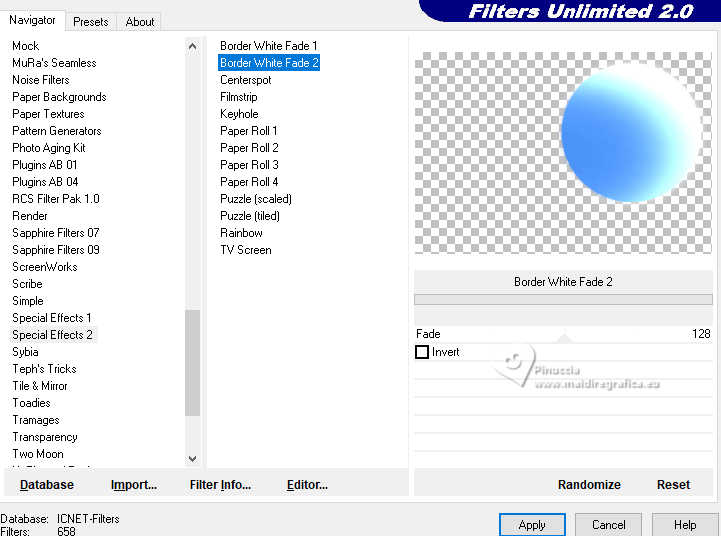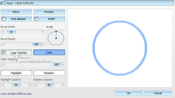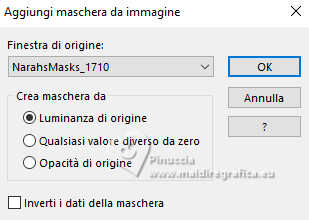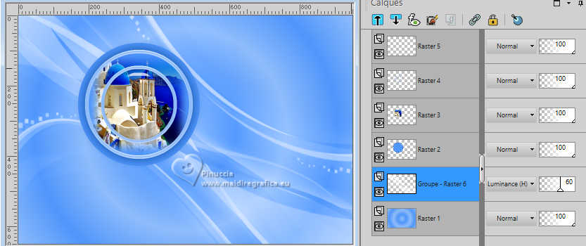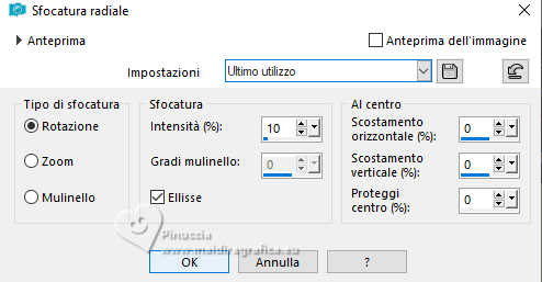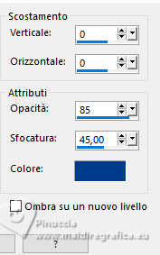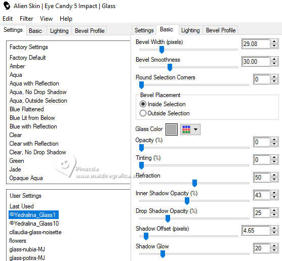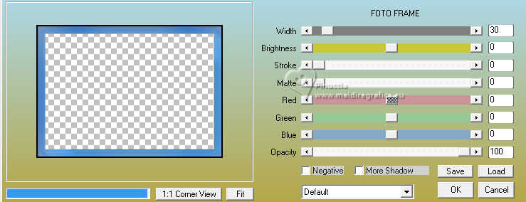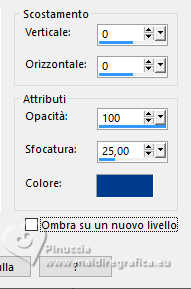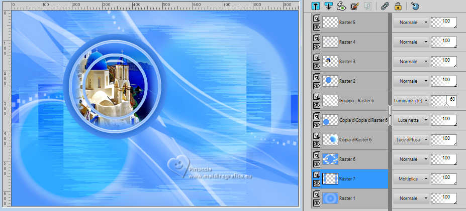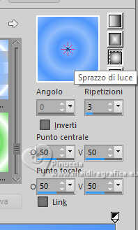 qui puoi trovare qualche risposta ai tuoi dubbi. Se l'argomento che ti interessa non è presente, ti prego di segundialavezrmelo. Questo tutorial è stato realizzato con PSP2020 e tradotto con PSPX9 e PSP2020, ma può essere eseguito anche con le altre versioni di PSP. Dalla versione X4, il comando Immagine>Rifletti è stato sostituito con Immagine>Capovolgi in orizzontale, e il comando Immagine>Capovolgi con Immagine>Capovolgi in verticale. Nelle versioni X5 e X6, le funzioni sono state migliorate rendendo disponibile il menu Oggetti. Con la nuova versione X7, sono tornati Rifletti>Capovolgi, ma con nuove varianti. Vedi la scheda sull'argomento qui traduzione in francese/traduction en français qui/ici traduzione in inglese/english translation qui/here Versioni/Versions qui![]() Occorrente: ![]() Grazie per i tubes Vera Mendes e Sonia e per la maschera Narah. Il resto del materiale è di Yedralina. (in questa pagina trovi i links ai siti dei creatori di tubes) ![]() se hai problemi con i filtri, consulta la mia sezione filtri qui Filters Unlimited 2.0 qui VanDerLee - Unplugged-X qui Lokas Artistics - Aqua qui Alien Skin Eye Candy 5 Impact - Glass qui AAA Frames - Foto Frame qui ![]() non esitare a cambiare modalità di miscelatura e opacità secondo i colori utilizzati. Nelle ultime versioni di PSP non c'è il gradiente di primo piano/sfondo (Corel_06_029) Puoi usare i gradienti delle versioni precedenti. Trovi i gradienti Corel X qui. Metti il preset Cliccando sul file una o due volte (a seconda delle tue impostazioni), automaticamente il preset si installerà nella cartella corretta. perché uno o due clic vedi qui ![]() 1. Imposta il colore di primo piano con #8fbcfb, e il colore di sfondo con #4f96fb. ![]() Passa il colore di primo piano un Gradiente di primo piano/sfondo, stile Sprazzo di luce. ![]() 2. Apri CanalAlpha_UN DIA A LA VEZ. Finestra>Duplica o sulla tastiera maiuscola+D per fare una copia. ![]() Chiudi l'originale. La copia, che sarà la base del tuo lavoro, non é vuota, ma contiene le selezioni salvate sul canale alfa Riempi l'immagine trasparente con il gradiente.3. Livelli>Nuovo livello raster. Selezione>Carica/Salva selezione>Carica selezione da canale alfa. La selezione #1 é subito disponibile. Devi soltanto cliccare Carica. ![]() Riempi la selezione con il colore di sfondo.4. Selezione>Modifica>Contrai - 20 pixels. Effetti>Effetti 3D>Sfalsa ombra, colore #033c8d. ![]() 5. Passa il colore di primo piano a Colore. Riempi la selezione con il colore di primo piano.6. Selezione>Modifica>Contrai - 10 pixels. Riempi la selezione con il colore di sfondo.7. Livelli>Nuovo livello raster. Apri il misted SoniaTubes_1084_23 ![]() Modifica>Copia. Torna al tuo lavoro e vai a Modifica>Incolla nella selezione. 8. Livelli>Nuovo livello raster. Selezione>Modifica>Contrai - 35 pixels. Riempi la selezione con il colore di primo piano.9. Selezione>Modifica>Contrai - 10 pixels. Premi sulla tastiera il tasto CANC .10. Livelli>Nuovo livello raster. Effetti>Plugins>Alien Skin Eye Candy 5 Impact - Glass. Seleziona il preset ©Yedralina_Glass1 ![]() Selezione>Deseleziona. 11. Attiva il livello sottostante, Raster 4. Attiva lo strumento Bacchetta magica , tolleranza e sfumatura 0,e clicca nel piccolo bordo per selezionarlo (non esitare a ingrandire l'immagine per vedere meglio) ![]() 12. Effetti>Plugins>Lokas Software - Aqua Color overlay: colore di primo piano #8fbcfb Highlight color: colore bianco. ![]() Selezione>Deseleziona. 13. Attiva il livello della cornice esterna, Raster 2. Seleziona il bordo con la bacchetta magica ![]() Ripeti Effetti>Plugins>Lokas Software - Aqua, con i settaggi precedenti. Selezione>Deseleziona. 14. Attiva il livello di sfondo. Imposta il colore di primo piano con il colore bianco. Livelli>Nuovo livello raster. Riempi il livello con il colore bianco.15. Livelli>Nuovo livello maschera>Da immagine. Apri il menu sotto la finestra di origine e vedrai la lista dei files aperti. Seleziona la maschera NarahsMasks_1710 ![]() Livelli>Duplica. Livelli>Unisci>Unisci gruppo. 16. Immagine>Rifletti. Cambia la modalità di miscelatura di questo livello in Luminanza (esistente). (per il mio esempio ho anche abbassato l'opacità al 60%) ![]() 17. Attiva nuovamente il livello di sfondo. Livelli>Nuovo livello raster. Selezione>Carica/Salva selezione>Carica selezione da canale alfa. Apri il menu delle selezioni e carica la selezione #2. ![]() Riempi la selezione con il colore scuro di sfondo.Selezione>Deseleziona. 18. Livelli>Duplica. Immagine>Ridimensiona, all'80%, tutti i livelli non selezionato. 19. Effetti>Effetti 3D>Sfalsa ombra, con i settaggi precedenti. ![]() 20. Oggetti>Allinea>Superiore. Oggetti>Allinea>Destra, o attiva lo strumento Puntatore (K) ![]() ![]() Cambia la modalità di miscelatura di questo livello in Luce diffusa. 21. Livelli>Duplica. Immagine>Ridimensiona, all'80%, tutti i livelli non selezionato. 22. Oggetti>Allinea>Inferiore. Oggetti>Allinea>Sinistra. Strumento Puntatore ![]() ![]() Cambia la modalità di miscelatura di questo livello in Luce netta. Strumento Puntatore ![]() ![]() 23. Regola>Sfocatura>Sfocatura radiale. ![]() per il mio esempio, ho aggiunto: Effetti>Effetti 3D>Sfalsa ombra, con i settaggi precedenti, ma colore bianco. ![]() 24. Attiva il livello sottostante, Copia di Raster 6. Effetti>Plugins>Filters Unlimited 2.0 - Special Effects 2 - Border White Fade 2, con i settaggi standard. ![]() 25. Regola>Sfocatura>Sfocatura radiale, con i settaggi precedenti. ![]() 27. Attiva il livello del cerchio centrale, Raster 6. Effetti>Plugins>VanDerLee - Unplugged-X - Distortion. ![]() 28. Effetti>Effetti di immagine>Motivo unico, con i settaggi standard. ![]() Regola>Messa a fuoco>Metti a fuoco. 29. Apri Deco00314©Yedralina ![]() Modifica>Copia. Torna al tuo lavoro e vai a Modifica>Incolla come nuovo livello. Non è necessario spostarlo. 30. Cambia il colore del tube in armonia con il tuo colore di sfondo. Per il mio esempio ho usato lo strumento Cambia