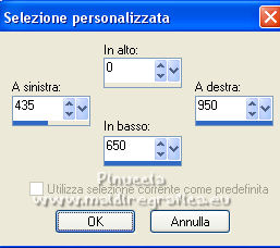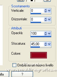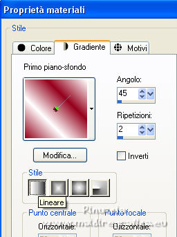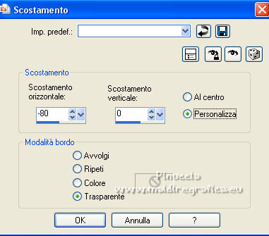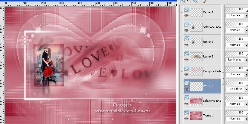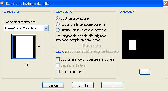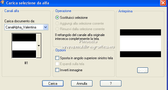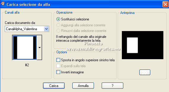 qui puoi trovare qualche risposta ai tuoi dubbi. Se l'argomento che ti interessa non è presente, ti prego di segnalarmelo. Questo tutorial è stato realizzato con Corel19 e tradotto con CorelX7, CorelX2 e CorelX3, ma può essere eseguito anche con le altre versioni di PSP. Dalla versione X4, il comando Immagine>Rifletti è stato sostituito con Immagine>Capovolgi in orizzontale, e il comando Immagine>Capovolgi con Immagine>Capovolgi in verticale. Nelle versioni X5 e X6, le funzioni sono state migliorate rendendo disponibile il menu Oggetti. Con la nuova versione X7, sono tornati Rifletti>Capovolgi, ma con nuove varianti. Vedi la scheda sull'argomento qui traduzione in francese/traduction en français qui/icitraduzione in inglese/english translation qui/here Versioni/Versions quiOccorrente: Tubes a scelta Il resto del materiale qui Per i tubes usati e non forniti grazie Nikita (156914731092_femmes_nikita), Kad (KaD_MistedPeople1) e VPC (VPC_LoveRibbon). Per la maschera grazie Franie Margot (masque_19_franiemargot). Il resto del materiale è di Yedralina (in questa pagina trovi i links ai siti dei creatori di tubes) Filtri: se hai problemi con i filtri, consulta la mia sezione filtri qui Filters Unlimited 2.0 qui Mehdi - Sorting Tiles qui Mura's Meister - Cloud qui Mura's Meister - Perspective Tiling qui Embossworks - Hard Glass, Soft Glass qui Toadies - What are you qui Funhouse - Loom qui VM Extravaganza - Transmission qui AAA Frames - Foto Frame qui I filtri Embossworks, Toadies, Funhouse e Extravaganza si possono usare da soli o importati in Filters Unlimited (come fare vedi qui) Se un filtro fornito appare con questa icona ![]() non esitare a cambiare modalità di miscelatura e opacità secondo i colori utilizzati. Nelle ultime versioni di PSP non c'è il gradiente di primo piano/sfondo (Corel_06_029) Puoi usare i gradienti delle versioni precedenti. Trovi qui i gradienti Corel X. ![]() Apri la maschera in PSP e minimizzala con il resto del materiale. Imposta il colore di primo piano con #95011c, e il colore di sfondo con #ffffff. ![]() Passa il colore di primo piano a Gradiente di primo piano/sfondo, stile Lineare. ![]() 1. Apri CanalAlpha_Valentina. Finestra>Duplica o sulla tastiera maiuscola+D per fare una copia. ![]() Chiudi l'originale. La copia, che sarà la base del tuo lavoro, non è vuota, ma contiene le selezioni salvate sul canale alfa. Effetti>Plugins>Mura's Meister - Cloud, con i settaggi standard. ![]() Ricorda che questo filtro lavora con i colori impostati nella paletta dei materiali, ma tiene in memoria il primo settaggio dall'apertura del programma. Quindi se hai già usato il filtro, per essere sicuro di avere impostati i colori corretti, premi il tasto Reset. Il risultato dell'effetto è casuale, per questo non sarà uguale al mio. Puoi cambiare l'aspetto delle nuvole cliccando sulla finestra di anteprima, finché non sei soddisfatto del risultato 2. Effetti>Plugins>Mehdi - Sorting Tiles. ![]() 3. Effetti>Plugins>Filters Unlimited 2.0 - Embossworks - Hard Glass, con i settaggi standard. ![]() 4. Effetti>Plugins>Toadies - What are you, con i settaggi standard. ![]() 5. Effetti>Plugins>Filters Unlimited 2.0 - Funhouse - Loom, con i settaggi standard. ![]() 6. Effetti>Plugins>Filters Unlimited 2.0 - Embossworks - Soft Glass, con i settaggi standard. ![]() 7. Apri il tube Deco00284©Yedralina e vai a Modifica>Copia. Torna al tuo lavoro e vai a Modifica>Incolla come nuovo livello. Effetti>Effetti di immagine>Scostamento. ![]() 8. Attiva il livello di sfondo. Livelli>Nuovo livello raster. Selezione>Carica/Salva selezione>Carica selezione da canale alfa. La selezione #1 è subito disponibile. Devi soltanto cliccare Carica. ![]() Selezione>Innalza selezione a livello. 9. Regola>Sfocatura>Sfocatura gaussiana - raggio 15. ![]() Selezione>Deseleziona. 10. Effetti>Plugins>VM Extravaganza - Transmission. ![]() Effetti>Effetti di bordo>Aumenta di più. 11. Livelli>Nuovo livello raster. Riempi il livello con il colore bianco.12. Livelli>Nuovo livello maschera>Da immagine. Apri il menu sotto la finestra di origine e vedrai la lista dei files aperti. Seleziona la maschera masque_19_franiemargot. ![]() Livelli>Duplica. Livelli>Unisci>Unisci gruppo. 13. Attiva lo strumento Selezione ![]() (non importa il tipo di selezione impostato, perchè con la selezione personalizzata si ottiene sempre un rettangolo) clicca sull'icona Selezione personalizzata ![]() e imposta i seguenti settaggi. ![]() Premi sulla tastiera il tasto CANC ![]() Selezione>Deseleziona. 14. Livelli>Duplica. Immagine>Rifletti. Effetti>Effetti di immagine>Scostamento. ![]() 15. Livelli>Unisci>Unisci giù. Tasto K sulla tastiera per attivare lo strumento Puntatore ![]() e imposta Posizione X: 40,00 e mantieni Posizione Y: 0,00. ![]() Effetti>Effetti di bordo>Aumenta. Effetti>Effetti 3D>Sfalsa ombra, colore scuro. ![]() 16. Apri il tube decorativo (per l'esempio VPC_LoveRibbon) e vai a Modifica>Copia. Torna al tuo lavoro e vai a Modifica>Incolla come nuovo livello. Cambia la modalità di miscelatura di questo livello in Luce diffusa, Luminanza, o come preferisci. puoi anche utilizzare il tube che hai scelto per la cornice a sinistra 17. Selezione>Carica/Salva selezione>Carica selezione da canale alfa. Apri il menu delle selezioni e carica la selezione #2. ![]() Livelli>Nuovo livello raster. Apri il tuo misted e vai a Modifica>Copia. Torna al tuo lavoro e vai a Modifica>Incolla nella selezione. Rimani su questo livello. 18. Selezione>Carica/Salva selezione>Carica selezione da canale alfa. Apri il menu delle selezioni e carica la selezione #3. ![]() Selezione>Innalza selezione a livello. Selezione>Inverti. Effetti>Effetti 3D>Sfalsa ombra, colore scuro di primo piano. ![]() Selezione>Deseleziona. 19. Attiva il livello sottostante, Raster 3. Regola>Sfocatura>Sfocatura gaussiana - raggio 5. ![]() 20. Apri il tube deco 201 e vai a Modifica>Copia. Torna al tuo lavoro e vai a Modifica>Incolla come nuovo livello. Non è necessario 