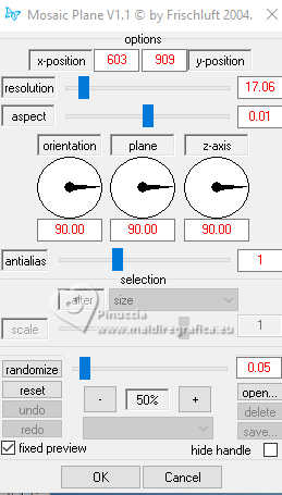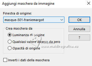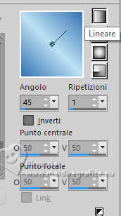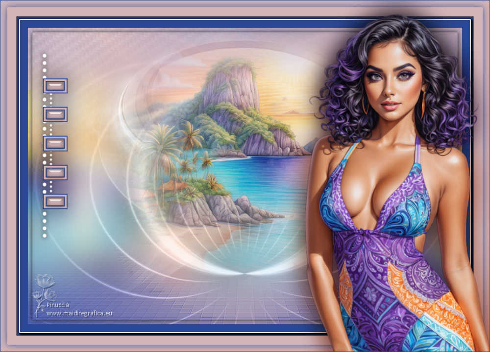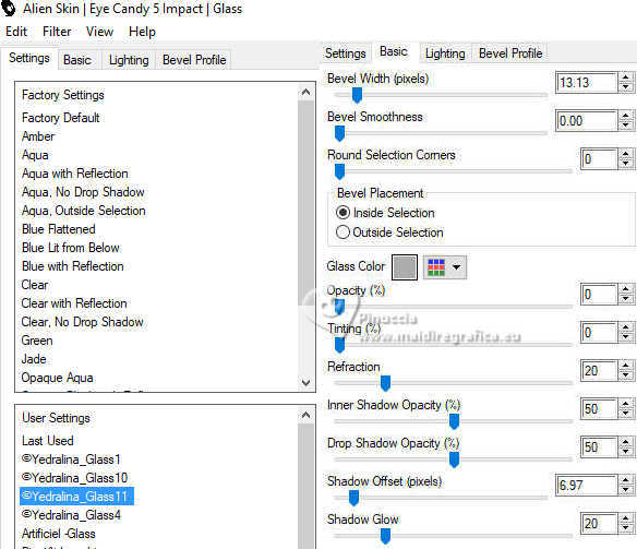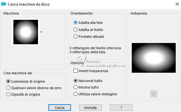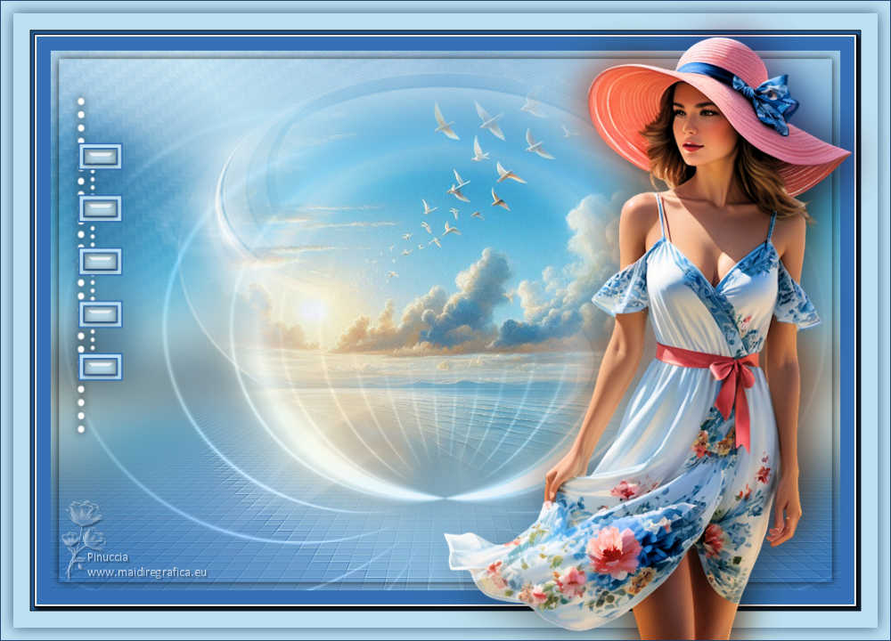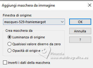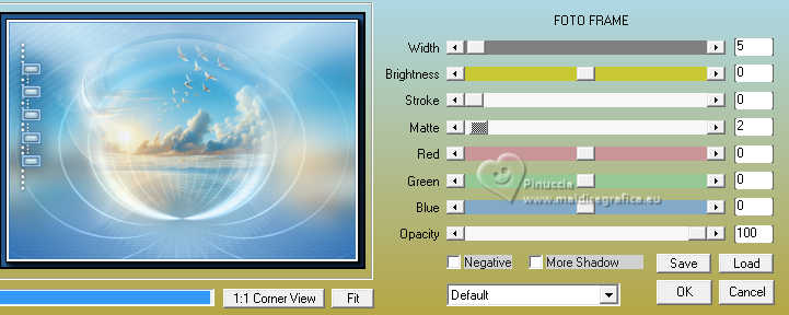 qui puoi trovare qualche risposta ai tuoi dubbi. Se l'argomento che ti interessa non è presente, ti prego di segnalarmelo. Questo tutorial è stato realizzato con PSP2020 e tradotto con PSPX9 e PSP2020, ma può essere eseguito anche con le altre versioni di PSP. Dalla versione X4, il comando Immagine>Rifletti è stato sostituito con Immagine>Capovolgi in orizzontale, e il comando Immagine>Capovolgi con Immagine>Capovolgi in verticale. Nelle versioni X5 e X6, le funzioni sono state migliorate rendendo disponibile il menu Oggetti. Con la nuova versione X7, sono tornati Rifletti>Capovolgi, ma con nuove varianti. Vedi la scheda sull'argomento qui traduzione in francese/traduction en français qui/ici traduzione in inglese/english translation qui/here Versioni/Versions qui![]() Occorrente: ![]() Grazie per i tubes Virginia e Cat, per le maschere Franie Margot Il resto del materiale è di Yedralina. (in questa pagina trovi i links ai siti dei creatori di tubes) Filtri: se hai problemi con i filtri, consulta la mia sezione filtri qui Frischluft - Mosaic Plan qui AAA Frames - Foto Frame qui ![]() non esitare a cambiare modalità di miscelatura e opacità secondo i colori utilizzati. Nelle ultime versioni di PSP non c'è il gradiente di primo piano/sfondo (Corel_06_029) Puoi usare i gradienti delle versioni precedenti. Trovi qui i gradienti Corel X. Metti il preset Cliccando sul file una o due volte (a seconda delle tue impostazioni), automaticamente il preset si installerà nella cartella corretta. ![]() Metti il preset Emboss 3 nella cartella Impostazioni predefinite. Metti la selezione nella cartella Selezioni. Metti la maschera 20-20 nella cartella Maschere. Apri le altre maschere in PSP e minimizzale con il resto del materiale. 1. Imposta il colore di primo piano con #3571b4, e il colore di sfondo con #bce1f2. ![]() Passa il colore di primo piano a Gradiente di primo piano/sfondo, stile Lineare. ![]() 2. Apri una nuova immagine trasparente 950 x 650 pixels. Riempi l'immagine trasparente con il gradiente.3. Effetti>Effetti geometrici>Sfera. ![]() 4. Effetti>Plugins>Frischluft - Mosaic Plane ![]() Effetti>Effetti di bordo>Aumenta di più. 5. Effetti>Effetti di riflesso>Specchio rotante. ![]() Regola>Messa a fuoco>Accentua messa a fuoco. 6. Apri il misted 2024 07 26 Cat mist N14 ![]() Cancella il watermark e vai a Modifica>Copia. Torna al tuo lavoro e vai a Modifica>Incolla come nuovo livello. 7. Livelli>Carica/Salva maschera>Carica maschera da disco. Cerca e carica la maschera 20-20 ![]() Livelli>Unisci>Unisci gruppo. Se necessario, cambia la dimensione del tube. Nel mio caso all'85%, tutti i livelli non selezionato. Se ridimensioni, Regola>Messa a fuoco>Metti a fuoco. Per il momento, lascialo come sta. Lo posizionerai più tardi. 8. Livelli>Duplica. Selezione>Seleziona tutto. 9. Modifica>Incolla nella selezione - il misted è sempre in memoria. Selezione>Deseleziona. 10. Effetti>Effetti di immagine>Motivo unico. ![]() 11. Regola>Sfocatura>Sfocatura gaussiana - raggio 25. ![]() Livelli>Disponi>Sposta giù. 12. Imposta il colore di primo piano con il colore bianco. ![]() Livelli>Nuovo livello raster. Riempi il livello con il colore bianco.13. Livelli>Nuovo livello maschera>Da immagine. Apri il menu sotto la finestra di origine e vedrai la lista dei files aperti. Seleziona la maschera masque-501-franiemargot ![]() Livelli>Unisci>Unisci gruppo. 14. Tasto K per attivare lo strumento Puntatore ![]() Posizione X: 0,00 - Posizione Y: -70,00. ![]() 15. Effetti>Filtro definito dall'utente - seleziona il preset Emboss 3. ![]() 16. Immagine>Rifletti>Rifletti orizzontalmente. 17. Livelli>Nuovo livello raster. Riempi il livello con il colore bianco.18. Livelli>Nuovo livello maschera>Da immagine. Apri il menu sotto la finestra di origine e seleziona la maschera masque-529-franiemargot ![]() Livelli>Unisci>Unisci gruppo. 19. Facoltativo: cambia la modalità di miscelatura di questo livello in Luminanza (esistente). 20. Attiva nuovamente il livello del misted, Gruppo Raster 2. ![]() Spostalo un po' più in alto.O tasto K per attivare lo strumento Puntatore ![]() Posizione X: 119,00 - Posizione Y: 0,00. ![]() Tasto M per deselezionare lo strumento. 21. Riporta il colore di primo piano al colore iniziale #3571b4. ![]() Livelli>Nuovo livello raster. Selezione>Carica/Salva selezione>Carica selezione da disco. Cerca e carica la selezione ©Yedralina_Sel166 ![]() 22. Riempi la selezione con il colore scuro di primo piano.Selezione>Modifica>Contrai - 2 pixels. Riempi la selezione con il colore chiaro di sfondo.23. Selezione>Modifica>Contrai - 4 pixels. Riempi la selezione con il colore scuro di primo piano.24. Selezione>Modifica>Contrai - 2 pixels. Riempi la selezione con il colore chiaro di sfondo.25. Effetti>Plugins>Alien Skin Eye Candy 5 Impact - Glass. Seleziona il preset ©Yedralina_Glass11 ![]() Selezione>Deseleziona. 26. Livelli>Duplica. Regola>Sfocatura>Sfocatura gaussiana - raggio 25. ![]() 27. Cambia la modalità di miscelatura di questo livello in Moltiplica. Livelli>Disponi>Sposta giù. 28. Apri il tube Deco00344©Yedralina ![]() Modifica>Copia. Torna al tuo lavoro e vai a Modifica>Incolla come nuovo livello. 29. Strumento Puntatore ![]() Posizione X: 31,00 - Posizione Y: -48,00. ![]() 30. Effetti>Effetti 3D>Sfalsa ombra, colore nero. ![]() 31. Immagine>Aggiungi bordatura, 25 pixels, simmetriche, colore scuro di primo piano. 32. Effetti>Plugins>AAA Frames - Foto Frame. ![]() 33. Selezione>Seleziona tutto. Selezione>Modifica>Contrai - 35 pixels. 34. Effetti>Effetti 3D>Sfalsa ombra, con i settaggi precedenti. ![]() Selezione>Deseleziona. 35. Immagine>Aggiungi bordatura, 35 pixels, simmetriche, colore chiaro di sfondo. 36. Selezione>Seleziona tutto. Selezione>Modifica>Contrai - 15 pixels. 37. Imposta il colore di primo piano con il colore 3 #1d3d63. ![]() Effetti>Effetti 3D>Sfalsa ombra, colore 3 #1d3d63. ![]() Selezione>Deseleziona. 38. Apri il tube principale tengrai_image_1713299376... ![]() Cancella il