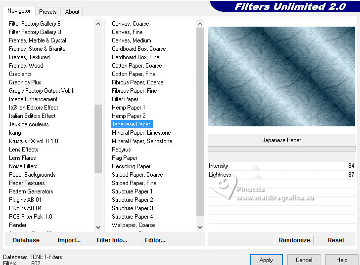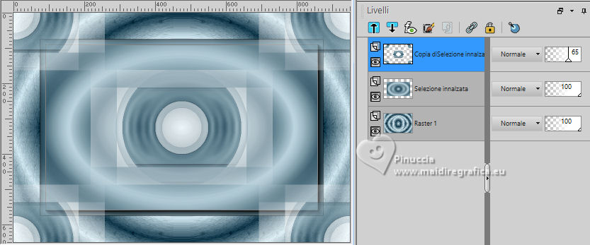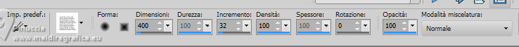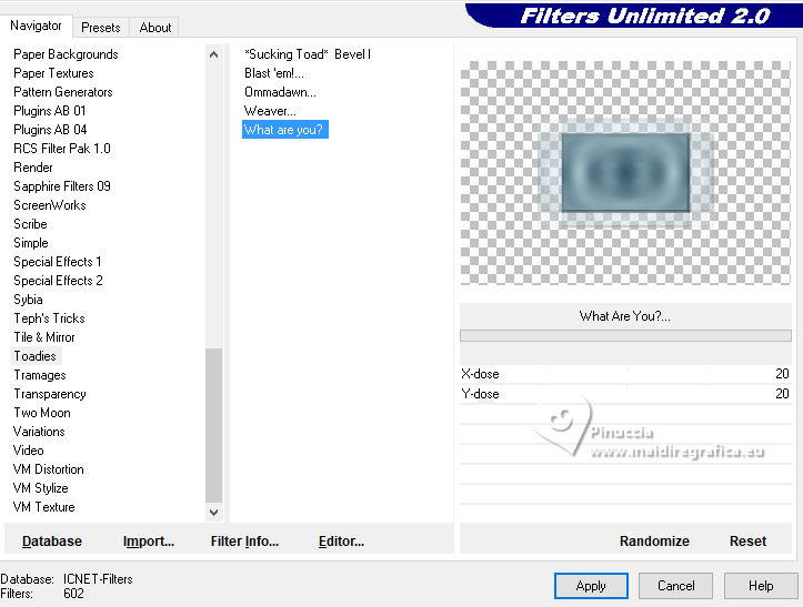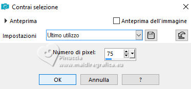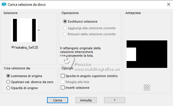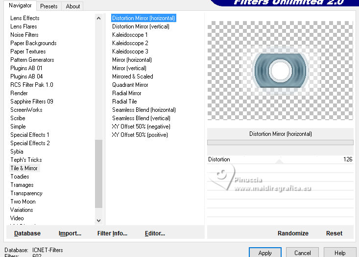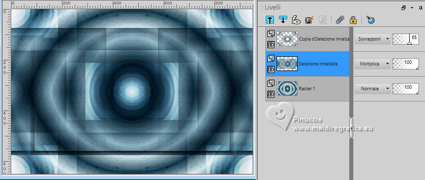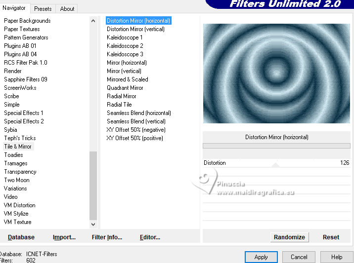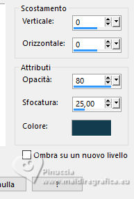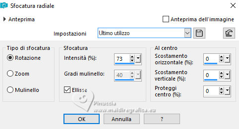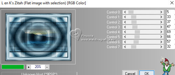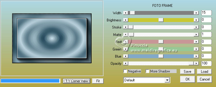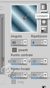 qui puoi trovare qualche risposta ai tuoi dubbi. Se l'argomento che ti interessa non è presente, ti prego di segvisionrmelo. Questo tutorial è stato realizzato con PSP2020 e tradotto con PSPX7, ma può essere eseguito anche con le altre versioni di PSP. Dalla versione X4, il comando Immagine>Rifletti è stato sostituito con Immagine>Capovolgi in orizzontale, e il comando Immagine>Capovolgi con Immagine>Capovolgi in verticale. Nelle versioni X5 e X6, le funzioni sono state migliorate rendendo disponibile il menu Oggetti. Con la nuova versione X7, sono tornati Rifletti>Capovolgi, ma con nuove varianti. Vedi la scheda sull'argomento qui traduzione in francese/traduction en français qui/ici traduzione in inglese/english translation qui/here Versioni/Versions qui![]() Occorrente: ![]() Per i tubes grazie Clo, VioletVixen. Il resto del materiale è di Yedralina. (in questa pagina trovi i links ai siti dei creatori di tubes) ![]() se hai problemi con i filtri, consulta la mia sezione filtri qui Filters Unlimited 2.0 qui Toadies - What are you qui L&K's - L&K's Zitah qui AAA Frames - Foto Frame qui I filtri Toadies si possono usare da soli o importati in Filters Unlimited (come fare vedi qui) Se un filtro fornito appare con questa icona ![]() non esitare a cambiare modalità di miscelatura e opacità secondo i colori utilizzati. Nelle ultime versioni di PSP non c'è il gradiente di primo piano/sfondo (Corel_06_029) Puoi usare i gradienti delle versioni precedenti. Trovi i gradienti Corel X qui. ![]() Metti il pennello nella cartella Pennelli. Attenzione, il pennello è composto da due files che non devono essere separati. Vedi gli appunti sui pennelli qui Metti la selezione nella cartella Selezioni. 1. Imposta il colore di primo piano con #d6edf6, e il colore di sfondo con #153c4f. ![]() Passa il colore di primo piano a Gradiente di primo piano/sfondo, stile Lineare. ![]() Apri una nuova immagine trasparente 950 x 650 pixels. Riempi l'immagine trasparente con il gradiente.2. Effetti>Plugins>Filters Unlimited 2.0 - Paper Textures - Japanese paper, con i settaggi standard. ![]() 3. Effetti>Plugins>Filters Unlimited 2.0 - Tile & Mirror - Distortion Mirror (Horizontal), con i settaggi standard. ![]() 4. Effetti>Effetti di riflesso>Specchio rotante. ![]() 5. Selezione>Seleziona tutto. Selezione>Modifica>Contrai - 75 pixels. ![]() Selezione>Innalza selezione a livello. Regola>Sfocatura>Sfocatura radiale. ![]() 6. Effetti>Plugins>AAA Frames - Foto Frame. ![]() Selezione>Deseleziona. 7. Livelli>Duplica. Immagine>Ridimensiona, al 55%, tutti i livelli non selezionato. 8. Effetti>Plugins>Filters Unlimited 2.0 - Toadies - What are you, con i settaggi standard. ![]() 9. Effetti>Plugins>Filters Unlimited 2.0 - Tile & Mirror - Distortion Mirror (Horizontal), con i settaggi precedenti. ![]() 10. Effetti>Effetti di immagine>Motivo unico, con i settaggi standard. ![]() Abbassa l'opacità di questo livello +/-65%. ![]() 11. Effetti>Effetti 3D>Sfalsa ombra, colore nero. ![]() Cambia la modalità di miscelatura di questo livello in Sovrapponi. Attiva il livello sottostante, Selezione innalzata. 12. Effetti>Effetti di immagine>Motivo unico, fianco a fianco. ![]() 13. Effetti>Effetti di riflesso>Specchio rotante, con i settaggi standard. ![]() Cambia la modalità di miscelatura di questo livello in Moltiplica. ![]() 14. Livelli>Nuovo livello raster. 15. Selezione>Carica/Salva selezione>Carica selezione da disco. Cerca e carica la selezione ©Yedralina_Sel120 ![]() 16. Attiva lo strumento Pennello ![]() Cerca e seleziona il pennello Libellule_100%_natura ![]() Passa il colore di primo piano a Colore. Applica il pennello a sinistra, un po' fuori dal bordo ![]() Selezione>Deseleziona. 17. Effetti>Effetti di riflesso>Specchio rotante. ![]() Cambia la modalità di miscelatura di questo livello in Luce diffusa. ![]() 18. Apri il misted Lighthouse0001-VioletVixenMist2 ![]() Cancella il watermark e vai a Modifica>Copia. Torna al tuo lavoro e vai a Modifica>Incolla come nuovo livello. Suggerimento: se il tuo misted è rettangolare, applicherei la maschera 20-20, per dare al tube una forma più ovale, e più simili allo sfondo del lavoro Immagine>Ridimensiona, se necessario, per me al 90%. 19. Abbassa l'opacità di questo livello +/-50%. 20. Immagine>Aggiungi bordatura, 1 pixel, simmetriche, colore di primo piano. Immagine>Aggiungi bordatura, 1 pixel, simmetriche, colore di sfondo. Immagine>Aggiungi bordatura, 1 pixel, simmetriche, colore di primo piano. Selezione>Seleziona tutto. 21. Modifica>Copia. Modifica>Incolla come nuova immagine e minimizzala. Torna al tuo lavoro. 22. Immagine>Aggiungi bordatura, 10 pixels, simmetriche, con un colore qualsiasi. Passa il colore di primo piano a Gradiente. Riempi la selezione con il gradiente.Selezione>Deseleziona. 23. Ripeti Immagine>Aggiungi bordatura, 1 pixel, simmetriche, colore di primo piano. Immagine>Aggiungi bordatura, 1 pixel, simmetriche, colore di sfondo. Immagine>Aggiungi bordatura, 1 pixel, simmetriche, colore di primo piano. 24. Selezione>Seleziona tutto. Immagine>Aggiungi bordatura, 25 pixels, simmetriche, colore di primo piano. Effetti>Effetti 3D>Sfalsa ombra, colore di sfondo. ![]() 25. Immagine>Aggiungi bordatura, 1 pixel, simmetriche, colore di sfondo. Immagine>Aggiungi bordatura, 1 pixel, simmetriche, colore di primo piano. Immagine>Aggiungi bordatura, 1 pixel, simmetriche, colore di sfondo. Selezione>Seleziona tutto. 26. Immagine>Aggiungi bordatura, 20 pixels, simmetriche, con un colore qualsiasi. Selezione>Inverti. 27. Modifica>Incolla nella selezione (è ancora in memoria l'immagine minimizzata al punto 21). Regola>Sfocatura>Sfocatura radiale, con i settaggi precedenti. 28. Effetti>Plugins>L&K's - L&K's Zitah, con i settaggi standard. ![]() Effetti>Effetti di bordo>Dilata. 29. Effetti>Effetti di riflesso>Specchio rotante. ![]() Effetti>Effetti di riflesso>Specchio rotante. ![]() 30. Selezione>Inverti. 31. Effetti>Effetti 3D>Sfalsa ombra, con i settaggi precedenti