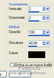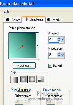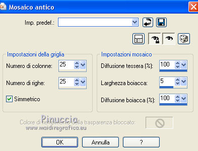 qui puoi trovare qualche risposta ai tuoi dubbi. Se l'argomento che ti interessa non è presente, ti prego di segnalarmelo. Questo tutorial è stato realizzato con Corel19 e tradotto con CorelX7, CorelX2 e CorelX3, ma può essere realizzato anche con le altre versioni di PSP. Dalla versione X4, il comando Immagine>Rifletti è stato sostituito con Immagine>Capovolgi in orizzontale, e il comando Immagine>Capovolgi con Immagine>Capovolgi in verticale. Nelle versioni X5 e X6, le funzioni sono state migliorate rendendo disponibile il menu Oggetti. Con la nuova versione X7, sono tornati Rifletti>Capovolgi, ma con nuove varianti. Vedi la scheda sull'argomento qui traduzione in francese/traduction en français qui/icitraduzione in inglese/english translation qui/hereVersioni/Versions qui Occorrente: Materiale qui Il tube è di Yedralina (1971©Yedralina) Per la maschera grazie Narah (NarahsMasks_1525) Il resto del materiale è di Yedralina. (in questa pagina trovi i links ai siti dei creatori di tubes) Filtri: se hai problemi con i filtri, consulta la mia sezione filtri qui Filters Unlimited 2.0 qui &<Bkg Designer sf10II> - Quantum Line (da importare in Unlimited) qui Filter Factory Gallery D - Mirror it qui AP 01 [Innovations] - Lines SilverLining qui Graphics Plus - Cross shadow qui AAA Filters - A Framer qui AAA Frames - Frame Works /AAA Filters - Custom qui I filtri Factory Gallery e Graphics Plus si possono usare da soli o importati in Filters Unlimited (come fare vedi qui) Se un filtro fornito appare con questa icona ![]() non esitare a cambiare modalità di miscelatura e opacità secondo i colori utilizzati. Nelle ultime versioni di PSP non c'è il gradiente di primo piano/sfondo (Corel_06_029) Puoi usare i gradienti delle versioni precedenti. Trovi qui i gradienti Corel X. Metti la selezione nella cartella Selezioni. Apri la maschera in PSP e minimizzala con il resto del materiale. Imposta il colore di primo piano con #9dffe8, e il colore di sfondo con #004c3a. ![]() Passa il colore di sfondo a Gradiente di primo piano/sfondo, stile Lineare. ![]() 1. Apri una nuova immagine trasparente 950 x 650 pixels, e riempila con il gradiente.Effetti>Plugins>Filters Unlimited 2.0 - &<Bkg Designer sf10II> - Quantum Line, con i settaggi standard. ![]() Effetti>Effetti di riflesso>Specchio rotante. ![]() Effetti>Plugings>Filters Unlimited 2.0 - Filter Factory Gallery D - Mirror it, con i settaggi standard. ![]() 2. Livelli>Nuovo livello raster. Selezione>Seleziona tutto. Apri il misted e vai a Modifica>Copia. Torna al tuo lavoro e vai a Modifica>Incolla nella selezione. nel mio caso il tube è in bianco e nero; altrimenti cambia la modalità di miscelatura in Luminanza (esistente). Selezione>Deseleziona. Effetti>Effetti di immagine>Motivo unico. ![]() Regola>Sfocatura>Sfocatura gaussiana - raggio 25. ![]() Effetti>Plugins>AP 01 [Innovations] - Lines SilverLining. ![]() 3. Attiva il livello di sfondo. Selezione>Carica/Salva selezione>Carica selezione da disco. Cerca e carica la selezione ©Yedralina_sel 745. ![]() Selezione>Innalza selezione a livello. Selezione>Deseleziona. Livelli>Disponi>Sposta su. Effetti>Effetti di trama>Mosaico antico. ![]() 4. Imposta il colore di primo piano con il colore bianco. Livelli>Nuovo livello raster. Riempi il livello con il colore bianco.Livelli>Nuovo livello maschera>Da immagine. Apri il menu sotto la finestra di origine e vedrai la lista dei files aperti. Seleziona la maschera Narahs_Masks_1525. ![]() Livelli>Unisci>Unisci gruppo. Livelli>Disponi>Sposta giù. Immagine>Rifletti. ![]() 5. Attiva nuovamente il livello superiore. Apri il tube texto (Text_Volveremos2020©Yedralina) e vai a Modifica>Copia. Torna al tuo lavoro e vai a Modifica>Incolla come nuovo livello. Immagine>Ridimensiona, al 70%, tutti i livelli non selezionato. Sposta il tube a sinistra.Effetti>Effetti 3D>Sfalsa ombra, colore nero, a scelta; per il mio esempio: ![]() 6. Attiva nuovamente il misted e vai a Modifica>Copia. Torna al tuo lavoro e vai a Modifica>Incolla come nuovo livello. Spostalo a destra.Se necessario, Effetti>Effetti 3D>Sfalsa ombra, colore nero, a scelta; per me ![]() 7. Immagine>Aggiungi bordatura, 2 pixels, simmetriche, colore scuro di sfondo. Modifica>Copia. Immagine>Aggiungi bordatura, 10 pixels, simmetriche, colore bianco. 8. Selezione>Seleziona tutto. Immagine>Aggiungi bordatura, 35 pixels, simmetriche, con un colore qualsiasi. Selezione>Inverti. Modifica>Incolla nella selezione. Regola>Sfocatura>Sfocatura gaussiana - raggio 35. ![]() Selezione>Innalza selezione a livello. Effetti>Plugins>AAA Frames - Frame Works io ho scelto Bright Green in armonia con l'azzurro dell'immagine, ma puoi scegliere i colori che preferisci. Non preoccuparti se non sono esattamente dello stesso colore. ![]() Mantieni selezionato. Effetti>Plugins>AAA Filters - AAA Framer ![]() Mantieni sempre selezionato. Effetti>Plugins>AAA Filters - Custom - clicca su Landscape e ok. ![]() Cambia la modalità di miscelatura di questo livello in Luminanza (esistente). Mantieni ancora selezionato. Effetti>Plugins>Graphics Plus - Cross Shadow, con i settaggi standard. ![]() Selezione>Deseleziona. Livelli>Unisci>Unisci giù. 9. Firma il tuo lavoro su un nuovo livello. Livelli>Unisci>Unisci tutto. Immagine>Ridimensiona, 950 pixels di larghezza, tutti i livelli selezionato. Salva in formato jpg. Esempio con tube di Dragon Blu (DragonBluTube_0109_DontHurtMyHeartByTheBut_) ![]() ![]() Puoi scrivermi se hai problemi o dubbi, o trovi un link che non funziona, o soltanto per un saluto. 14 Aprile 2020 |