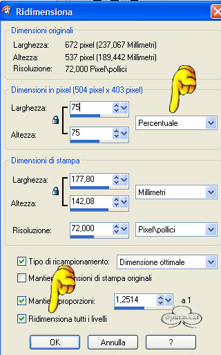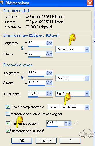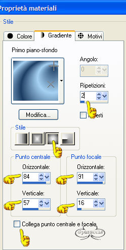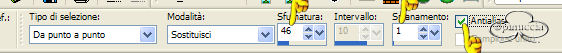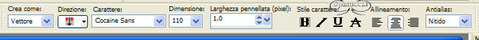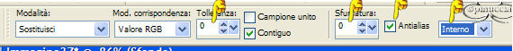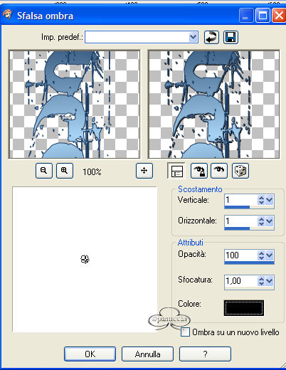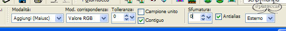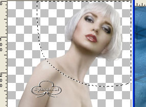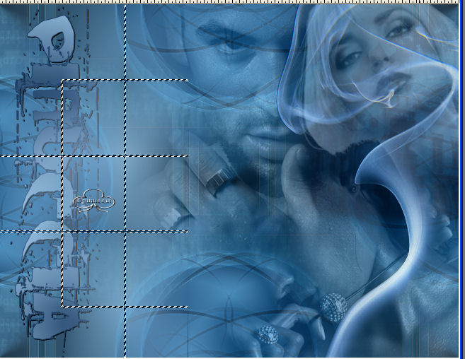 qui puoi trovare qualche risposta ai tuoi dubbi. Se l'argomento che ti interessa non è presente, ti prego di segnalarmelo. Questo tutorial è stato scritto in PSP 9. Occorrente: Tutto il materiale necessario è nello zip Metti il pennello nella cartella Pennelli di PSP. Metti l'immagine in una cartella a scelta. Metti i tubes in una cartella a scelta. Metti il font nella tua cartella Font. Filtro Toadies - Ommadawn qui Filtro Transparency - Eliminate Black qui Animation Shop qui Apri tutti i tubes Uno alla volta, posizionati sul livello tube e vai a Modifica>copia, quindi Modifica>Incolla>Incolla come nuova immagine. Con questo avrai i tubes che ti occorrono, senza il livello dei watermarks. Possiamo cominciare. 1. Apri il file Yoka-Blend-in-BlueBack. 2. Modifica>Copia. 3. Modifica>Incolla>Incolla come nuova immagine. Ripeti questo ancora una volta e metti da parte l'immagine, più tardi avrai bisogno di questa copia. Puoi chiudere l'originale. 4. Livelli>Nuovo livello raster. 5. Imposta il colore di primo piano con un colore scuro che si adatti all'immagine di sfondo. Io ho scelto: #0a1226. (se vuoi usare altri colori, dovrai sempre cambiare il colore dell'immagine di sfondo). 6. Attiva lo strumento Pennello e cerca il pennello Yoka-OldCastlecon questi settaggi: ![]() 7. Applica il pennello in alto a destra, nell'angolo: ![]() e nella paletta dei livelli abbassa l'opacità al 78%. 8. Apri il tube Yoka-MistedLady260206. 9. Immagine>Ridimensiona, con i seguenti settaggi: ![]() 10. Modifica>copia. 11. Torna al tuo lavoro e vai a Modifica>Incolla>Incolla come nuovo livello e muovila nell'angolo in basso a destra. 12. Nella paletta dei livelli cambia la modalità di miscelatura in Luminanza (esistente) e abbassa l'opacità al 46%. ![]() 13. Apri il tube Yoka-MistedMansface260206. 14. Modifica>copia. 15. Torna al tuo lavoro e vai a Modifica>Incolla>Incolla come nuovo livello e sposta il tube come nell'esempio sotto (passo 17). 16. Nella paletta dei livelli abbassa l'opacità di questo livello al 42% e cambia la modalità di miscelatura in Luminanza (esistente) (vedi schermata). 17. Assicurati che i tubes dell'uomo e della donna si fondano piacevolmente, come nell'esempio sotto. ![]() 18. Apri l'immagine "Smoke-image". 19. Modifica>copia. 20. Modifica>Incolla>Incolla come nuova immagine. Innalza il livello di sfondo a livello raster: Livelli>Innalza a livello di sfondo. Puoi chiudere l'originale. 21. Effetti>Plugins>Transparency - Eliminate Black. 22. Modifica>Copia. 23. Torna al tuo lavoro e vai a Modifica>Incolla>Incolla come nuovo livello. 24. Spostalo sulla destra (vedi schermata) e abbassa l'opacità di questo livello all'84%. ![]() 25. Apri il tube Yoka-Lady240206. 26. Attiva lo strumento Selezione con i seguenti settaggi:![]() 27. Traccia una selezione intorno alla testa della donna: ![]() 28. Modifica>Copia. Modifica>Incolla>Incolla come nuova immagine. 29. Immagine>Rifletti. 30. Immagine>Ridimensiona, con i seguenti settaggi: ![]() 31. Modifica>Copia. 32. Torna al tuo lavoro e vai a Modifica>Incolla>Incolla come nuovo livello. Posiziona la testa nell'angolo in alto a destra (vedi schermata).33. Nella paletta dei livelli abbassa l'opacità di questo livello al 42% e cambia la modalità di miscelatura in Luminanza (esistente). ![]() 34. Attiva lo strumento Testo e apri il font Cocaine Sans, con i seguenti settaggi:![]() 35. Imposta il colore di primo piano con un colore scuro che si abbini al vostro sfondo, io ho scelto #1c3d63 e il colore di sfondo con un colore chiaro, io ho scelto #a7d2f2. 36. Passa il colore di sfondo a gradiente di primo piano/sfondo: ![]() con i seguenti settaggi: ![]() 37. Scrivi il tuo nome in lettere maiuscole. Nella paletta dei livelli converti il livello vettore in livello raster. 38. Immagine>Ruota>Ruota per gradi, con i seguenti settaggi: ![]() 39. Sposta il tuo nome a sinistra (vedi schermata). ![]() 40. Effetti>Effetti 3D>Sfalsa ombra, con i seguenti settaggi: ![]() 41. Riapri il tube YokaLady240206 e annulla la selezione. 42. Immagine>Ridimensiona, con i seguenti settaggi: ![]() 43. Regola>Messa a fuoco>Maschera di contrasto, con i seguenti settaggi: ![]() 44. Modifica>Copia. Modifica>incolla>Incolla come nuova immagine. Ripeti e metti da parte la copia: ne avrai bisogno più tardi. 45. Torna al tuo lavoro e vai a Modifica>Incolla>Incolla come nuovo livello. 46. Sposta il tube un po' a sinistra (vedi schermata)e cambia la modalità di miscelatura in Luminanza (esistente). ![]() 47. Effetti>Plugins>Toadies - Omnadown con i seguenti settaggi: ![]() 48. Abbassa l'opacità di questo livello al 38%. 49. Nella paletta dei livelli duplica questo livello. 50. Attiva lo strumento Bacchetta magica , con i seguenti settaggi:![]() seleziona le righe nere create dal filtro omnadown (vedi schermata). (se hai difficoltà a selezionare le righe, aiutati usando lo zoom ![]() ![]() 51. Selezione>Modifica>Espandi di 2 pixels, e sulla tastiera premi il tasto CANC. 52. Effetti>Effetti di bordo>Aumenta di più. Ripeti il passo 52 ancora due volte. Selezione>Nessuna selezione. 53. Abbassa l'opacità di questo livello al 40%, la modalità di miscelatura era già Luminanza (esistente), mantienila. 54. Apri l'immagine ridimensionata della donna che hai messo da parte. 55. Modifica>Copia. 56. Torna al tuo lavoro e vai a Modifica>Incolla>Incolla come nuovo livello. Nella paletta dei livelli cambia la modalità di miscelatura in Luminanza (esistente). 57. Spostala un po' a sinistra (vedi schermata).![]() 58. Effetti>Effetti 3D>Sfalsa ombra, con i seguenti settaggi: ![]() 59. Immagine>Aggiungi bordatura, 5 pixels, simmetriche, con il colore scuro (#0a1226). 60. Immagine>Aggiungi bordatura, 55 pixels, simmetriche, con il colore chiaro (#a7d2f2). 61. Immagine>Aggiungi bordatura, 5 pixels, simmetriche, con il colore scuro (#0a1226). 62. Attiva lo strumento Bacchetta magica ![]() Seleziona il bordo da 55 pixels, con i seguenti settaggi: ![]() 63. Apri l'immagine di sfondo Yoka-Blend-in-