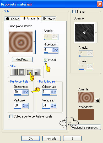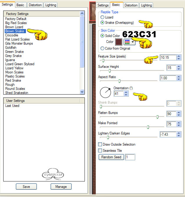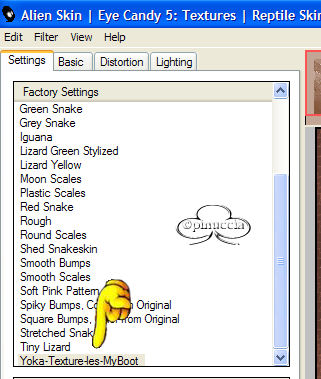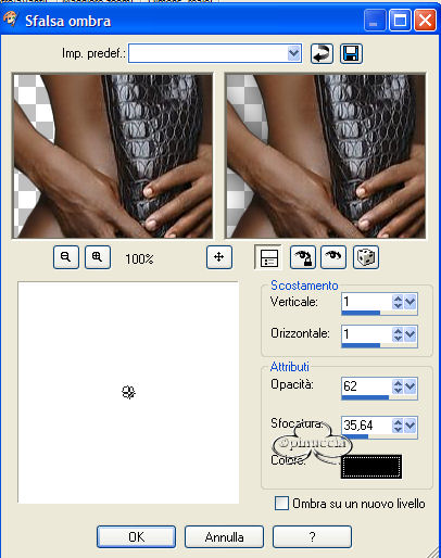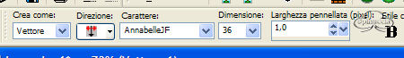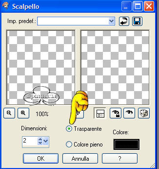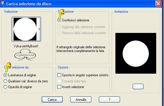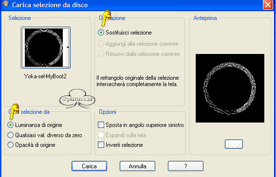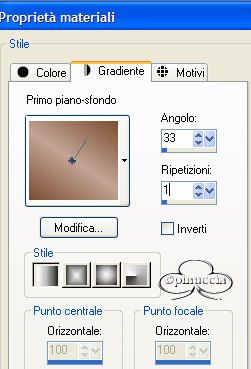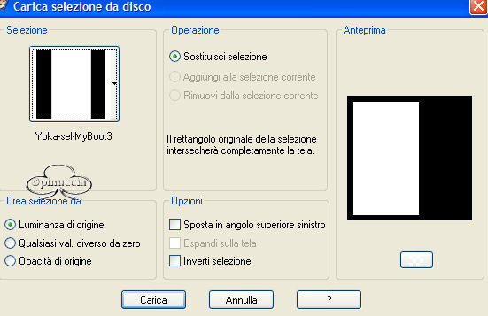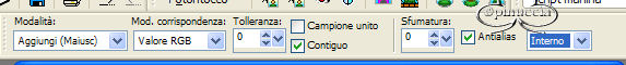 qui puoi trovare qualche risposta ai tuoi dubbi. Se l'argomento che ti interessa non č presente, ti prego di segnalarmelo. Questo tutorial č stato scritto in PSP 9. Occorrente: Materiale qui. Metti tutti i tubes in una cartella a scelta. Metti l'animazione della gamba (Yoka-legs - 5 livelli) in una cartella a scelta. Metti il pennello nella cartella Pennelli di PSP. Metti il font nella tua cartella Font. Metti le selezioni nella cartella Selezioni di PSP. Filtro Alien Skin EyeCandy 5 Texture Estrai il preset Yoka-Texture-les-MyBoot nella cartella settings di EyeCandy5 Texture-->Reptile skin (nel tutorial sono comunque indicati i settaggi manuali per ottenere il preset). Animation Shop qui Apri tutti i tubes, copiali e incollali come nuova immagine. Chiudi gli originali. Questo perchč i tubes hanno un livello per il watermark e a noi serve soltanto il livello del tube. Possiamo partire. Preparazione. Scegli dal tuo tube due colori che si adattino, uno chiaro (io ho scelto #C2A595) e uno scuro (io ho scelto #7D4E32). 1. Apri una nuova immagine trasparente 500 x 500. 2. Imposta il colore di primo piano con il colore scuro e il colore di sfondo con il colore chiaro e crea un gradiente di primo piano/sfondo, usando i seguenti settaggi: ![]() 3. Riempi l'immagine con questo gradiente. 4. Livelli>nuovo livello raster. 5. Setta il colore di primo piano con il colore scuro, il mio č #7D4E32. 6. Attivo lo strumento Pennello e cerca il pennello Yoka-lesMyBoot usando i seguenti settaggi: ![]() e applica il pennello sull'area di lavoro: ![]() 7. Effetti>Effetti di bordo>Aumenta. 8. Livelli>Nuovo livello raster. 9. Selezione>Carica/Salva selezione>Carica selezione da disco e cerca la selezione Yoka-sel-MyBoot1, usando i seguenti settaggi: ![]() e riempi la selezione con il colore chiaro. 10. Cambia la modalitā di miscelatura di questo livello in FILTRA e abbassa l'opacitā al 68%. ![]() 11. Selezione>Nessuna selezione. 12. Livelli>nuovo livello raster. 13. Selezione>Carica/Salva selezione>Carica selezione da disco e cerca la selezione Yoka-sel-MyBoot2, usando i seguenti settaggi: ![]() Riempi la selezione con il gradiente (colori del passo 2), ma usando questi settaggi: ![]() 14. Selezione>Nessuna Selezione. 15. Effetti>Effetti 3D>Scalpello, con i seguenti settaggi: ![]() 16. Apri il tube Yoka-FaceMisted-les-MyBoot e vai a Modifica>Copia. 17. Ritorna al tuo lavoro e vai a Modifica>Incolla>Incolla come nuovo livello. Abbassa l'opacitā di questo livello al 62%. ![]() 18. Immagine>Aggiungi bordatura, 2 pixels, simmetriche, colore nero. 19. Immagine>Aggiungi bordatura, 75 pixels, simmetriche, con il tuo colore chiaro: il mio č #C2A595. 20. Immagine>Aggiungi bordatura, 2 pixels, simmetriche, colore nero. 21. Con la Bacchetta magica usando i settaggi sotto indicati seleziona il bordo da 75 pixels. ![]() 22. Effetti>Plugins>AlienSkin EyeCandy 5 - Texture - Reptile Skin e cerca il preset Yoka-Texture-les-MyBoot: ![]() Nel caso tu trovassi dei problemi a far funzionare questo preset, usa il seguente procedimento: Clicca su Brown Snake, che č un settaggio standard, e vai alla linguetta "Basic" e cambia i settaggi: ![]() 23. Clicca Ok. ![]() 24. Selezione>Nessuna selezione. 25. Immagine>Aggiungi bordatura, 10 pixels, simmetriche, con il colore chiaro (#C2A595). 26. Immagine>Aggiungi bordatura, 1 pixel, simmetriche, colore nero. 27. Immagine>Agigungi bordatura, 10 pixels, simmetriche, con il colore chiaro (#C2A595). 28. Immagine>Aggiungi bordatura, 1 pixel, simmetriche, colore nero. 29. Immagine>Aggiungi bordatura, 10 pixels, simmetriche, con il colore chiaro (#C2A595). 30. Immagine>Aggiungi bordatura, 2 pixels, simmetriche, colore nero. 31. Livelli>Nuovo livello raster. 32. Selezione>Carica/salva selezione>Carica selezione da disco e cerca la selezione Yoka-sel-MyBoot3, usando i seguenti settaggi: ![]() 33. Apri il tube Yoka-Sluiers-les-MyBoot-Misted. 34. Modifica>Copia. 35. Torna al tuo lavoro e vai a Modifica>Incolla>Incolla nella selezione. 36. Selezione>Nessuna selezione. 37. Abbassa l'opacitā di questo tube al 30%. Questo č quello che dovresti avere: ![]() 38. Apri il tube Yoka-BootGuy25-02-06. 39. Modifica>Copia. 40. Torna al tuo lavoro e vai a Modifica>Incolla>Incolla come nuovo livello e spostalo a destra. Posizionalo come si vede nella schermata sotto. (io ho abbassato l'opacitā del tube per far vedere dove bisogna mettere il tube, ma non devi farlo nel tutorial). ![]() 41. Effetti>Effetti 3D>Sfalsa ombra, usando i seguenti settaggi: ![]() 42. Apri il font Annabelle JF. 43. Attiva lo strumento Ellisse: ![]() 44. Imposta il colore di primo piano su nero e il colore di sfondo nullo, usando i seguenti settaggi: ![]() disegna un cerchio come si vede nella schermata: ![]() 45. Livelli>Nuovo livello raster. 46. Imposta il colore di sfondo con un colore chiaro (#DEC0B8) e attiva lo strumento Testo, con questi settaggi: ![]() 47. Posiziona la piccola croce dello strumento testo sul cerchio nero (vedi schermata). ![]() 48. Quando vedrai il mezzo cerchio con sopra la A clicca e scrivi il tuo nome. 49. Vedrai che il tuo nome seguirā la forma del cerchio. 50. Nella paletta dei livelli, converti questo livello in livello raster. 51. Sempre nella paletta dei livelli, elimina il livello vettore con il cerchio. 52. Effetti>Effetti 3D>Sfalsa ombra, con i seguenti settaggi: ![]() 53. Sposta un po' il nome sull'angolo superiore sinistro (vedi schermata). ![]() 54. Livelli>Unisci>Unisci tutto. 55. Salva in formato jpg in una cartella a scelta. Apri Animation Shop. 1. File>Apri e cerca il file Yoka-legs (questo tube ha 5 livelli e se clicchi sull'icona