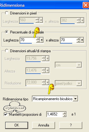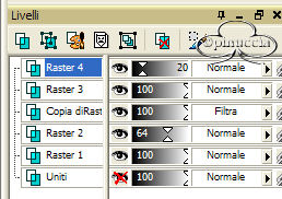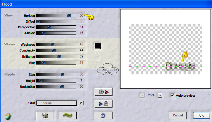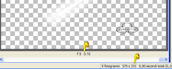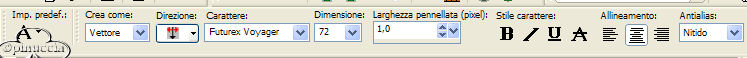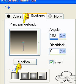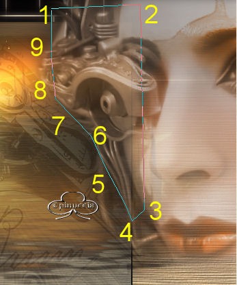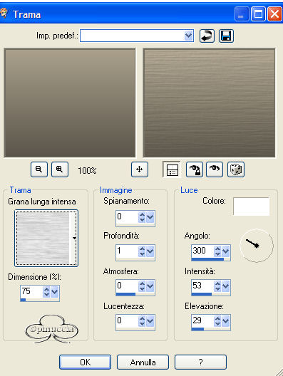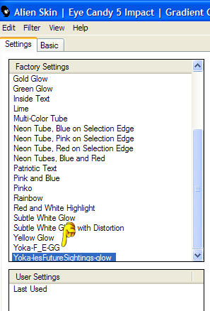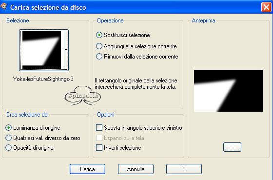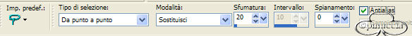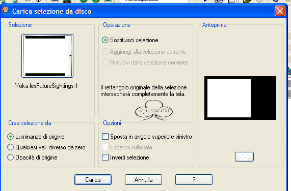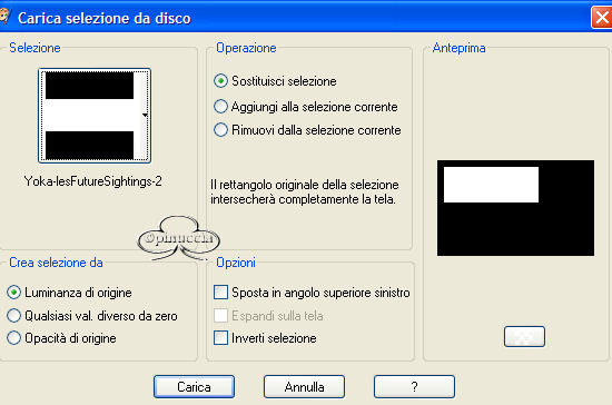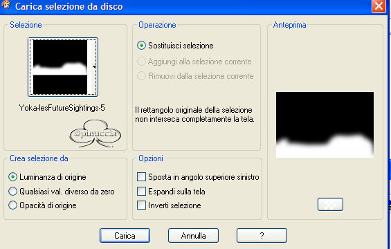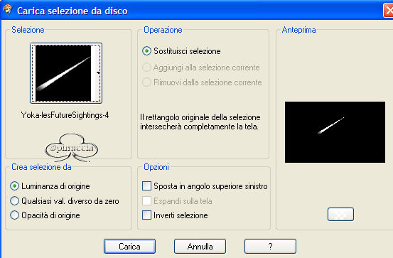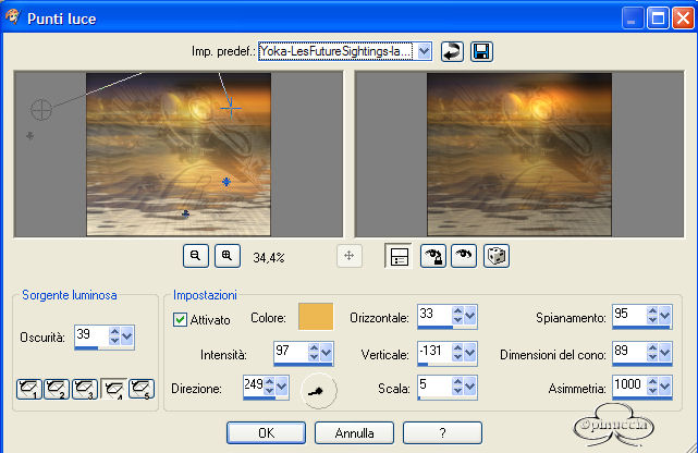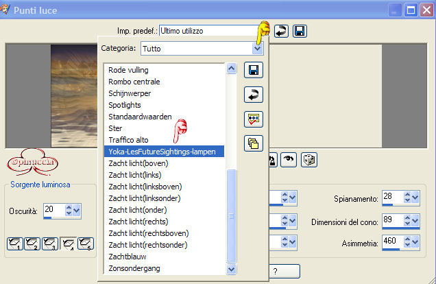 1. Apri l'immagine di sfondo Yoka-FutureSightings. 2. Selezione>Seleziona tutto. 3. Apri l'immagine Futurelandscape 4. Modifica>Copia. 5. Torna all'immagine di sfondo. Livelli>Nuovo livello raster. 6. Modifica>Incolla>Incolla nella selezione. 7. Selezione>Nessuna selezione. 8. Nella paletta dei livelli cambia la modalità di miscelatura in Luce diffusa. 9. Livelli>Unisci>Unisci visibile. 10. Livelli>Nuovo livello raster. 11. Selezione>Carica/Salva selezione>Carica selezione da disco. Cerca e carica la selezione: Yoka:lesFutureSightings-1. ![]() 12. Riempi la selezione con un colore scuro che si abbini alla tua immagine,io ho scelto: #0F0E0D. 13. Selezione>Modifica>contrai, di 2 pixels. 14. Scegli un colore chiaro per il colore di primo piano che si adatti al tuo sfondo; io ho usato #F4E6C8. e un colore scuro per il colore di sfondo che si adatti al tuo sfondo; io ho usato #0F0E0D. 15. Passa il colore di primo piano a gradiente di primo piano/sfondo, con i seguenti settaggi: ![]() e riempi la selezione.16. Effetti>Effetti di trama>Trama / grana lunga intensa con i seguenti settaggi: ![]() 17. Effetti>Effetti di bordo>Aumenta. 18. Selezione>Nessuna selezione. 19. Livelli>Nuovo livello raster. 20. Selezione>Carica/Salva selezione>Carica selezione da disco. Cerca e carica la selezione Yoka-lesFuturesSightings-2. ![]() 21. Apri l'immagine Future Landscape. 22. Modifica>Copia. 23. Torna al tuo lavoro e vai a Modifica>Incolla>Incolla nella selezione. 24. Selezione>Nessuna selezione. 25. Effetti>Plugins>Flaming Pear / Flood, con i seguenti settaggi: ![]() un piccolo appunto su Flaming Pear/Flood. Se stai usando una vecchia versione di questo filtro, è possibile che il risultato non appaia soddisfacente (un disturbo nero). Se hai scaricato la versione più nuova, questo problema sarà risolto.... 26. Nella paletta dei livelli cambia l'opacità al 64%. 27. Livelli>Duplica. 28. Regola>Sfocatura>Sfocatura gaussiana, raggio 12 29. Cambia la modalità di miscelatura in Filtra e riporta l'opacità al 100%. Questo è quello che dovresti avere: ![]() 30. Livelli>Nuovo livello raster. 31. Apri il tube Yoka-lesFutures.watch e toglie il livello del watermark. 32. Modifica>Copia. 33. Ritorna al tuo lavoro e vai a Modifica>Incolla>Incolla come nuovo livello. 34. Spostalo nella posizione corretta:![]() 35. Nella paletta dei livelli abbassa l'opacità al 20%. 36. Chiudi il livello infsriore uniti (vedi schermata): ![]() Come puoi vedere adesso è selezionato il livello superiore (blu). 37. Livelli>Unisci>Unisci visibile. 38. ! APRI IL LIVELLO INfsRIORE ! 39. Posizionati sul livello superiore (blu): ![]() 40. Selezione>Carica/Salva selezione>Carica selezione da disco. Cerca e carica la selezione Yoka-lesFutureSightings-1, stessi settaggi 41. Effetti>Effetti di illuminazione>Punti luce: Apri il menu a tendina (manina gialla) e cerca il preset Yoka-lesFutureSightings-lampen (manina rossa) ![]() Le impostazioni sono queste. ![]() 42. Selezione>Nessuna selezione. 43. Apri il tube Yoka-lesfaceFutures.-130506 e rimuovi il livello del watermark. 44. Modifica>Copia. 45. Torna al tuo lavoro e vai a Modifica>Incolla>Incolla come nuovo livello e sposta il tube a destra, nell'angolo in alto (vedi schermata):![]() 46. Nella paletta dei livelli abbassa l'opacità al 72%. 47. Attiva lo strumento Selezione a mano libera , con i seguenti settaggi:![]() 48. Seleziona il secondo livello uniti: ![]() 49. Fai una selezione partendo a punto 1 a destra fino al punto 2, quindi vai giù fino al punto 3, continua 4 e 5, e 6,7,8,9 e alla fine torna al punto 1. Assicurati di chiudere la linea. ![]() 50. All'ultimo punto doppio clic con il mouse e chiudi la selezione. Questa, per Effetto della sfumatura, si allargherà. ![]() 51. Sulla tastiera premi due volte il tasto CANC. 52. Selezione>Nessuna selezione. 53. Immagine>Aggiungi bordatura, 1 pixel, simmetriche, con il colore chiaro, io ho usato #EEDEC4. 54. Apri il tube Yoka-lesFutures.MistedWomen130506; rimuovi il livello del watermark. 55. Modifica>Copia. 56. Torna al tuo lavoro e vai a Modifica>Incolla>Incolla come nuovo livello e spostalo nell'angolo in basso, contro i bordi. Vedi l'esempio:![]() 57. Effetti>Effetti di bordo>Aumenta. 58. Livelli>Nuovo livello raster. 59. Selezione>Carica/Salva selezione>Carica selezione da disco. Cerca e carica la Selezione Yoka-lesFutureSightings-3. ![]() 60. Riempi la selezione con un colore giallo chiaro.Io ho usato #ffffsb. Cambia la modalità di miscelatura in Sovrapponi. 61. Selezione>Nessuna selezione. Attenzione: La posizione della testa della donna nell'angolo in alto a destra può essere diversa. In quel caso devi spostare il fascio luminoso in modo che parta dall'occhio della donna. ![]() Fai attenzione!! Se vuoi creare una animazione, puoi saltare i prossimi passaggi e procedere con il passo 67. Se vuoi creare una tag non animata, procedi con il passo 62. 62. Livelli>Nuovo livello raster. 63. Selezione>Carica/Salva selezione>Carica selezione da disco. Cerca e carica la selezione Yoka-lesFutureSightings-4. ![]() 64. Riempi la selezione con il bianco e abbassa l'opacità al 94%. Selezione>Nessuna selezione. 65. Effetti>Effetti di bordo>Aumenta di più. 66. Effetti>Plugins>AlienSkin EyeCandy 5 Impact - Gradient Glow - seleziona il preset Yoka-lesFuturesSightings-glow: ![]() Il fascio luminoso deve essere posizionato correttamente. Se necessario, spostalo in modo che parta dall'occhio della donna. ![]() 67. Immagine>Aggiungi bordatura, 2 pixels, simmetriche, con il colore #D4B59E (colore chiaro). 68. Immagine>Aggiungi bordatura, 80 pixels, con il colore #0F0E0D (colore scuro). 69. Selezione>Carica/Salva selezione>Carica selezione da disco cerca e carica la Selezione Yoka-lesFutureSightings-5 ![]() 70. Nella paletta dei livelli clicca con il tasto destro del mouse sul livello sfondo e scegli Innalza a livello di sfondo. 71. Effetti>Plugins>Flaming Pear / Flood, con i seguenti settaggi: ![]() 72. Selezione>Nessuna selezione. 73. Immagine>Aggiungi
