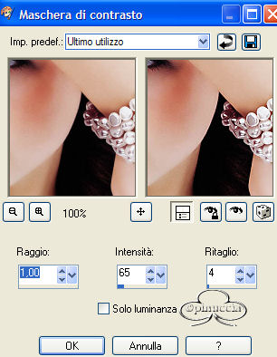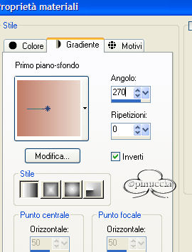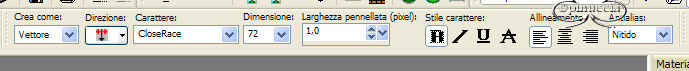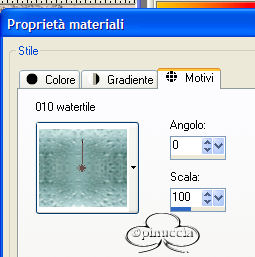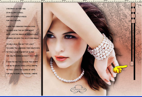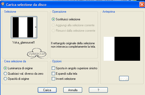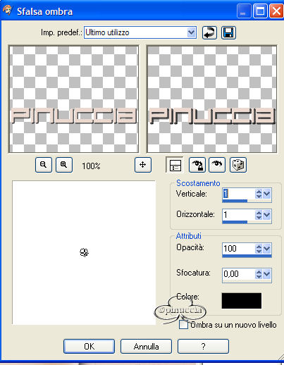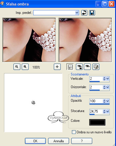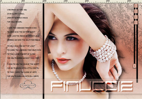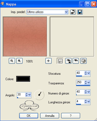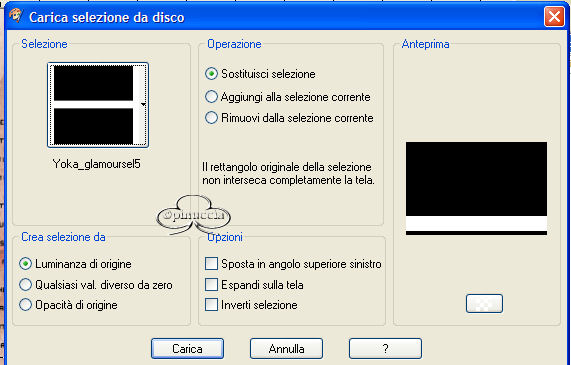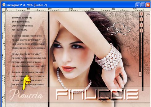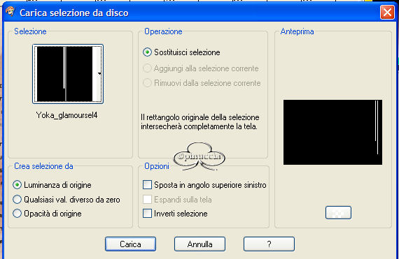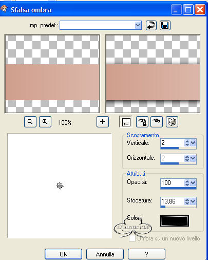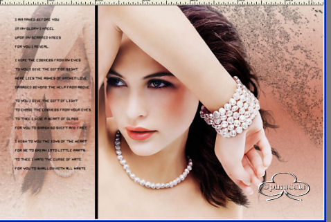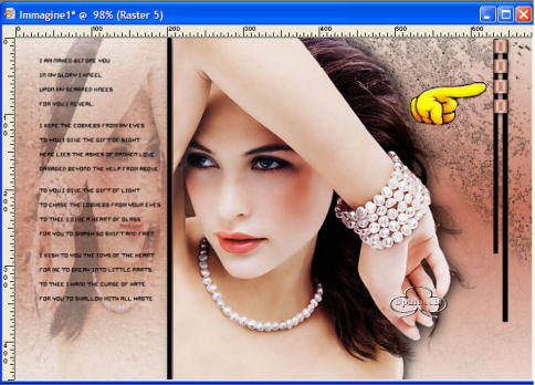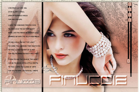qui puoi trovare qualche risposta ai tuoi dubbi. Se l'argomento che ti interessa non è presente, ti prego di segnalarmelo. Occorrente: Materiale necessario qui Estrai il tube in una cartella a scelta. Estrai le selezioni nella cartella Selezioni di PSP. Metti i font nella tua cartella Font. Estrai i pennelli nella cartella Pennelli di PSP. Metti il file Watertile in una cartella a scelta. Ok, possiamo partire.... 1. Apri una nuova immagine trasparente 680 x 450 pixels. Imposta il colore di primo piano su #C4725B e il colore di sfondo con #EAD6CB. Crea un gradiente con questi colori, con i seguenti settaggi: ![]() 2. Riempi l'immagine con questo gradiente.3. Effetti>Effetti di trama>Nappa, con i seguenti settaggi: ![]() 4. Livelli>Nuovo livello raster. Attiva lo strumento Pennello ![]() e cerca SG Grit, con questi settaggi e colore di primo piano impostato su nero: ![]() applica il pennello nell'angolo superiore destro (vedi schermata). ![]() 5. Imposta il colore di primo piano su #C6BABA e il colore di sfondo su #EBD9CF. Crea con questi colori un gradiente lineare, con i seguenti settaggi: ![]() 6. Livelli>Nuovo livello raster. Selezione>Carica/Salva selezione>Carica selezione da disco. Cerca la selezione Yoka_glamoursel1. e clicca Carica. ![]() 7. Riempi questa selezione con il gradiente e cambia la modalità di miscelatura di questo livello in Luce diffusa. Mantieni selezionato. 8. Apri il file 010watertile e cercalo nella lista dei Motivi: ![]() 9. Riempi la selezione con questo pattern. Questo è quello che dovresti ottenere: ![]() Mantieni selezionato. 10. Livelli>Nuovo livello raster. 11. Apri il tube Yoka_JdL_Glamour. Modifica>Copia e chiudi l'originale. Ritorna al tuo lavoro e vai a Modifica>Incolla>Incolla nella selezione. Abbassa l'opacità di questo livello al 36%. 12. Selezione>Nessuna selezione. 13. Livelli>Unisci>Unisci visibile. 14. Livelli>Nuovo livello raster. 15. Attiva lo strumento Pennello e cerca: aRavenBrush-NakedBeforeYou Imposta nero come colore di primo piano e applica il pennelo sul lato sinistro del tuo lavoro (vedi schermata). ![]() 16. Livelli>Nuovo livello raster. 17. Selezione>Carica/Salva selezione>Carica selezione da disco e cerca la selezione Yoka Glamoursel3. Riempi la selezione di nero. 18. Selezione>Nessuna selezione. 19. Apri nuovamente il tube Yoka_JdL_Glamour. Immagine>Rifletti. Immagine>Ridimensiona, con i seguenti settaggi: Selezionato Mantieni le proporzioni!. ![]() Regola>Messa a fuoco>Maschera di contrasto, con i seguenti settaggi: ![]() 20. Modifica>Copia. Torna al tuo lavoro e vai a Modifica>Incolla>Incolla come nuovo livello. Sposta il tube verso la linea nera (vedi schermata). ![]() 21. Effetti>Effetti 3D>Sfalsa ombra, con i seguenti settaggi: ![]() 22. Livelli>Nuovo livello raster. 23. Selezione>Carica/Salva selezione>Carica selezione da disco e cerca la selezione Yoka_glamoursel4. ![]() 24. Riempi la selezione con il colore nero. 25. Selezione>Nessuna selezione. 26. Apri il tube Blokjestube. 27. Modifica>Copia. Torna al tuo lavoro e vai a Modifica>Incolla>Incolla come nuovo livello. Posizionalo come si vede nella schermata sotto: ![]() 28. Apri il tube blokjestube 1. Modifica>Copia. Torna al tuo lavoro e vai a Modifica>Incolla>Incolla come nuovo livello e mettilo al suo posto (vedi schermata). ![]() 29. Livelli>Unisci>Unisci visibile. 30. Livelli>Nuovo livello raster. 31. Imposta il colore di sfondo su #EBD9CF e il colore di primo piano su #C07C67, e crea un gradiente con i seguenti settaggi: ![]() 32. Selezione>Carica/Salva selezione>Carica selezione da disco e carica la selezione Yoka_glamoursel5 ![]() 33. Riempi la selezione con questo gradiente e abbassa l'opacità del livello al 30%. 34. Effetti>Effetti 3D>Sfalsa ombra, con i seguenti settaggi: ![]() 35. Selezione>Nessuna selezione. Dovresti avere questo: ![]() 36. Livelli>Unisci>Unisci visibile. 37. Attiva lo strumento Testo ![]() Apri il font CloseRacePark e imposta come colore di sfondo #ebd9cf, primo piano nullo. Scrivi il tuo nome con i seguenti settaggi: ![]() La dimensione è settata per un nome corto. Potresti aver bisogno di regolarla a seconda della lunghezza del tuo nome. Metti il nome al suo posto. 38. Nella paletta dei livelli cambia il livello vettore in livello raster. With the movingtool you put the name in it's place . 39. Effetti>Effetti 3D>Smusso a incasso, con i seguenti settaggi: ![]() 2 40. Cambia la modalità di miscelatura di questo livello in Sovrapponi. ![]() 41. Apri il font Ephesis, con gli stessi settaggi del passo 37, soltanto cambia la dimensione a 48 e scrivi nuovamente il tuo nome e posizionalo (vedi schermata). (valgono le osservazioni appena fatte sulla lunghezza del nome). ![]() 42. Nella paletta dei livelli converti il livello vettore in livello raster. Cambia la modalità di miscelatura di questo livello in Sovrapponi. 43. Apri nuovamente il font CloseRacePark, con gli stessi settaggi di prima soltanto cambia la dimensione a 30. 44. Scrivi il tuo nome e converti il livello vettore in livello raster. Mettilo al suo posto (vedi schermata). ![]() 45. Effetti>Effetti 3D>Sfalsa ombra con i seguenti settaggi: 46. Cambia la modalità di miscelatura di questo livello in Scurisci. Avrai questo: ![]() 47. Livelli>Unisci>Unisci visibile. 48. Immagine>Aggiungi bordatura, con i seguenti settaggi, colore nero: ![]() 49. Apri il tube blokjestube 2. Modifica>Copia. Torna al tuo lavoro e vai a Modifica>Incolla>Incolla come nuovo livello. 40. Sposta il tube alla fine della lunga riga verticale (vedi schermata). ![]() 51. Livelli>Unisci>Unisci tutto. Se vuoi, riduci la tag e aggiungi il tuo watermark. Salva in formato jpg. ![]() ![]() Se hai problemi o dubbi, o trovi un link non funzionante, o anche soltanto per un saluto, scrivimi. Maggio 2006 |