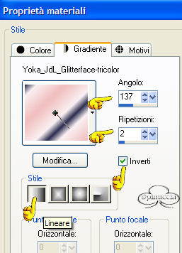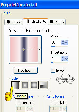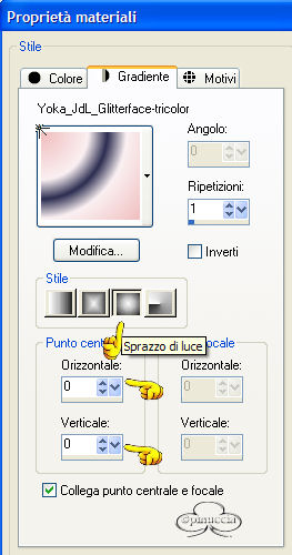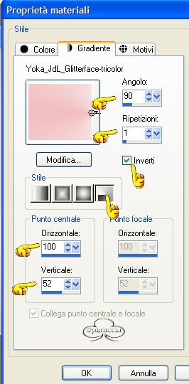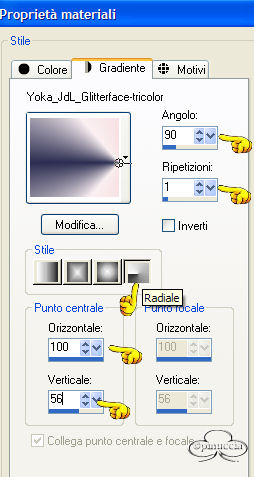 qui puoi trovare qualche risposta ai tuoi dubbi. Se l'argomento che ti interessa non è presente, ti prego di segnalarmelo. Occorrente: Questo tutorial è stato scritto in PSP 9. Materiale zip Metti i tubes in una cartella a scelta. Metti la maschera nella cartella maschere di PSP. Metti le selezioni nella cartella selezioni di PSP. Metti il gradiente nella cartella gradienti di PSP. Metti il pennello nella cartella Pennelli di PSP. Filtro Cybia - Screenworks qui Filtro Transparency - Eliminate Black qui Filtro DSB Flux qui 1. Apri una nuova immagine trasparente 550 x 400 pixels. Cerca il gradiente Yoka_JdL_Glitterface-tricolor-gradient, con i seguenti settaggi: ![]() 2. Riempi l'immagine con questo gradiente. 3. Regola>Sfocatura>Sfocatura radiale, con i seguenti settaggi: ![]() 4. Livelli>Nuovo livello raster. Riempi con lo stesso gradiente, ma questa volta con i seguenti settaggi: ![]() 5. Effetti>Plugins>Screenworks - Boxed dot. 6. Effetti>Plugins>Transparency - Eliminate Black. 7. Nella paletta dei livelli cambia la modalità di miscelatura di questo livello in Sovrapponi e abbassa l'opacità al 54%. (se usi colori chiari modalità di miscelatura su Luce netta e opacità 100%). Questo è quello che dovresti avere: ![]() 8. Livelli>Unisci>Unisci visibile. 9. Apri il tube Yoka_JdL_Glitterface-Small-tube e vai a Modifica>Copia. Torna al tuo lavoro e vai a Modifica>Incolla>Incolla come nuovo livello. Spostalo un po' sulla destra (vedi schermata):![]() 10. Regola>Sfocatura>Sfocatura gaussiana, con gli stessi settaggi del passo 3. ![]() 11. Nella paletta dei livelli abbassa la modalità di miscelatura in Luce diffusa. 12. Livelli>Unisci>Unisci tutto. 13. Immagine>Aggiungi bordatura, 2 pixels, simmetriche, colore Bianco. Questo è quello che dovresti avere: ![]() Per il momento, metti da parte questo sfondo. 14. Apri una nuova immagine trasparente 450 x 300. 15. Riempi con lo stesso gradiente