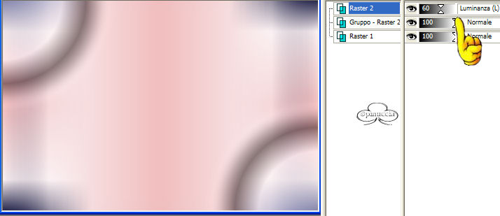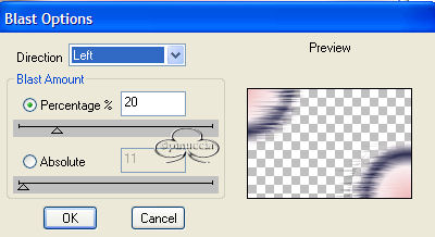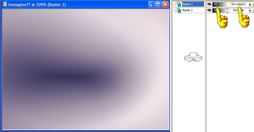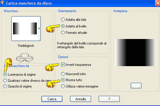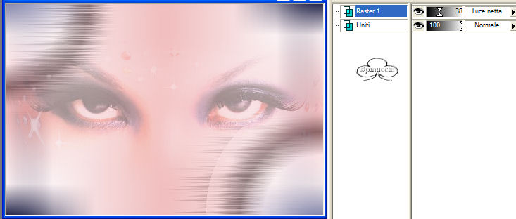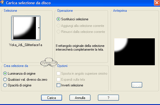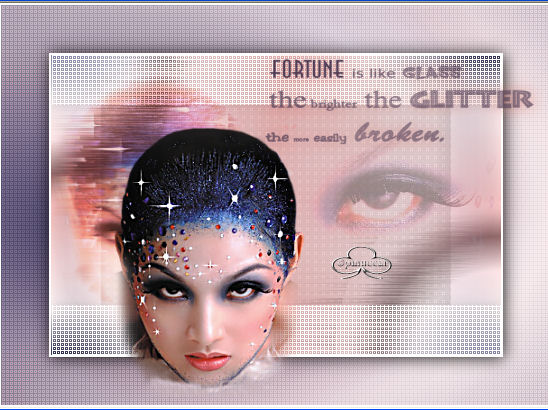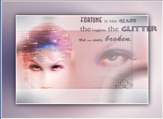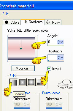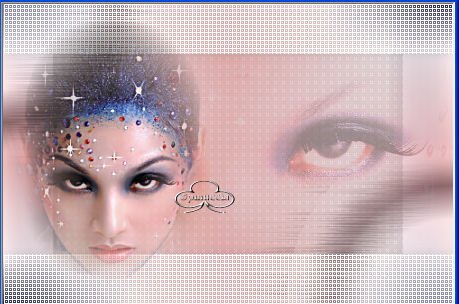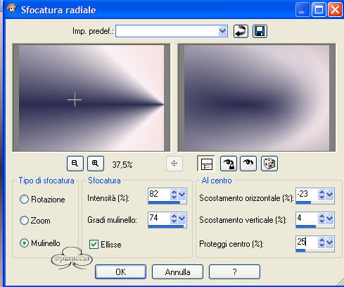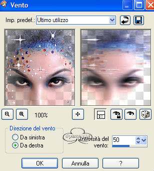 ma con i seguenti settaggi:![]() 16.Livelli>Nuovo livello raster. 17. Riempi questo livello nuovamente con lo stesso gradiente, ma cambiando i settaggi: ![]() 18. Livelli>Carica/Salva maschera>Carica maschera da disco e cerca la maschera: 1fadebgmsk. ![]() 19. Clicca carica. Questo il risultato: ![]() 20. Livelli>Unisci>Unisci gruppo. 21. Livelli>Nuovo livello raster. 22. Selezione>Carica/Salva selezione>Carica selezione da disco e cerca la selezione Yoka_JdL_Glitterface1a, con i seguenti settaggi: ![]() 23. Con lo strumento Riempimento così impostato:![]() Riempi la selezione con il gradiente e con questi settaggi: ![]() 24. Selezione>Nessuna selezione. 25. Livelli>Duplica. 26. Immagine>Rifletti. 27. Immagine>Capovolgi. 28. Livelli>Unisci>Unisci giù. 29. Nella paletta dei livelli cambia la modalità di miscelatura in Luminanza (esistente) e abbassa l'opacità al 60%. Questo è quello che dovresti avere: ![]() 30. Effetti>Plugins>Dsb Flux-Blast, con i seguenti settaggi: ![]() 31. Livelli>Unisci>Unisci visibile. 32. Apri il tube Yoka_JdL_Glitterface_Eyes e vai a Modifica>Copia. Torna al tuo lavoro e vai a Modifica>Incolla>Incolla come nuovo livello. Nella paletta dei livelli cambia la modalità di miscelatura in Luce netta e abbassa l'opacità al 38%. Questo è quello che dovresti avere: ![]() 33. Livelli>Unisci>Unisci visibile. 34. Livelli>Nuovo livello raster. 35. Selezione>Seleziona tutto. 36. Selezione>Modifica>Contrai di 50 pixels. 37. Riempi la parte centrale con il blu. Io ho scelto: #5954a3.38. Effetti>Plugins>Screenworks - Point Array. 39. Effetti>Plugins>Transparancy -Eliminate Black. 40. Nella paletta dei livelli cambia la modalità di miscelatura di questo livello in Luminanza (Esistente) e abbassa l'opacità al 70%. 41. Selezione>Nessuna selezione. 42. Livelli>Unisci>Unisci visibile. Avrai questo: ![]() 43. Livelli>Nuovo livello raster. 44. Selezione>Carica/Salva selezione>Carica selezione da disco, cerca la selezione Yoka_JdL_Glitterfacesel2. 45. Riempi la selezione con il bianco.(Attenzione!! Tolleranza del Riempimento a 0). 46. Effetti>Plugins>Screenworks - Hollow Dot. (se usi un colore chiaro abbassa l'opacità al 50%). 47. Effetti>Plugins>Transparancy - Eliminate Black. 48. Selezione>Nessuna selezione. 49. Effetti>Effetti 3D>DropShadow, con i seguenti settaggi. ![]() 50. Livelli>Duplica. 51. Immagine>Rifletti. 51. Non disperare... abbiamo quasi finito. 52. Apri il tube Yoka _JdL_Glitterface-smallest e vai a Modifica>Copia. 53. Torna al tuo lavoro e vai a Modifica>Incolla>Incolla come nuovo livello. 54. Muovilo un po' a sinistra: ![]() 55. Effetti>Effetti di distorsione>Vento, con i seguenti settaggi: ![]() Nella paletta dei livelli cambia la modalità di miscelatura in Luce netta (se stai usando un colore chiaro allora cambia in Rafforza). 56. Effetti>Effetti 3D>Sfalsa ombra, con i seguenti settaggi: ![]() 57. Livelli>Unisci>Unisci tutto. 58. Immagine>Aggiungi bordatura, 2 pixels, simmetriche, colore bianco. Modifica>Copia. 59. Torna allo sfondo che hai creato nella prima parte di questo tutorial, quello che hai messo da parte e vai a Modifica>Incolla>Incolla come nuovo livello. Avrai questo: ![]() 60. Effetti>Effetti 3D>Sfalsa ombra, con questi settaggi: ![]() 61. Livelli>Nuovo livello raster. 62. Imposta il colore di primo piano su #513d55. 63. Attiva lo strumento Pennello