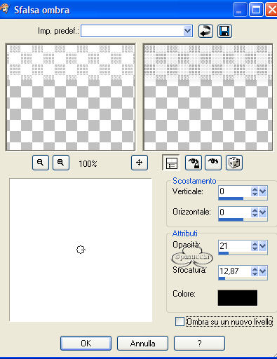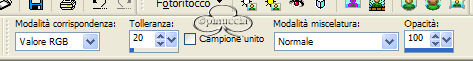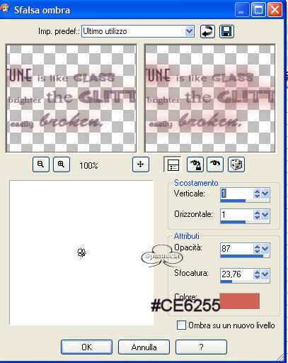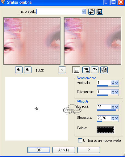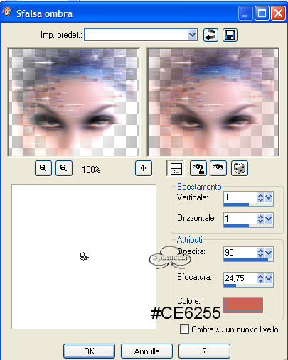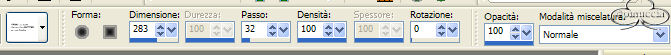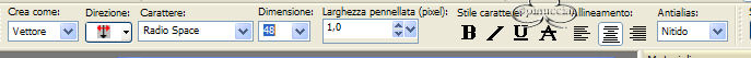 con questi settaggi:![]() 64. Applica il pennello sul tuo lavoro (vedi schermata). ![]() 65. Effetti>Effetti 3D>Sfalsa ombra, con i seguenti settaggi: ![]() 66. Apri il tube Yoka_JdL_Glitterface-smallest II e vai a Modifica>Copia. 67. Torna al tuo lavoro e vai a Modifica>Incolla>Incolla come nuovo livello e posizionalo sulla tela (vedi schermata). ![]() 68. Effetti>Effetti 3D>Sfalsa ombra, con i seguenti settaggi: ![]() 69. Se vuoi, puoi usare il file Witte ster 2, compreso nello zip e applicarla sulla tela. In tal caso, metti prima il file nella cartella Ornamenti di PSP Aggiungi un nuovo livello. Attiva lo strumento Ornamento e applica le stelline,cambiando dimensioni.... a tua scelta. ![]() 70. Livelli>Unisci>Unisci tutto. Rimane da aggiungere il tuo nome e avrai finito. 71. Clicca sullo strumento Testo ![]() 72. Imposta il colore di primo piano su: nero. 73. Imposta il colore di sfondo sul gradiente Yoka_JdL_Glitterface-tricolor, con i seguenti settaggi: ![]() 74. Cerca il font RadioSpaceSampleText e scrivi il tuo nome con i seguenti settaggi: ![]() 75. Effetti>Effetti 3D>Sfalsa ombra, con i seguenti settaggi: ![]() 76. Livelli>Unisci>Unisci tutto. Aggiungi il tuo watermark, e salva in formato jpg. ![]() Se hai problemi o dubbi, o trovi un link non funzionante, o anche soltanto per un saluto, scrivimi. Maggio 2006 |