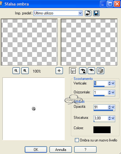 24. Effetti>Effetti 3D>Sfalsa ombra, con i seguenti settaggi: