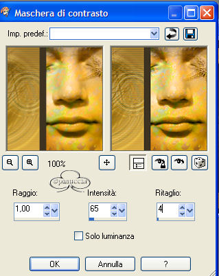 23. Regola>Messa a fuoco>Maschera di contrasto con i seguenti settaggi:
