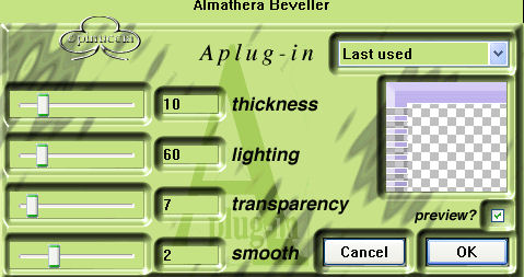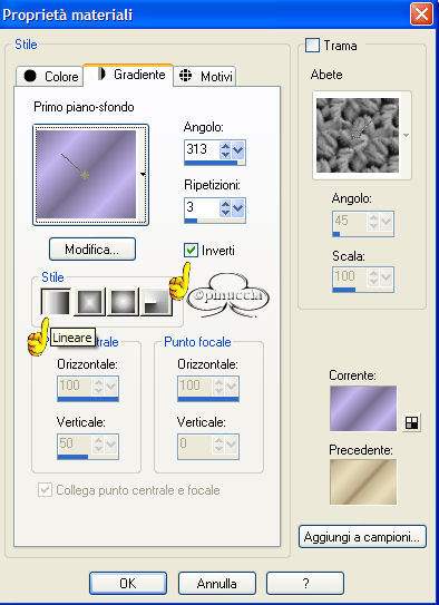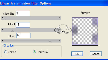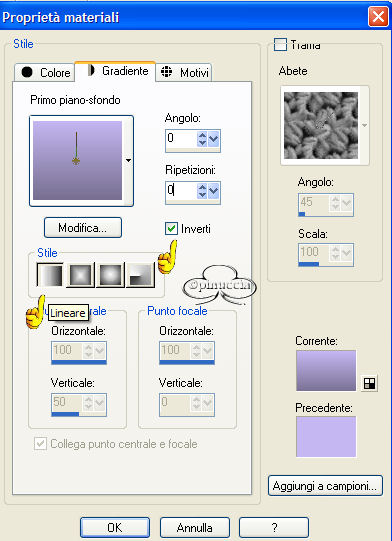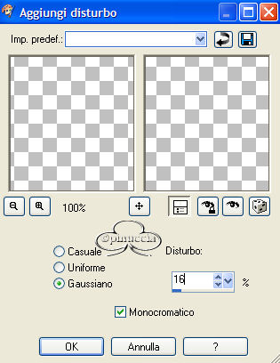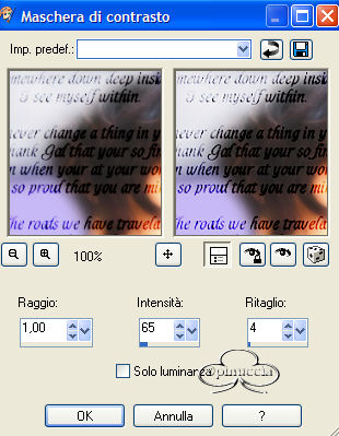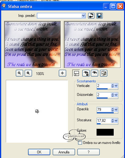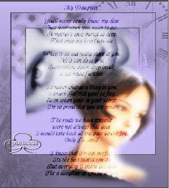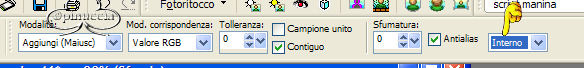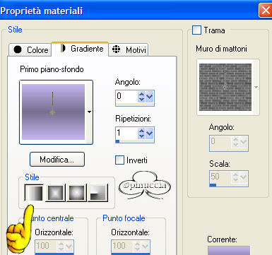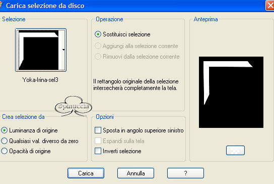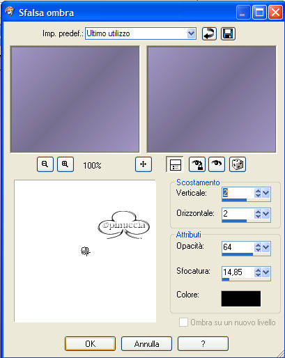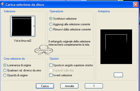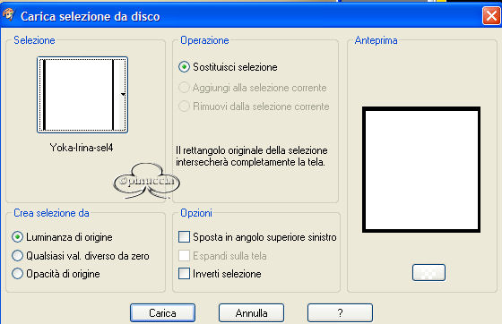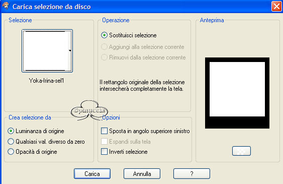 qui puoi trovare qualche risposta ai tuoi dubbi. Se l'argomento che ti interessa non è presente, ti prego di segnalarmelo. Questo tutorial è stato scritto in PSP 9. Occorrente: Materiale: qui Metti i pennelli nella cartella Pennelli di PSP. Metti le selezioni nella cartella Selezioni di PSP. Metti i tubes in cartelle a scelta. Filtri: DSB Flux qui Almathera - A Beveller qui Animation Shop qui Apri tutti i tubes. Copiali e incollali come nuova immagine e chiudi i tubes originali. 1. Apri una nuova immagine trasparente 600 x 640 pixels. 2. Imposta il colore di primo piano con: #c4b7f2 e il colore di sfondo con: #776f90. Con questi colori crea un gradiente primo piano/sfondo con i seguenti settaggi: ![]() Riempi la tela con questo gradiente. 3. Selezione>Carica/Salva selezione>Carica selezione da disco e carica la selezione Yoka-Irina-sel4: ![]() 4. Effetti>Effetti 3D>Sfalsa ombra con questi settaggi: ![]() 5. Selezione>inverti. 6. Regola>Aggiungi rimuovi disturbo>Aggiungi disturbo e usa i seguenti settaggi: ![]() 7. Selezione>Nessuna selezione. 8. Apri il tube Yoka-BlueFace LARGE e vai a Modifica>Copia. 9. Torna al tuo lavoro e vai a Modifica>Incolla>Incolla come nuovo livello e sposta il tube sull'angolo superiore sinistro. 10. Abbassa l'opacità di questo livello al 36%. 11. Immagine>Aggiungi bordatura di 1 pixel, simmetriche, con il colore:#37353f. Metti da parte questo sfondo per il momento. Ti servirà più tardi. 12. Apri una nuova immagine trasparente 500 x 550 pixels. 13. Imposta il colore di primo piano con: #c4b7f2 e il colore di sfondo con: #776f90 14. Crea un gradiente primo piano/sfondo con i seguenti settaggi: ![]() 15. Riempi l'immagine con questo gradiente. 16. Livelli>Nuovo livello raster. 17. Imposta il colore di primo piano con: #3b3944. 18. Attiva lo strumento Pennello e carica il pennello: Yoka-Pluisbloem2, con i seguenti settaggi: ![]() 19. Applica una parte del pennello nell'angolo in basso a sinistra (vedi schermata): ![]() 20. Livelli>Nuovo livello raster. 21. Ritorna al tuo pennello e applica lo stesso pennello sul bordo sinistro dell'immagine (vedi schermata) usando gli stessi settaggi. ![]() 22. Abbassa l'opacità di questo livello al 50%. 23. Livelli>Nuovo livello raster. 24. Selezione>Carica/Salva selezione>Carica selezione da disco e carica la selezione: Yoka-Irina-sel1. ![]() 25. Imposta il colore di primo piano con #c7b9f5 e riempi la selezione con questo colore. 26. Selezione>Modifica>Contrai di 2 pixels. 27. Selezione>Inverti. 28. Selezione>Mobile e riempi la selezione con: #37353f. 29. Selezione>Nessuna selezione. Questo è quello che dovresti avere: ![]() Il colore di primo piano è sempre #37353f. 30. Livelli>Nuovo livello raster. 31. Attiva nuovamente lo strumento Pennello e cerca: Yoka - les-Irina-uurwerk, con i seguenti settaggi: ![]() e applica il pennello come nell'esempio: ![]() 32. Livelli>Nuovo livello raster. 33. Selezione>Carica/Salva selezione>Carica selezione da disco e carica: Yoka-Irina-sel2 ![]() 34. Riempi la selezione con il colore: #37353f 35. Selezione>Nessuna selezione. 36. Apri il tube Yoka-BlueFace e vai a Modifica>Copia. 37. Torna al tuo lavoro e vai a Modifica>Incolla>Incolla come nuovo livello e posizionalo nel quadrato centrale. ![]() 38. Livelli>Nuovo livello raster. 39. Selezione>Carica/Salva selezione>Carica selezione da disco e carica: Yoka-Irina-sel3 ![]() 40. Attiva nuovamente lo strumento Pennello e cerca: Yoka-les-IRINA-flowers1: ![]() Il colore di primo piano è sempre: #37353f 41. Applica il pennello floreale nell'angolo della selezione (vedi schermata). ![]() 42. Selezione>Nessuna selezione. 43. Abbassa l'opacità di questo livello all'86%. 44. Livelli>Nuovo livello raster. 45. Imposta il colore di primo piano su: #fef8f0 e applica nuovamente il pennello floreale (vedi schermata) ![]() 46. Abbassa l'opacità di questo livello al 78%. 47. Livelli>Unisci>Unisci giù. 48. Livelli>Disponi>Sposta giù. 49. Immagine>Aggiungi bordatura, di 2 pixels, simmetriche, colore: #37353f. 50. Apri il tube Yoka-MistedFace-08-11-05 e vai a Modifica>Copia. 51. Torna la tuo lavoro e vai a Modifica>Incolla>Incolla come nuovo livello e sposta il tube sulla destra... vedi esempio. ![]() 52. Apri il tube Yoka-Poem-my-daughter e vai a Modifica>Copia. 53. Torna al tuo lavoro e vai a Modifica>Incolla>Incolla come nuovo livello e spostalo un po' in alto (vedi schermata), ![]() e cambia la modalità di miscelatura in Rafforza. 54. Immagine>Aggiungi bordatura di 20 pixels, simmetriche, colore: #c4b7f2. 55. Attiva lo strumento Bacchetta magica, con i seguenti settaggi: ![]() 56. Livelli>Nuovo livello raster. 57. Riempi la selezione usando il gradiente con i colori del passo 13 e con i seguenti settaggi: ![]() 58. Effetti>Plugins>DBS Flux - Lineair Transmission, usando i seguenti settaggi: ![]() 59. Effetti>Effetti di bordo>Aumenta di più. 60. Abbassa l'opacità di questo livello all'84%. 61. Selezione>Nessuna selezione. 62. Effetti>Plugins>Almathera - A Beveller, con i seguenti settaggi: ![]() 63. Immagine>Aggiungi bordatura, 2 pixels, simmetriche, colore: #37353f 64. Immagine>Ridimensiona, con i seguenti settaggi: ![]() 65. Regola>Messa a fuoco>Maschera di contrasto, con i seguenti settaggi: ![]() 66. Modifica>Copia. 67. Modifica>Incolla>incolla come nuovo livello e incollala sull'immagine di sfondo che hai messo da parte prima (600x640). 68. Effetti>Effetti 3D>Sfalsa ombra, con i seguenti settaggi: ![]() 69. Livelli>Unisci>Unisci tutto. 70. Immagine>Ridimensiona, con i seguenti settaggi: ![]() 71. Regola>Messa a fuoco>Maschera di contrasto: ![]() 72. Salva in formato jpg in una cartella a scelta. Apri Animation Shop 73. Apri la tag Irina che hai appena salvato e l'animazione Yoka-Clock-Animation (nello zip). Come puoi vedere Clock-animation ha 12 fotogrammi. Per poter creare l'animazione anche la tag Irina deve avere lo stesso numero di fotogrammi. Questo è quello che devi fare: 74. Clicca sul primo fotogramma della tag Irina, per selezionar