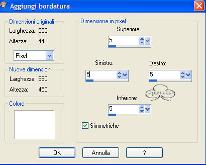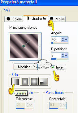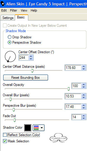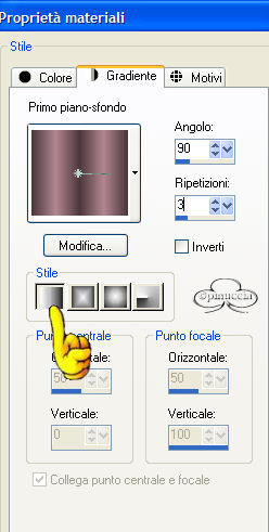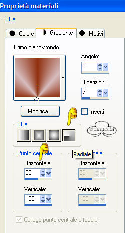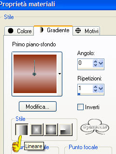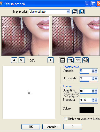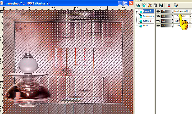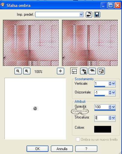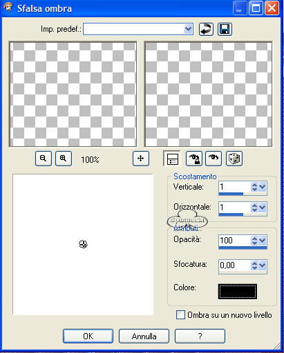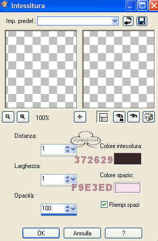 qui puoi trovare qualche risposta ai tuoi dubbi. Se l'argomento che ti interessa non è presente, ti prego di segnalarmelo. Occorrente: Questo tutorial è stato scritto in PSP 9. Materiale nello zip. Metti il font nella tua cartella font. Metti i tubes in una cartella a scelta. Metti la selezione nella cartella Selezioni di PSP. filtri: Toadies - Weaver qui Alien Skin Eye Candy 5 Impact qui ********** 1. Apri una nuova immagine trasparente 550 x 440 pixels. (Una piccola avvertenza: se scegliete altri colori, prendete nota dei numeri, perchè ci saranno molti cambiamenti). 2. Imposta il colore di primo piano con #261b21 Colore di sfondo con: #d7bdbf Crea un gradiente primo piano/sfondo con questi colori e i seguenti settaggi e riempite la vostra immagine con questo gradiente: ![]() 3. Livelli>Nuovo livello raster, e nuovamente riempite l'immagine con questo gradiente, ma cambiando i settaggi: ![]() 4. Regola>Sfocatura>Sfocatura gaussiana: 12. 5. Livelli>Carica/Salva maschera>Carica maschera da disco e cerca ww.-texturemask1 con i seguenti settaggi: ![]() da 6. Livelli>Unisci>Unisci gruppo. 7. Apri il tube Yoka_JdL_OB-3 e vai a Modifica>Copia. 8. Torna al tuo lavoro e vai a Modifica>Incolla>Incolla come nuovo livello. 9. Effetti>Plugins>Toadies-Weaver con i seguenti settaggi. ![]() 10. Effetti>Effetti di Bordo>Aumenta di più. 11. Livelli>Unisci>Unisci visibile. 12. Effetti>Effetti di trama>Intessitura, con i seguenti settaggi: ![]() 13. Apri il tube Yoka _JdL_OB-4 e vai a Modifica>Copia. 14. Torna al tuo lavoro e vai a Modifica>Incolla>Incolla come nuovo livello 15. Muovilo sull'angolo superiore sinistro cambia la modalità di miscelatura in Luminanza (esistente) e abbassa l'opacità al 50% (vedi schermata). ![]() 16. Livelli>Unisci>Unisci visibile. 17. Selezione>Seleziona tutto. 18. Selezione>Modifica>contrai di 45 pixels. 19. Livelli>Nuovo livello raster. 20. Imposta il colore di primo piano in: #faecfb e il colore di sfondo in: #7d5f61 Crea un gradiente primo piano/sfondo con questi colori, usando i seguenti settaggi. ![]() Riempi l'immagine con questo gradiente. 21. Cambia la modalità di miscelatura di questo livello in Sovrapponi. 22. Selezione>Modifica>Contrai di 5 pixels. 23. Selezione>Inverti. 24. Selezione>Mobile. 25. Nella paletta dei livelli Innalza la selezione a livello. 26. Livelli>Nuovo livello raster e riempi con lo stesso gradiente usato al passo 2, soltanto cambiando i seguenti settaggi: ![]() 27. Selezione>Nessuna selezione. Questo è quello che dovresti avere: ![]() 28. Selezione>Carica/salva selezione>Carica selezione da disco e cerca la selezione Yoka-OB-1 con i seguenti settaggi: ![]() 29. Effetti>Effetti 3D>Ritaglio con i seguenti settaggi: ![]() 30. Selezione>Nessuna selezione. 31. Effetti>Effetti 3D>Sfalsa ombra con i seguenti settaggi: ![]() 32. Apri il tube Yoka_JdL_OB_PerfumeBottle e vai a Modifica>Copia. 33. Torna al tuo lavoro e vai a Modifica>Incolla>Incolla come nuovo livello e posizionalo come si vede nella schermata. e cambia la modalità di miscelatura in Luminanza (esistente). ![]() 34. Effetti>Effetti 3D>Sfalsa ombra con i seguenti settaggi: ![]() 35. Apri il tube Yoka_JdL_Lipstick e vai a Modifica>Copia. 36. Torna al tuo lavoro e vai a Modifica>Incolla>incolla come nuovo livello. 37. Cambia la modalità di miscelatura in Luminanza (esistente) e posiziona il tube del rossetto come si vede nella schermata. ![]() 38. Ripeti lo Sfalsa ombra del passo 34 due volte. 39. Livelli>Unisci>Unisci giù. 40. Effetti>Plugins>Alien Skin Eye Candy 5 Impact-Perspective Shadow con i seguenti settaggi. ![]() 41. Livelli>Unisci>Unisci tutto. 42. Immagine>Aggiungi bordatura con i seguenti settaggi: ![]() 43. Seleziona questo bordo con lo strumento Bacchetta magica, sfumatura e tolleranza e antialias a zero. 44. Riempi questo bordo con lo stesso gradiente usato al passo 26. 45. Effetti>Effetti 3D>Sfalsa ombra con i seguenti settaggi. ![]() 46. Selezione>Nessuna selezione. Adesso dovresti avere questo: ![]() 47. Per rendere più luminosa l'immagine ho aggiunto degli sprazzi di luce nella bottiglia di profumo. Ecco come fare: Con lo strumento Pennello così impostato: ![]() ho dato dei colpi di luce alla bottiglia. ![]() 48. Lo stesso ho fatto con gli occhi della donna nello sfondo. Dopo aver cambiato la dimensione a 8, ho cliccato due o tre volte. ![]() Quando sei soddisfatto del risultato: 49. Immagine>Aggiungi bordatura, con i seguenti settaggi: ![]() 50. Con lo strumento Bacchetta magica, sfumatura tolleranza e antialias a zero, seleziona il bordo. 51. Imposta il colore di primo piano su: #4c373c e il colore di sfondo su: #b38691, crea un gradiente di primo piano/sfondo con i seguenti settaggi: ![]() e riempi il bordo con questo gradiente: 52. Effetti>Effetti di trama>Intessitura, con i seguenti settaggi. ![]() 53. Selezione>Nessuna selezione. 54. Apri di nuovo il tube Yoka_JdL_OB-3 e vai a Modifica>Copia. Torna al tuo lavoro e vai a Modifica>Incolla>Incolla come nuovo livello e spostalo un po' a destra in alto (vedi schermata) e 55. nella paletta dei livelli duplica questo livello (per chiarezza, questo è definito un "misted" tube). 56. Livelli>Unisci>Unisci giù. Il tube adesso è incollato sopra il bordo, quindi devi correggerlo così: 57. Con lo strumento Selezione, impostato a rettangolo antialias e sfumatura zero, seleziona la parte alta del tube (vedi schermata). ![]() Premi il tasto CANC e avrai di nuovo il bordo pulito. 58. Apri il tube Yoka-OB-tekst-passion e vai a Modifica>Copia. Torna al tuo lavoro e vai a Modifica>Incolla>Incolla come nuovo livello e posiziona il testo (vedi schermata). ![]() 59. Cambia la modalità di miscelatura in Moltiplica e abbassa l'opacità al 78%. 60. Effetti>Effetti di trama>Rilievo. 61. Imposta il colore di primo piano su: #4b2a2d e il colore di sfondo su: #f9dce6 e crea un gradiente di primo piano/sfondo per il colore di sfondo: ![]() 62. Attiva lo strumento Testo e cerca il font Ambiance BT, con i seguenti settaggi ![]() scri