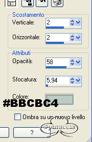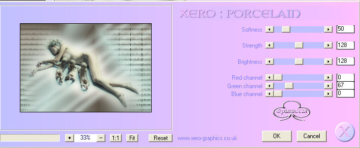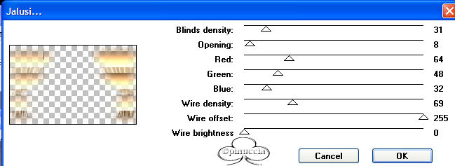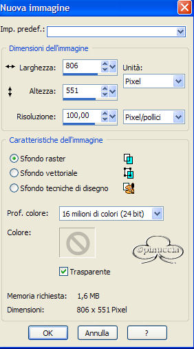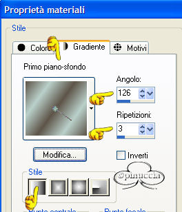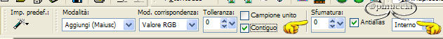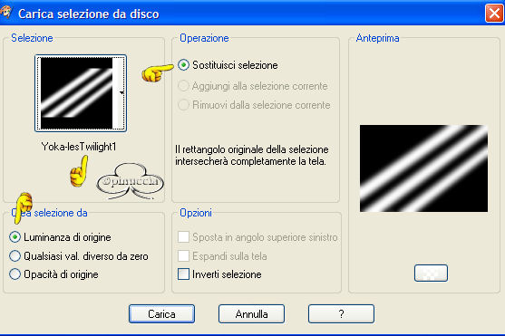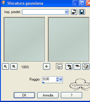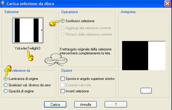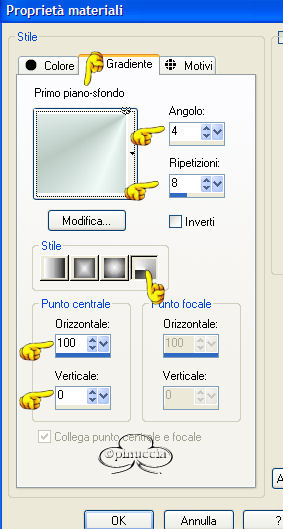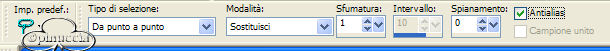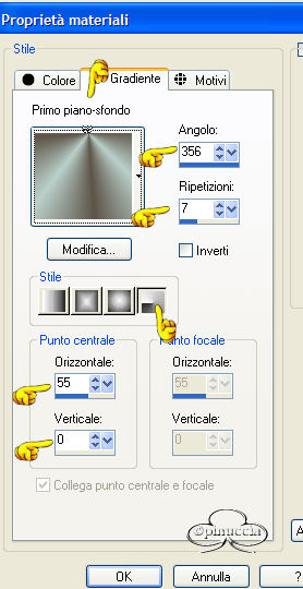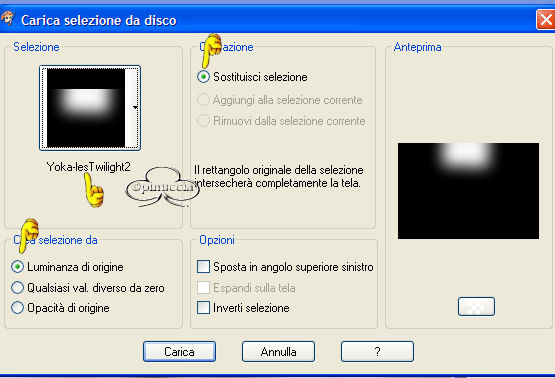 qui puoi trovare qualche risposta ai tuoi dubbi. Se l'argomento che ti interessa non è presente, ti prego di segnalarmelo. Questo tutorial è stato scritto in PSP 9 Occorrente: Materiale qui Metti le selezioni nella cartella Selezioni di PSP. Metti i tubes in una cartella a scelta. Filtri: Xero / Porcelain qui Unplugged Tools (Jalusi) (è nello zip). Apri tutti i tubes. Uno alla volta: Modifica>Copia, e quindi Modifica>Incolla>Incolla come nuova immagine e chiudi gli originali. Salvali in una cartella a scelta. Se usi dei tubes diftwilightrenti, dovrai sperimentare un po' il loro rendimento con le modalità di miscelatura dei vari livelli. Possiamo partire: 1. Apri una nuova immagine trasparente 806 x 551 pixels. ![]() 2. Scegli come colore di primo piano un colore chiaro che si adatti al tuo tube. Io ho scelto #BBCBC4, e 3. scegli come colore di sfondo un colore ancora più chiaro che si adatti al tuo tube, usando le stesse tonalità di colore. Io ho scelto #F0FBF8. ![]() 4. Nella paletta dei materiali passa il colore di primo piano a gradiente di primo piano/sfondo con i seguenti settaggi: ![]() Riempi l'immagine con il gradiente.5. Regola>Sfocatura>Sfocatura gaussiana, raggio 9: ![]() 6. Livelli>Nuovo livello raster. 7. Selezione>Carica/salva selezione>Carica selezione da disco. Cerca e carica la selezione Yoka-lesTwilight1: ![]() riempi la selezione con il colore chiaroio ho usato: #F0FBF8 ![]() 8. Imposta il colore di primo piano con un colore più scuro preso dal tube, io ho scelto: #5E5448 . 9. Imposta il colore di sfondo con un colore più chiaro preso dal tube, io ho scelto: #BAD1CB. ![]() 10. Passa il colore di primo piano a gradiente di primo piano/sfondo, con i seguenti settaggi: ![]() 11. Selezione>Modifica>Contrai, di 4 pixels. 12. Selezione>Inverti. 13. Riempi la selezione con il gradiente.![]() 14. Selezione>Inverti. 15. Riempi la selezione con lo stesso gradiente.16. Effetti>Effetti di bordo>Aumenta di più. ![]() 17. Selezione>Nessuna selezione. 18. Selezione>Carica/Salva selezione>Carica selezione da disco: Cerca e carica la selezione Yoka-lesTwilight2 ![]() 19. Passa il colore di primo piano a gradiente di primo piano/sfondo, con i seguenti settaggi: ![]() 20. Riempi la selezione con il gradiente.![]() Selezione>Nessuna selezione. 21. Livelli>Nuovo livello raster. 22. Selezione>Carica/Salva selezione>Carica selezione da disco: cerca e carica la selezione Yoka-lesTwilight3: ![]() 23. Apri il tube Yoka-Curtain. 24. Modifica>Copia. 25. Torna al tuo lavoro e vai a Modifica>Incolla>Incolla nella selezione. 26. Selezione>Nessuna selezione. Sposta la tenda un po' a destra (vedi schermata).27. Nella paletta dei livelli cambia la modalità di miscelatura in Luminanza (Esistente) e abbassa l'opacità al 72%. ![]() 28. Livelli>Duplica. 29. Immagine>Rifletti. 30. Sposta la tenda un po' a sinistra, come si vede nella schermata:![]() 31. Livelli>Unisci>Unisci giù. 32. Effetti>Plugins>Unplugged Tools - Jalusi con i seguenti settaggi: ![]() 33. Livelli>Unisci>Unisci visibile. ![]() 34. Apri il tube Yoka-MistLady-and-babies2300506. 35. Modifica>Copia. 36. Torna al tuo lavoro e vai a Modifica>Incolla>Incolla come nuovo livello e sposta il tube un po' più in basso:![]() 37. Livelli>Duplica. 38. Livelli>Unisci>Unisci visibile. 39. Selezione>Seleziona tutto. 40. Selezione>Modifica>Contrai, di 7 pixels. 41. Effetti>Plugins>Xero / Porcelain, con i seguenti settaggi: ![]() 42. Premi sulla tastiera Ctrl+C. 43. Livelli>Nuovo livello raster 44. Selezione>Modifica>Contrai, di 2 pixels. Riempi la selezione con il colore bianco.45. Premi sulla tastiera il tasto CANC. 46. Selezione>Nessuna selezione. 47. Effetti>Effetti 3D>Sfalsa ombra, con i seguenti settaggi: ![]() 48. Immagine>Aggiungi bordatura, 2 pixels, simmetriche, con il colore bianco. 49. Immagine>Aggiungi bordatura, 55 pixels, simmetriche, con un colore scuro preso dall'immagine: io ho scelto: #5B5549 50. Immagine>Aggiungi bordatura, 2 pixels, simmetriche, con il colore bianco. 51, Immagine>Aggiungi bordatura, 7 pixels, simmetriche, con qualsiasi colore che non sia il bianco. 52. Seleziona il bordo da 7 pixels con la bacchetta magica così impostata:![]() 53. Incolla>Incolla nella selezione (l'immagine è ancora in memoria). 54. Effetti>Effetti di bordo>Aumenta di più. 55. Immagine>Aggiungi bordatura, 2 pixels, simmetriche, con il colore bianco. 56. Selezione>Nessuna selezione. 57. Apri il tube Yoka-Babyface. 58. Modifica>Copia. 59. Torna al tuo lavoro e vai a Modifica>Incolla>Incolla come nuovo livello e spostalo nell'angolo in alto a destra.Nella paletta dei livelli cambia la modalità di miscelatura in Luminanza (esistente) e abbassa l'opacità al 64%. ![]() 60. Apri il tube Yoka-Fopspeen. 61. Modifica>Copia. 62. Torna al tuo lavoro e vai a Modifica>Incolla>Incolla come nuovo livello e spostalo a destra, come mostrato nella schermata:![]() 63. Adesso dovrai modificare un po' il tube, in modo che sembri che sia appeso: 64. Attiva lo zoom del livello superiore: ![]() 65. Abbassa, per il momento, l'opacità al 40%. 66. Attiva lo strumento Selezione con questi settaggi:![]() 67. Seleziona la parte dell'anello come mostrato nella schermata sotto: ![]() 68. Premi sulla tastiera il tasto CANC. Selezione>Nessuna selezione. Riporta l'opacità al 100%. 69. Effetti>Effetti 3D>Sfalsa ombra, con i seguenti settaggi: ![]() 70. Livelli>Unisci>Unisci tutto. Aggiungi il tuo watermark, se vuoi, e ridimensiona la tag. ![]() Se hai problemi o dubbi, o trovi un link non funzionante, o anche soltanto per un saluto, scrivimi. Luglio 2006 |