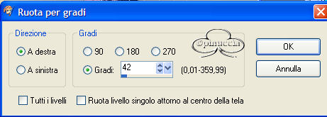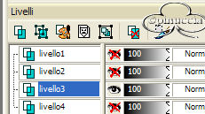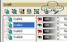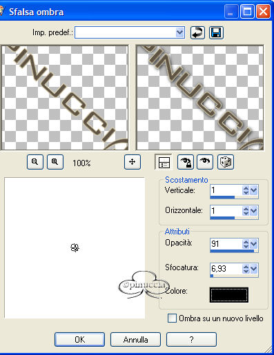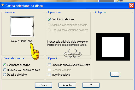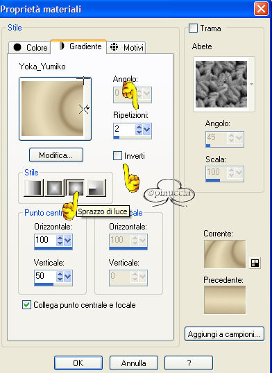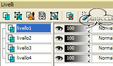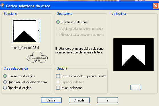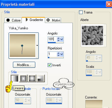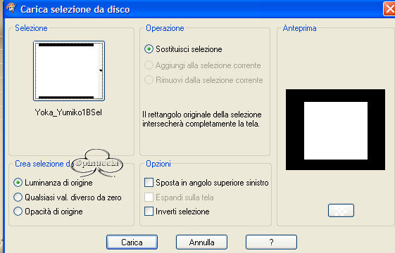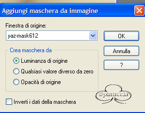 qui puoi trovare qualche risposta ai tuoi dubbi. Se l'argomento che ti interessa non è presente, ti prego di segnalarmelo. Occorrente: Materiale: qui Metti il gradiente nella cartella gradienti di Psp. Metti i tubes in una cartella a scelta. Metti le selezioni nella cartella Selezioni di Psp. Metti il font nella tua cartella dei font. Xero - Soft Vignette qui Richard Rosenman - Grid Generator qui Transparency - Eliminate Black qui Animation Shop qui Apri i tubes, copiali e incollali come nuova immagine. Per il momento mettili da parte e chiudi gli originali. Apri il file yaz-mask612(psp-image) e minimizzalo per il momento. 1. Apri una nuova immagine trasparente 550x450 pixels. 2. Riempi la tela con il gradiente Yoka_Yumiko così impostato: ![]() 3. Livelli>Nuovo livello raster. 4. Riempi questo livello con lo stesso gradiente, ma cambiando con le seguenti impostazioni: ![]() 5. Apri il file yaz-mask612 PSP-image. 6. Livelli>Nuovo livello maschera>da immagine, con i seguenti settaggi: ![]() Clicca ok. 7. Livelli>Unisci>Unisci gruppo. 8. Apri il tube Yumiko-small tube e vai a Modifica>Copia. 9. Torna al tuo lavoro e vai a Modifica>Incolla>Incolla come nuovo livello e sposta il tube sulla destra. 10. Effetti>Effetti di distorsione>Vento, da destra, intensità del vento: 100. 11. Abbassa l'opacità di questo livello all'88% e cambia la modalità di miscelatura in Sovrapponi. 12. Modifica>Incolla>incolla come nuovo livello (il tube è ancora in memoria), abbassa l'opacità al 56% e mettilo sopra il tube distorto (vedi esempio) ![]() 13. Livelli>Nuovo livello raster. 14. Selezione>Carica/Salva selezione>Carica selezione da disco e cerca la selezione Yoka-Yumiko1aSel, con i seguenti settaggi: ![]() 15. Riempi questa selezione con il colore: #e7dcb9. Avrai questo: ![]() 16. Mantieni selezionato. 17. Effetti>Plugins>Richard Rosenman>Grid Generator con i seguenti settaggi: ![]() 18. Effetti>Plugins>Transparency - Eliminate black. Vedrai qualcosa di simile a questo: ![]() 19. Selezione>Nessuna selezione. 20. Apri il tube Yumiko-Driehoek e vai a Modifica>Copia. 21. Torna al tuo lavoro e vai a Modifica>Incolla>Incolla come nuovo livello. 22. Posiziona il tube come nell'esempio. ![]() 23. Livelli>Duplica. 23. Immagine>Capovolgi, posiziona il tube come nella schermata sotto: ![]() e abbassa l'opacità del livello al 56%. 24. Livelli>Unisci>Unisci visibile. 25. Apri il tube Hoek e vai a Modifica>Copia. 26. Torna al tuo lavoro e vai a Modifica>Incolla>Incolla come nuovo livello. 27. Spostalo a destro nell'angolo in alto. 28. Livelli>Duplica. 29. Immagine>Rifletti. Dovresti avere qualcosa di simile a questo: ![]() 30. Apri il tube Yoka-Bonsai2 e vai a Modifica>Copia. 31. Torna al tuo lavoro e vai a Modifica>Incolla>Incolla come nuovo livello. 32. Spostalo sulla destra come si vede nell'esempio. ![]() 33. Abbassa l'opacità di questo livello al 40% e questo dovrebbe essere il risultato: ![]() 34. Imposta il colore di primo piano con: #e9debb e il colore di sfondo con: #5f5443. 35. Attiva lo strumento Testo, apri il font Backslash e scrivi il tuo nome con i seguenti settaggi: ![]() !!Regola la dimensione del font a seconda della lunghezza del tuo nome.!! 36. Nella paletta dei livelli Converti il livello vettore in livello raster. 37. Immagine>Ruota, ruota per gradi, con i seguenti settaggi: ![]() 38. Effetti>Effetti 3D>Sfalsa ombra, con i seguenti settaggi: ![]() 39. Modifica>Copia. 40. Modifica>Incolla>Incolla come nuova immagine. 41. Salva in formato PSP in una cartella a scelta (ne avrai bisogno più tardi per l'animazione). 42. Nella paletta dei livelli, elimina il livello del nome. 43. Livelli>Unisci>Unisci tutto. 44. Immagine>Aggiungi bordatura di 1 pixel, simmetriche, colore #F3EAC7. 45. Immagine>Aggiungi bordatura di 1 pixel, simmetriche, colore #5F5443. 46. Immagine>Aggiungi bordatura di 1 pixel, simmetriche, colore #F3EAC7. 47. Nella paletta dei livelli promuovi il livello di sfondo in livello raster. 48. Livelli>Duplica questo 3 volte, fino ad avere un totale di 4 livelli con la stessa immagine. ![]() 49. Rinomina, cominciando dall'alto, livello 1, livello 2... (vedi schermata). ![]() 50. Posizionati sul livello 1 e chiudi gli altri livelli. ![]() 51. Selezione>Carica/Salva selezione>Carica selezione da disco e cerca la selezione Yoka-Yumiko1BSel, con i seguenti settaggi: ![]() 52. Effetti>Plugins>Xero - Soft Vignette, con i seguenti settaggi: ![]() 53. Chiudi il livello 1 e attiva il livello 2. 54. Effetti>Plugins>Xero - Soft Vignette con i seguenti settaggi: ![]() 55. Chiudi il livello 2 e apri il livello 3. ![]() 56. Effetti>Plugins>Xero - Soft Vignette, con i seguenti settaggi: ![]() L'unica cosa che cambia ogni volta è strenght, gli altri settaggi non cambiano. 57. Selezione>Nessuna selezione. 58. Nella paletta dei livelli, attiva il livello 1. 59. Selezione>Carica/Salva selezione>Carica selezione da disco, con i seguenti settaggi: ![]() 60. Attiva il livello 1 - premi CANC. 61. Ripeti questo passo per il livello 2 e il livello 3. 62. Selezione>Nessuna selezione. 63. Attiva il livello 1 e chiudi i livelli 2 e 3. Il livello 4 NON è chiuso. ![]() 64. File>Esporta>Ottimizzazione jpg e salva in una cartella a scelta. 65. Chiudi il livello 1, apri e attiva il livello 2. Il livello 4 NON è chiuso. ![]() 66. Ripeti il passo 64. 67. Chiudi i livelli 1 e 2 e attiva il livello 3 (i livelli 3 e 4 NON sono chiusi). ![]() 68. Ripeti il passo 64. 69.Apri Animation Shop. Nel tutorial Angelface è spiegato nei dettagli come animare le immagini. Adesso, spiego brevemente: 70. Animazione guidata: avanti - avanti - avanti - avanti 71. Aggiungi immagine: aggiungi le tre immagini jpg. 72. Avanti - Fine. La tua animazione è pronta. 73. Salva in una cartella a scelta. 74. Avanti - avanti - avanti - fine. Questo è quello che dovresti ottenere: ![]() 75. File>Apri il tube Yoka-JdL-Yumiko-Colored Tube. 76. Modifica>Seleziona tutto. 77. Modifica>Propaga incolla. 78. Clicca sul primo fotogramma dell'animazione pe