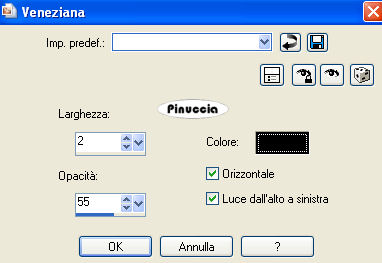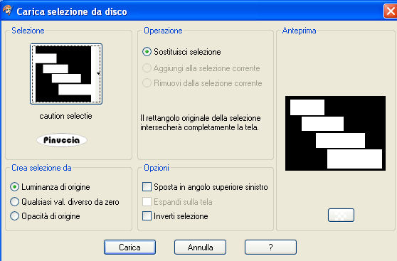 qui puoi trovare qualche risposta ai tuoi dubbi. Se l'argomento che ti interessa non è presente, ti prego di segnalarmelo. Questo tutorial è stato creato e tradotto con PSP X, ma può essere eseguito anche con le altre versioni di PSP. Occorrente: Materiale qui Metti la selezione nella cartella Selezioni. Apri il font e minimizzalo nella tua area di lavoro. Lo troverai nella lista dei font disponibili quando ti servirà. Apri una nuova immagine trasparente 600 x 450 pixels, e riempila con il colore nero.Selezione>Carica/Salva selezione>Carica selezione da disco. Cerca e carica la selezione "Caution": ![]() Apri l'immagine "Caution" (o un'immagine orizzontale a tua scelta) e vai a Modifica>Copia. Incolla come nuovo livello. Mantieni selezionato. Modifica>Copia. Premi sulla tastiera il tasto CANC ![]() Livelli>Nuovo livello raster. Modifica>Incoll anella selezione. Effetti>Effetti 3D>Sfalsa ombra, con i seguenti settaggi e con un colore chiaro scelto dall'immagine. ![]() Ripeti l'Effetto Sfalsa ombra, cambiando verticale e orizzontale con -1. Selezione>Deseleziona. Livelli>Duplica, e attiva il livello sottostante. Effetti>Effetti di distorsione>Vento, da destra - intensità 100. ![]() Regola>Messa a fuoco>Metti a fuoco. Effetti>Effetti di trama>Veneziana, colore nero. ![]() Attiva il livello Raster 2 (il livello con il viso). ![]() Effetti>Effetti di trama>Veneziana, con i settaggi precedenti. Cambia la modalità di miscelatura di questo livello in Luminanza, e abbassa l'opacità al 70%. Livelli>Unisci>Unisci tutto. Immagine>Aggiungi bordatura, 1 pixel, simmetriche, con un colore chiaro scelto dall'immagine. Modifica>Copia. Aggiungi bordatura, 25 pixels, simmetriche, con il colore nero. Seleziona questo bordo con la bacchetta magica ![]() Modifica>Incolla nella selezione. Selezione>Deseleziona. Effetti>Effetti di distorsione>Vento, con i settaggi precedenti. ![]() Ripeti l'Effetto Vento da sinistra: ![]() Regola>Messa a fuoco>Metti a fuoco. Livelli>Unisci>Unisci tutto. Apri il tube blokjes e vai a Modifica>Copia. Torna al tuo lavoro e vai a Modifica>Incolla come nuovo livello. Attiva lo strumento Testo , imposta il font fornito e scrivi un testo sull'immagine, senza dimenticare di aggiungere il tuo nome e/o il tuo watermark.Livelli>Unisci>Unisci tutto e salva in formato jpg. ![]() Se hai problemi o dubbi, o trovi un link non funzionante, o anche soltanto per un saluto, scrivimi 26 Febbraio 2009 |