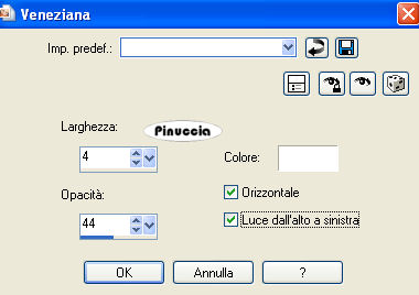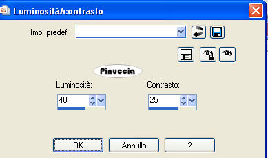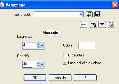 qui puoi trovare qualche risposta ai tuoi dubbi. Se l'argomento che ti interessa non è presente, ti prego di segnalarmelo. Questo tutorial è stato scritto con PSP 8, ma può essere eseguito anche con le altre versioni di PSP. Occorrente: Materiale qui Apri una nuova immagine trasparente 600 x 400 pixels. Imposta il colore di primo piano con #EFF5F4, e riempi l'immagine trasparente con questo colore.Apri il tube Moonlight e vai a Modifica>copia. Torna al tuo lavoro e vai a Modifica>Incolla>Incolla come nuovo livello. Abbassa l'opacità di questo livello al 60%. Apri il tube arch, e vai a Modifica>Copia. Torna al tuo lavoro e vai a Modifica>Incolla>Incolla come nuovo livello. Spostalo a sinistra.Livelli>Duplica. Immagine>Rifletti. Livelli>Unisci>Unisci giù. Apri il tube face, e vai a Modifica>Copia. Torna al tuo lavoro e vai a Modifica>Incolla>Incolla come nuovo livello. Sposta questo tube a destra.Cambia la modalità di miscelatura di questo livello in Luminanza (esistente). Regola>Luminosità e contrasto>Luminosità e contrasto: ![]() Livelli>Unisci>Unisci tutto. Imposta il colore di sfondo con un colore grigio preso dall'immagine. Passa il colore di primo piano a Gradiente, lineare, con i seguenti settaggi: ![]() Attiva lo strumento Bacchetta magica , sfumatura 40,e seleziona i quattro angoli della tag. ![]() Livelli>Nuovo livello raster. Riempi con il gradiente.Effetti>Effetti di trama>Veneziana: ![]() Effetti>Effetti 3D>Smusso a incasso. ![]() Livelli>Unisci>Unisci visibile. Apri il tube flowerring e vai a Modifica>Copia. Torna al tuo lavoro e vai a Modifica>Incolla>Incolla come nuovo livello. Spostalo il tube a sinistra.Immagine>Aggiungi bordatura, 15 pixels, simmetriche, con un colore scuro preso dall'immagine. Seleziona il bordo con la bacchetta magica , sfumatura 13.Riempi 3 volte con il gradiente.Effetti>Effetti di trama>Veneziana, con i precedenti settaggi, ma senza selezionare Orizzontale. ![]() Immagine>Aggiungi bordatura, 3 pixels, simmetriche, con il colore bianco. Seleziona il bordo con la bacchetta magica , sfumatura 0,e riempilo con un motivo argento.Regola>Messa a fuoco>Metti a fuoco, per tre volte. Aggiungi un testo a scelta e il tuo nome. Livelli>Unisci>Unisci tutto, e salva in formato jpg. ![]() ![]() Se hai problemi o dubbi, o trovi un link non funzionante, o anche soltanto per un saluto, scrivimi 25 Dicembre 2007 |