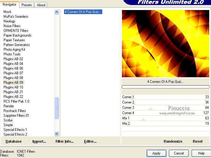 3. Effetti>Plugins>Filters Unlimited - Plugins AB 09 - 4Corners of a Pop Quiz, con i settaggi standard.