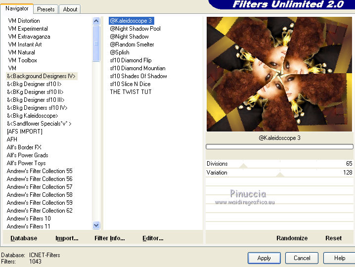 16. Effetti>Plugins>Filters Unlimited - Background DesignersIV - Kaleidoscope 3, con i settaggi standard.