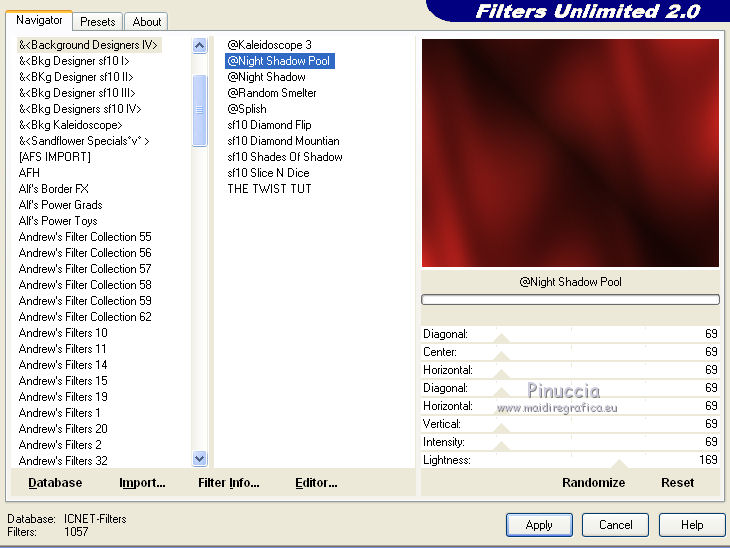 3. Effetti>Plugins>Filters Unlimited 2.0 - Background DesignersIV - Night shadow pool, con i settaggi standard.