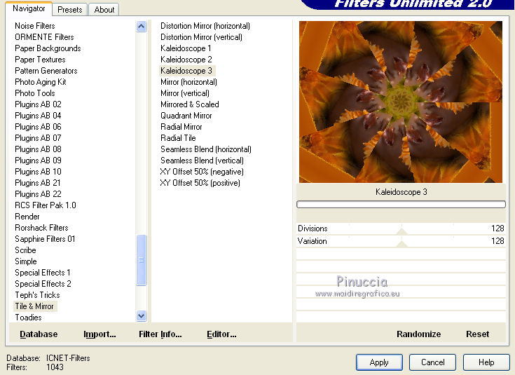 17. Effetti>Plugins>Filters Unlimited 2.0 - Tile and Mirror - Kaleidoscope 3, con i settaggi standard.
