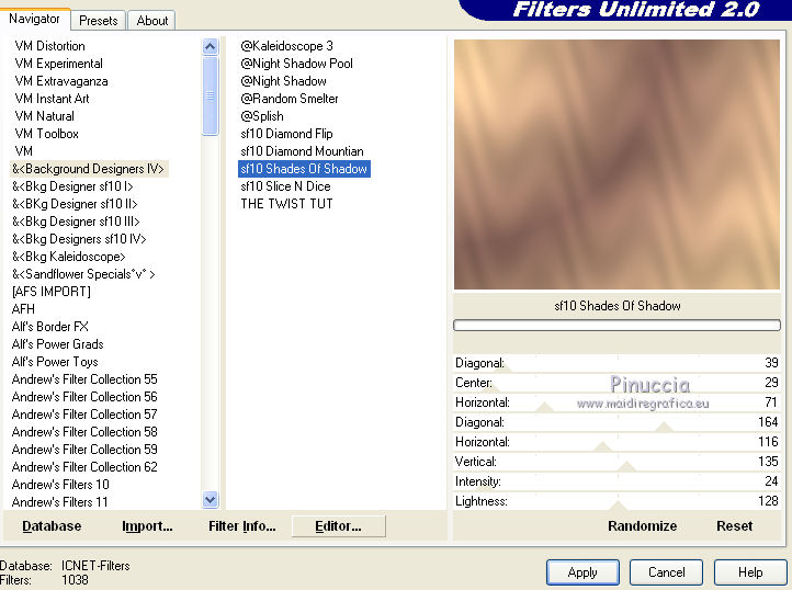 8. Effetti>Plugins>Filters Unlimited - Background Designers IV - sf10 Shades of shadows, con i settaggi standard.