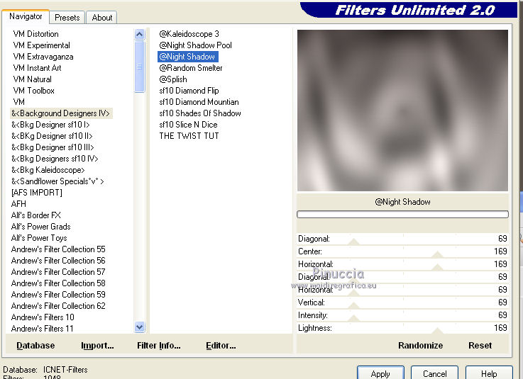 13. Effetti>Plugins>Filters Unlimited 2.0 - Background DesignerIV - Night Shadow, con i settaggi standard.