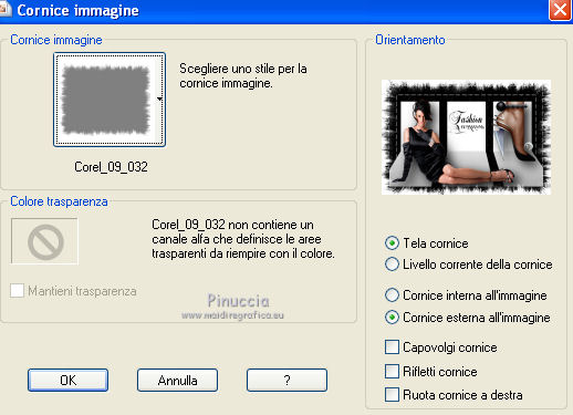 seleziona la cornice Corel_09_032 o Contorno design 01, con i seguenti settaggi.