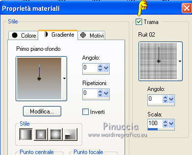 Apri la paletta del gradiente, seleziona Trama e imposta la trama Ruit02 con i seguenti settaggi.