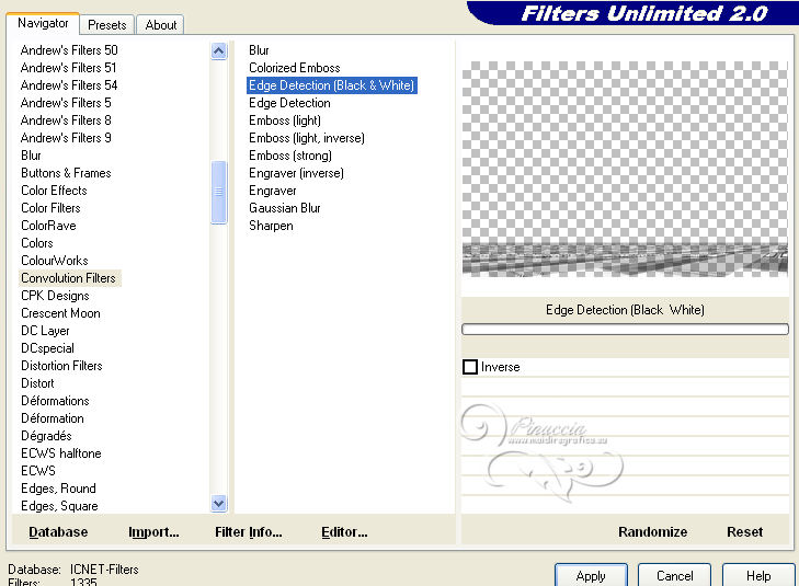 42. Effetti>Plugins>Filters Unlimited 2.0 – Convolution Filters – Edge Detection (Black & White).