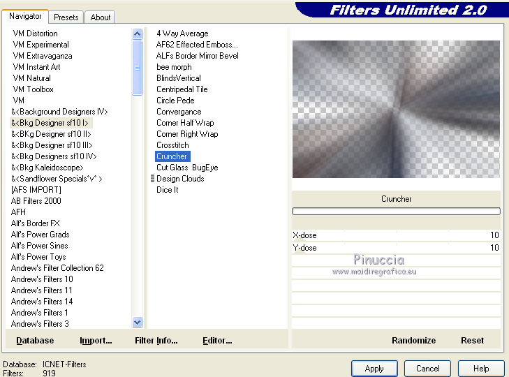 6. Effetti>Plugins>Filters Unlimited 2.0 - B&<BKG Designersf10I> - Cruncher.