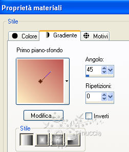 qui puoi trovare qualche risposta ai tuoi dubbi. Se l'argomento che ti interessa non è presente, ti prego di segnalarmelo. Questo tutorial è stato creato con PSP X2, ma può essere eseguito anche con le altre versioni di PSP. Per tradurlo, ho usato PSP X. Occorrente: Materiale qui Lascia intatto il nome del tube. Il © appartiene all'artista originale. Mantieni il credito a chi ha creato il tube. Filtri: FM Tile Tools qui Simple qui Penta.com qui Metti il pennello nella cartella Pennelli (se hai problemi con i pennelli, vedi alcuni appunti qui) 1. Apri una nuova immagine trasparente 650 x 500 pixels. 2. Imposta il colore di primo piano con #fff1c5, e il colore di sfondo con #bd5451. 3. Passa il colore di primo piano a Gradiente lineare: ![]() Riempi l'immagine trasparente con il gradiente.4. Effetti>Plugins>FM Tile Tools - Blend Emboss, con i settaggi standard. ![]() 5. Livelli>Nuovo livello raster. Selezione>Seleziona tutto. Apri il tube jung2_by_paci.psp e vai a Modifica>Copia. Torna al tuo lavoro e vai a Modifica>Incolla nella selezione. Selezione>Deseleziona. 6. Cambia la modalità di miscelatura di questo livello in Sovrapponi, e abbassa l'opacità al 75%. ![]() 7. Apri il tube WAGAR.png e vai a Modifica>Copia. Torna al tuo lavoro e vai a Modifica>Incolla come nuovo livello. Immagine>Ridimensiona, al 75%, tutti i livelli non selezionato. 8. Immagine>Rifletti. Cambia la modalità di miscelatura di questo livello in Differenza. Sposta il tube in basso a destra.9. Apri il tube VectorOrchids_11[1].03.05 e vai a Modifica>Copia. Torna al tuo lavoro e vai a Modifica>Incolla come nuovo livello. 10. Immagine>Rifletti. Sposta il tube in alto a sinistra.11. Livelli>Duplica - 2 volte, e disponi i tre tubes intrecciandoli.![]() 12. Quando hai finito, chiudi tutti i livelli tranne i tre livelli di questo tube. Livelli>Unisci>Unisci visibile. Cambia la modalità di miscelatura di questo livello in Rafforza. 13. Livelli>Visualizza>Tutto, rimanendo posizionato sul livello Uniti. 14. Apri il tube BB-1.psp e vai a Modifica>Copia. Torna al tuo lavoro e vai a Modifica>Incolla come nuovo livello. Immagine>Ridimensiona, all'80%, tutti i livelli non selezionato. 15. Sposta il tube a sinistra.16. Effetti>Effetti 3D>Sfalsa ombra. ![]() 17. Riporta il colore di primo piano a Colore. 18. Livelli>Nuovo livello raster. Attiva lo strumento Pennello ![]() cerca e seleziona il pennello "always", dimensione 300, e applicalo in alto a destra, cliccando con il tasto sinistro del mouse per usare il colore di primo piano. 19. Effetti>Effetti 3D>Sfalsa ombra, con i settaggi precedenti. ![]() 20. Aggiungi il tuo nome e/o il tuo watermark su un nuovo livello. 21.Immagine>Aggiungi bordatura, 2 pixels, simmetriche, con il colore di sfondo. Immagine>Aggiungi bordatura, 2 pixels, simmetriche, con il colore di primo piano. 22. Immagine>Aggiungi bordatura, simmetriche non selezionato, con il colore bianco e i seguenti settaggi. ![]() 23. Seleziona il bordo bianco con la bacchetta magica ![]() Riporta il colore di primo piano a Gradiente, con i settaggi precedenti, e riempi la selezione con questo gradiente.24. Effetti>Plugins>Simple - Quick Tile. Effetti>Plugins>Penta.com - Dot and Cross, con i settaggi standard. ![]() Selezione>Deseleziona. 25. Apri tube338 e vai a Modifica>Copia. Torna al tuo lavoro e vai a Modifica>Incolla come nuovo livello. 26. Immagine>Ridimensiona, all'85%, tutti i livelli non selezionato. 27. Sposta il tube in basso a destra.Effetti>Effetti 3D>Sfalsa ombra, con i settaggi precedenti. ![]() Regola>Messa a fuoco>Metti a fuoco. 28. Immagine>Aggiungi bordatura, 2 pixels, simmetriche, con il colore di sfondo. Immagine>Ridimensiona, a 650 pixels di larghezza, tutti i livelli selezionato. Hai finito. Puoi salvare in formato jpg. ![]() Se hai problemi o dubbi, o trovi un link non funzionante, o anche soltanto per un saluto, scrivimi.