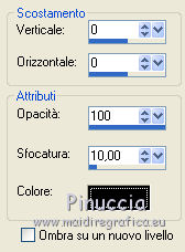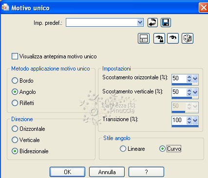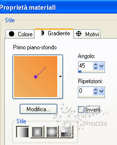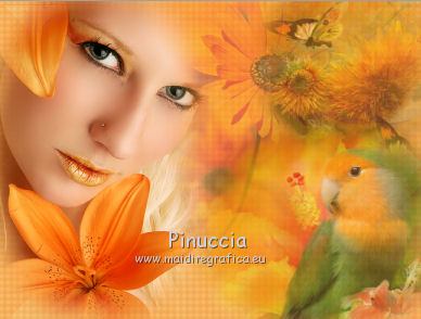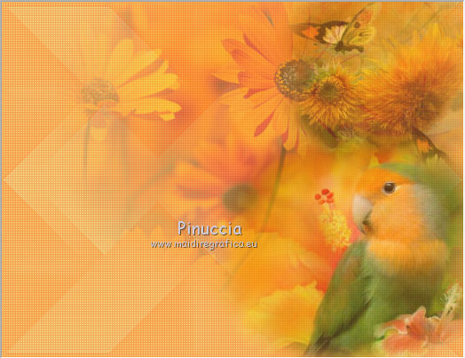 qui puoi trovare qualche risposta ai tuoi dubbi. Se l'argomento che ti interessa non è presente, ti prego di segnalarmelo. Questo tutorial è stato creato con PSP X2, ma può essere eseguito anche con le altre versioni di PSP. Per tradurlo, ho usato PSP X. Occorrente: Materiale qui I tubes sono di Devilinside, Nikita. Grazie a tutti i creatori di tubes per le loro immagini. Lascia intatto il nome del tube. Il © appartiene all'artista originale. Mantieni il credito di chi ha creato il tube. Filtri: Simple qui Penta.com - Dot and Cross qui Penta.com - Color dot qui 1. Imposta il colore di primo piano con #ecb366, e il colore di sfondo con #f68a32. 2. Passa il colore di primo piano a Gradiente lineare. ![]() 3. Apri una nuova immagine trasparente 650 x 500 pixels. e riempila con il gradiente.4. Effetti>Plugins>Simple - diamonds. 5. Livelli>Duplica. 6. Effetti>Effetti di immagine>Motivo unico. ![]() Abbassa l'opacità di questo livello al 50%. 7. Livelli>Unisci>Unisci visibile. 8. Effetti>Effetti di bordo>Aumenta. 9. Effetti>Effetti di immagine>Motivo unico, con i settaggi precedenti. 10. Effetti>Plugins>Simple - Offset by 3. 11. Effetti>Plugins>Simple - Pizza slice mirror. 12. Effetti>Plugins>Penta.com - Color Dot, con i settaggi standard. ![]() 13. Apri il tube 12206401525-fleurs e vai a Modifica>Copia. Torna al tuo lavoro e vai a Modifica>Incolla come nuovo livello. sposta il tube un po' più in alto.14. Abbassa l'opacità di questo livello al 46%. 15. Apri il tube Devilinside-340 e vai a Modifica>Copia. Torna al tuo secondo lavoro e vai a Modifica>Incolla come nuovo livello. 16. Immagine>Ridimensiona, al 65%, tutti i livelli non selezionato. Spostalo in alto a destra.17. Abbassa l'opacità di questo livello al 55%. 18. Apri il tube Devilinside-341 e vai a Modifica>Copia. Torna al tuo lavoro e vai a Modifica>Incolla come nuovo livello. 19. Immagine>Ridimensiona, al 75%, tutti i livelli non selezionato. Spostalo in basso a destra.20. Abbassa l'opacità di questo livello al 69%. ![]() 21. Apri il tube Devilinside-Exclusiv-36 e vai a Modifica>Copia. Torna al tuo lavoro e vai a Modifica>Incolla come nuovo livello. 22. Immagine>Ridimensiona, all'80%, tutti i livelli non selezionato. Spostalo a sinistra.![]() 23. Aggiungi il tuo nome e/o il tuo watermark su un nuovo livello. 24. Immagine>Aggiungi bordatura, 31 pixels, simmetriche, con il colore di sfondo. 25. Selezione>Seleziona tutto. Selezione>Modifica>Contrai - 30 pixels. Selezione>Inverti. 26. Effetti>Plugins>Simple - Diamonds. Mantieni selezionato. 27. Effetti>Effetti di distorsione>Vento - da sinistra - intensità 100. ![]() Ripeti l'Effetto Vento, ma questa volta da destra. ![]() Mantieni ancora selezionato. 28. Effetti>Plugins>Penta.com - Dot and Cross, con i settaggi standard. ![]() Selezione>Inverti. 29. Effetti>Effetti 3D>Sfalsa ombra, con il colore nero. ![]() Selezione>Deseleziona. 30. Immagine>Aggiungi bordatura, 1 pixel, simmetriche, con il colore di sfondo. 31. Immagine>Ridimensiona, a 650 pixels di larghezza. 32. Regola>Messa a fuoco>Maschera di contrasto. ![]() 33. Salva in formato jpg. ![]() Se hai problemi o dubbi, o trovi un link non funzionante, o anche soltanto per un saluto, scrivimi.