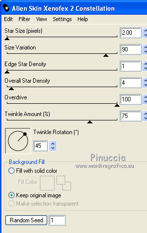 Effetti>Plugins>Alien Skin Xenofex 2.0 - Constellation, con i settaggi precedenti, ma clicca una volta su Random Seed.
