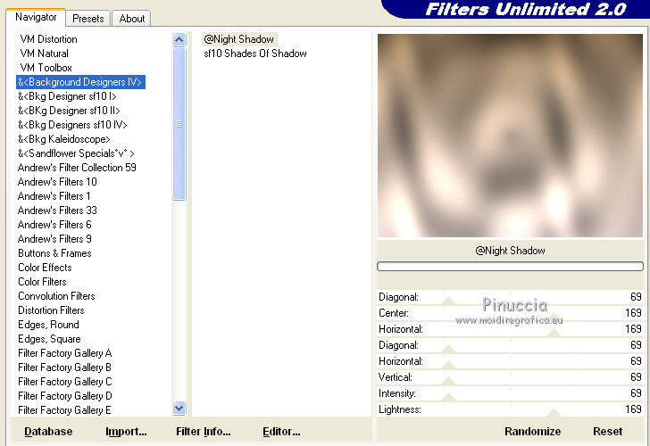 14. Effetti>Plugins>Filters Unlimited - Background designer IV - Night Shadow, con i settaggi standard.