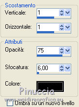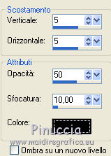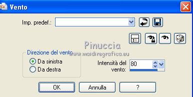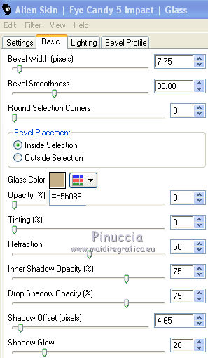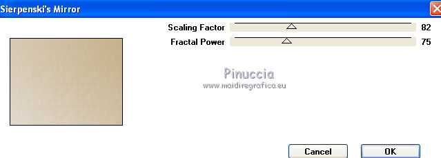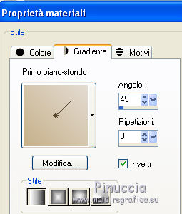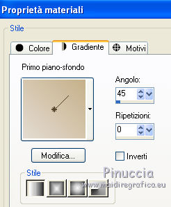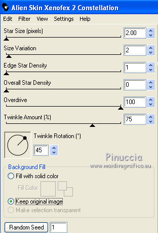 qui puoi trovare qualche risposta ai tuoi dubbi. Se l'argomento che ti interessa non è presente, ti prego di segnalarmelo. Questo tutorial è stato creato con PSP X2, ma può essere eseguito anche con le altre versioni di PSP. Per tradurlo, ho usato PSP X. Occorrente: Materiale qui I tubes sono di Susse Luz e Fafy. Filtri: Funhouse2 qui Alien Skin Eye Candy 5 Impact qui Alien Skin Xenofex 2.0 - Constellation qui Ti servirà anche Animation Shop qui ![]() 1. Apri una nuova immagine trasparente 650 x 500 pixels. 2. Imposta il colore di primo piano con #e4dcd2, e il colore di sfondo con #c5b089. 3. Passa il colore di primo piano a Gradiente lineare. ![]() 4. Riempi l'immagine trasparente con il gradiente.Effetti>Plugins>Funhouse - Sierpenski mirror: ![]() 5. Selezione>Seleziona tutto. Livelli>Nuovo livello raster. 6. Apri il tube "krw_797" e vai a Modifica>copia. Torna al tuo lavoro e vai a Modifica>Incolla nella selezione. Selezione>Deseleziona. Abbassa l'opacità di questo livello all'85%. 7. Apri il tube "N_37_SL" e vai a Modifica>copia. Torna al tuo lavoro e vai a Modifica>Incolla come nuovo livello. Immagine>Ridimensiona, all'80%, tutti i livelli non selezionato. Sposta il tube a destra.8. Effetti>Effetti 3D>Sfalsa ombra, con il colore nero. ![]() 9. Apri il tube FNOEL.5 e vai a Modifica>copia. Torna al tuo lavoro e vai a Modifica>Incolla come nuovo livello. Immagine>Ridimensiona, all'85%, tutti i livelli non selezionato. Immagine>Rifletti. Sposta il tube a sinistra.10. Livelli>Duplica. Effetti>Effetti di distorsione>Vento - da sinistra, intensità 80. ![]() 11. Regola>Sfocatura>Sfocatura radiale. ![]() Cambia la modalità di miscelatura di questo livello in Filtra. Livelli>Disponi>Sposta giù. 12. Attiva il livello superiore (il livello originale del tube). Effetti>Effetti 3D>Sfalsa ombra, con il colore nero. ![]() 13. Apri il tube SE_wordart e vai a Modifica>copia. Torna al tuo lavoro e vai a Modifica>Incolla come nuovo livello. Immagine>Ridimensiona, al 65%, tutti i livelli non selezionato. Sposta il testo in alto al centro.14. Effetti>Effetti 3D>Sfalsa ombra, con il colore nero. ![]() 15. Aggiungi il tuo nome e/o il tuo watermark su un nuovo livello. 16. Immagine>aggiungi bordatura, 25 pixels, simmetriche, con il colore di primo piano. Seleziona questo bordo con la bacchetta magica , antialias non selezionato.Cambia i settaggi del gradiente, selezionando Inverti. ![]() Riempi il bordo con il gradiente.Mantieni selezionato. 17. Apri doodle1 e vai a Modifica>copia. Torna al tuo lavoro e vai a Modifica>Incolla come nuovo livello. Sposta il tube in basso a sinistra.![]() Selezione>Inverti. Premi sulla tastiera il tasto CANC. 18. Attiva nuovamente doodle1. Immagine>Rifletti. Modifica>copia. Torna al tuo lavoro e vai a Modifica>Incolla come nuovo livello. Spostalo in alto a destra.![]() Premi sulla tastiera il tasto CANC. Selezione>Inverti. 19. Effetti>Plugins>Alien skin Eye Candy 5 Impact - Glass: ![]() Selezione>Deseleziona. 20. Livelli>Unisci>Unisci tutto. 21. Immagine>Ridimensiona, a 650 pixels di larghezza, tutti i livelli selezionato. 22. Regola>Messa a fuoco>Maschera di contrasto. ![]() 23. Effetti>Plugins>Alien Skin Xenofex 2.0 - Constellation. ![]() Modifica>Copia. Apri Animation Shop e vai a Modifica>Incolla>Incolla come nuova animazione. Torna in PSP. Modifica>Annulla azione Constellation. Ripeti l'Effetto Constellation, cambiando il settaggio di Star Size. ![]() Modifica>Copia. Torna in Animation Shop e vai a Modifica>Incolla>Incolla dopo il fotogramma corrente. Modifica>Seleziona tutto. Animazione>Proprietà fotogramma, e imposta la velocità a 20. ![]() Controlla il risultato cliccando su Visualizza e salva in formato gif.