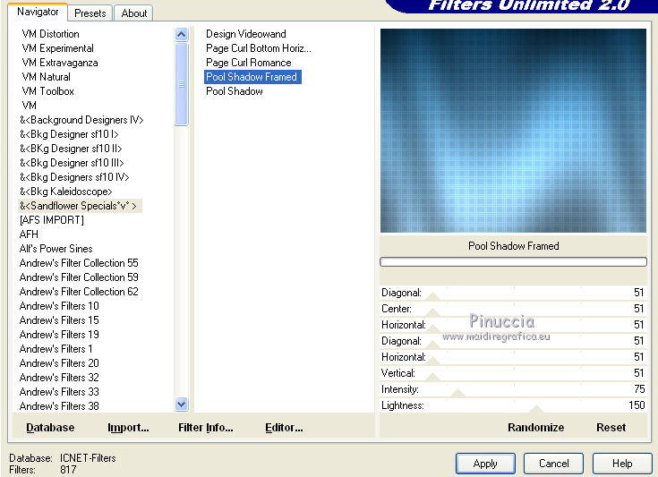 4. Effetti>Plugins>Filters Unlimited - Sandflowers special V - Pool shadow framed, con i settaggi standard.