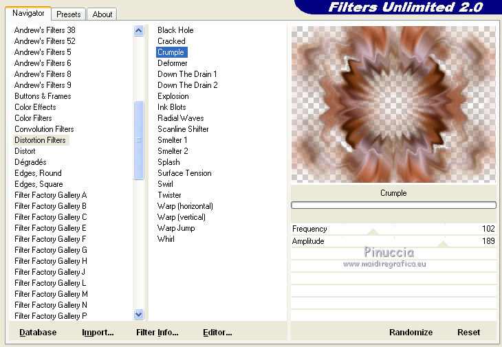 9. Effetti>Plugins>Filters Unlimited - Distortion Filters - Crumple, con i settaggi standard.