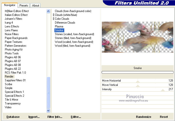 6. Effetti>Plugins>Filters Unlimited 2.0 - Render - Smoke, con i settaggi standard.