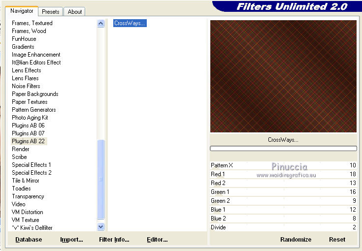 17. Effetti>Plugins>Filters Unlimited 2.0 - Plugins AB 22 - Crossways, con i settaggi standard.