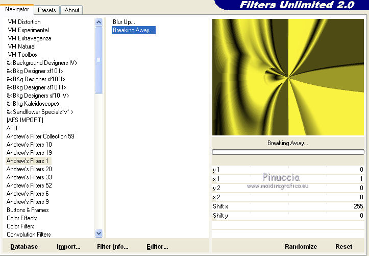5. Effetti>Plugins>Filters Unlimited - Andrew's Filter 1 - Breaking away.
