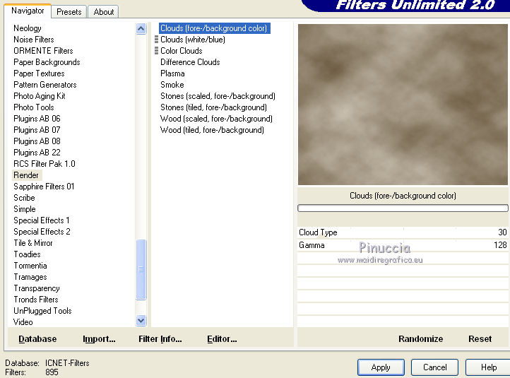 Effetti>Plugins>Filters Unlimited 2.0 - Render - Cloud(fore/background color).