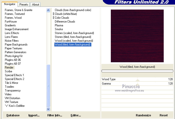 13. Effetti>Plugins>Filters Unlimited 2.0 - Render - Wood(tiled,fore-/background), con i settaggi standard.