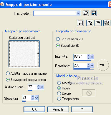 6. Effetti>Effetti di distorsione>Mappa di posizionamento - seleziona la trama Carta con contrasti, con i seguenti settaggi.