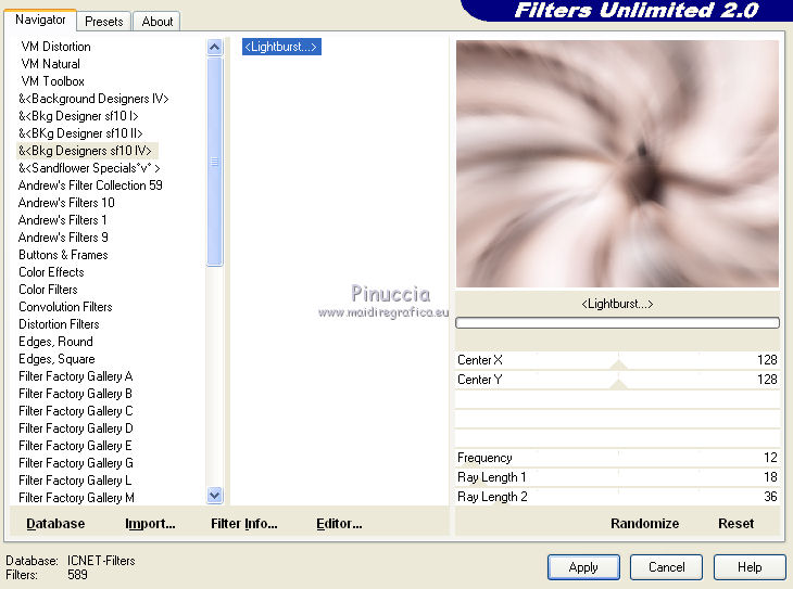 8. Effetti>Plugins>Filters Unlimited - &<Bkg Designer sf10IV> - Lightburst, con i settaggi standard.